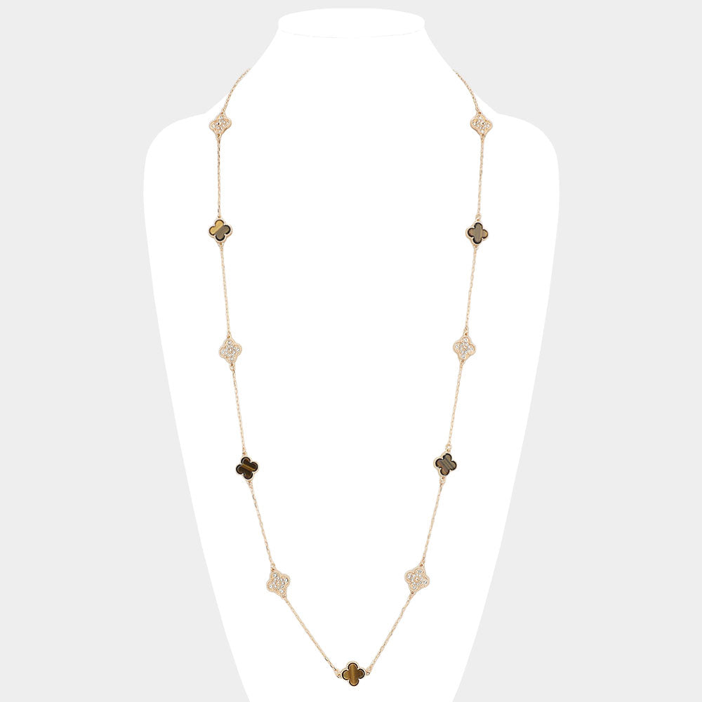Elevate your style with our 14K GOLD PLATED 36 INCH long necklace featuring a double-sided clover pendant embellished with multicolor stones. Made with care and precision, this necklace adds elegance and versatility to any outfit. It's the perfect accessory for any occasion.