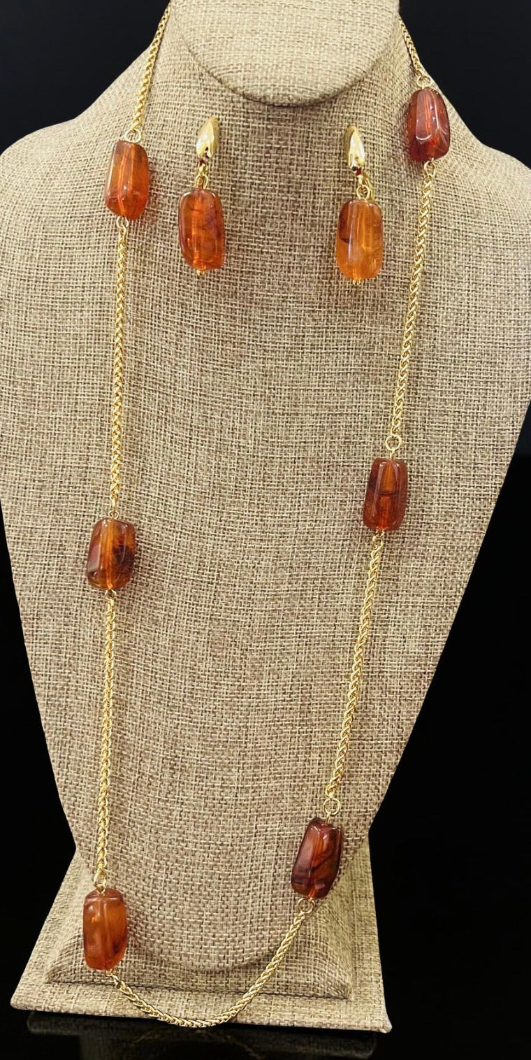 Turn heads with the timeless beauty of our Amber Luxe Necklace/Earrings Set, featuring rich amber-toned stones linked on a sleek gold chain. The long, layered design adds effortless elegance, while the matching drop earrings complete the sophisticated look. Perfect for both casual and evening wear, this set brings a warm, luxurious glow to any outfit. Details: Set includes necklace and earrings Gold-plated chain with amber-inspired resin stones Non tarnish  Lightweight and elegant Length: approx. 30 inches