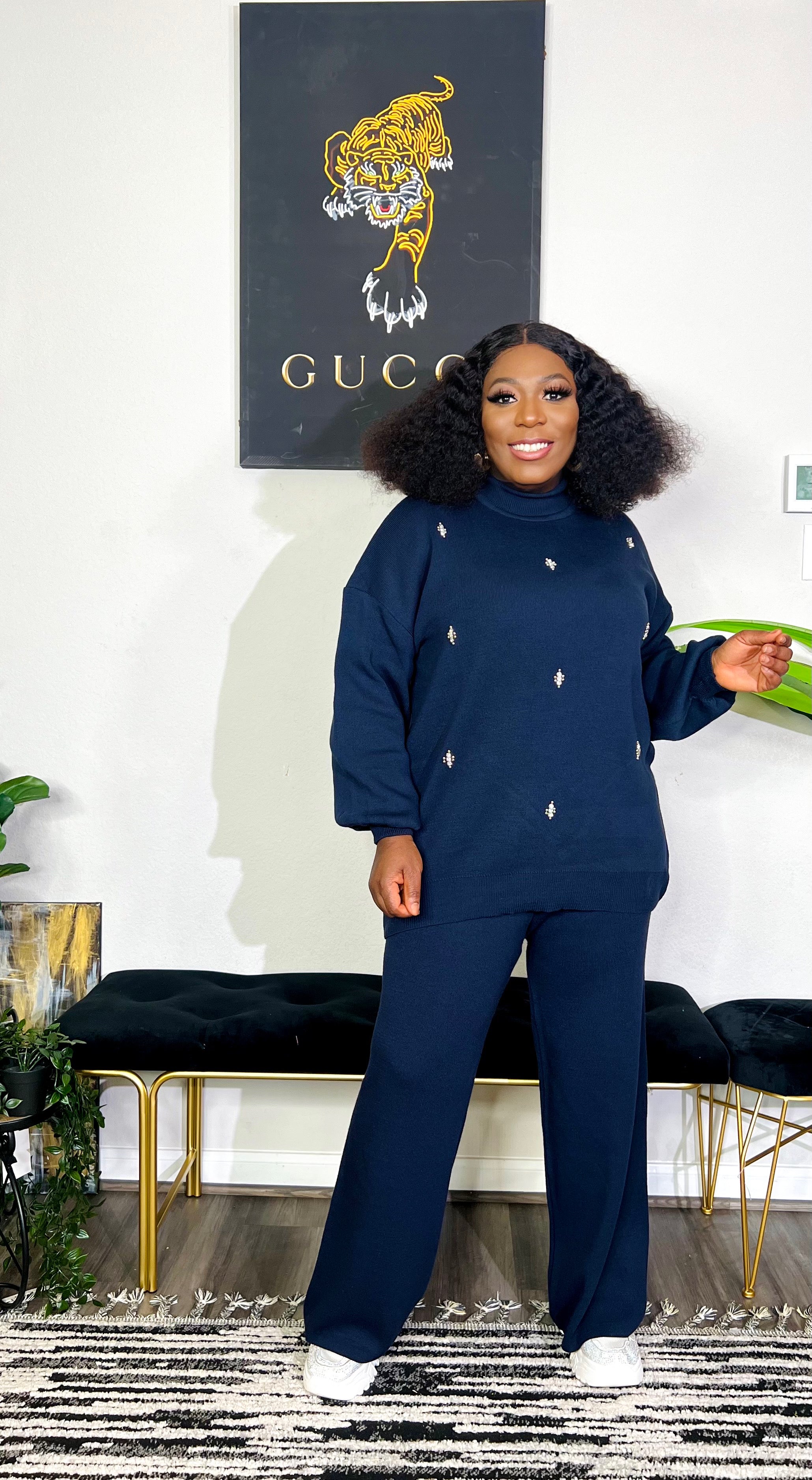 Elevate your winter wardrobe with our Ariana Silver Embellished 2pc Knit Puff Sleeve Sweater Set. The stunning silver embellishments and cozy knit fabric will keep you both stylish and warm. The puff sleeves add a touch of charm to this navy blue set. Perfect for any occasion, this set is a must-have for any fashion-forward individual.   model is 5”6 180lb wearing one size