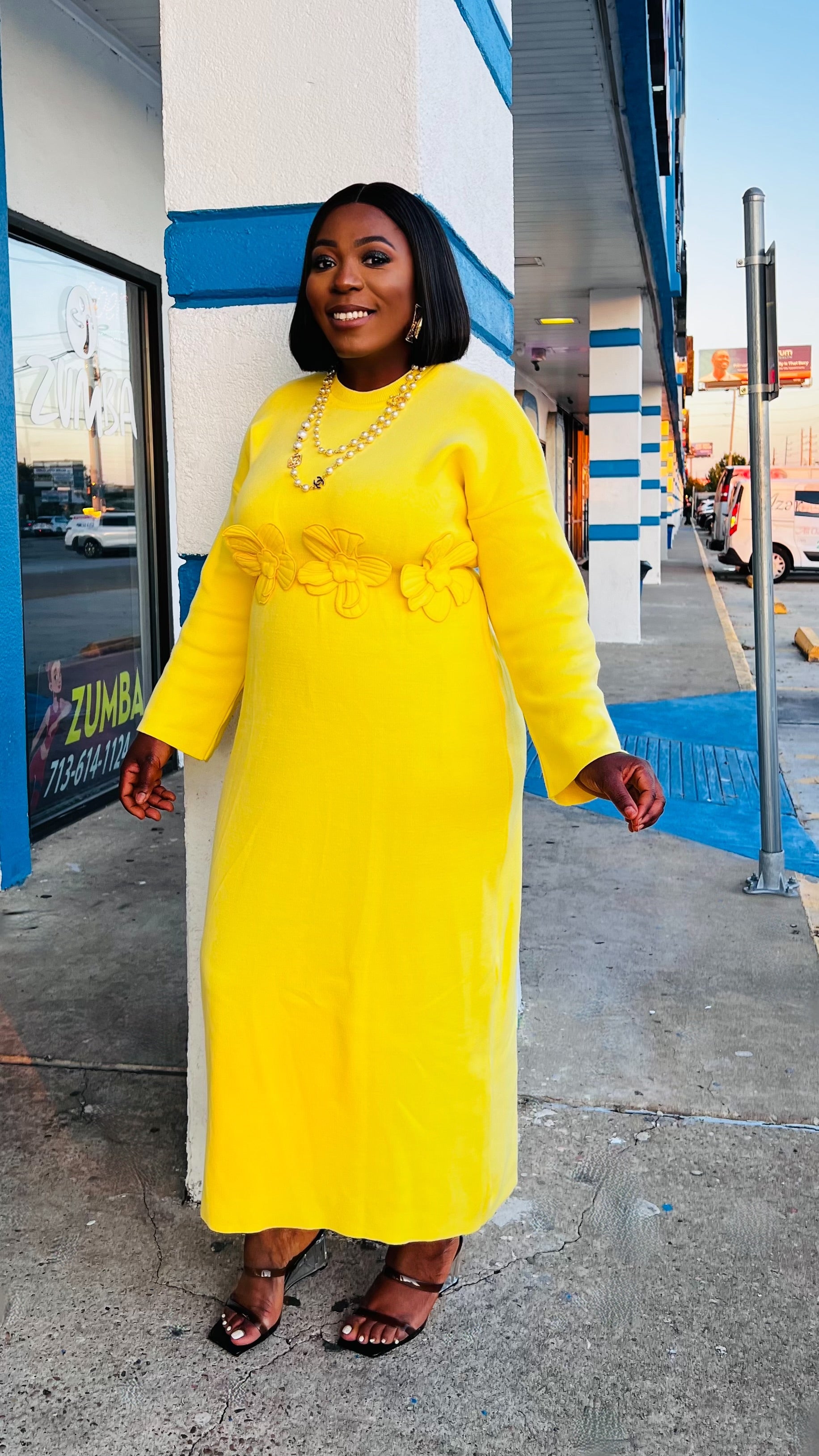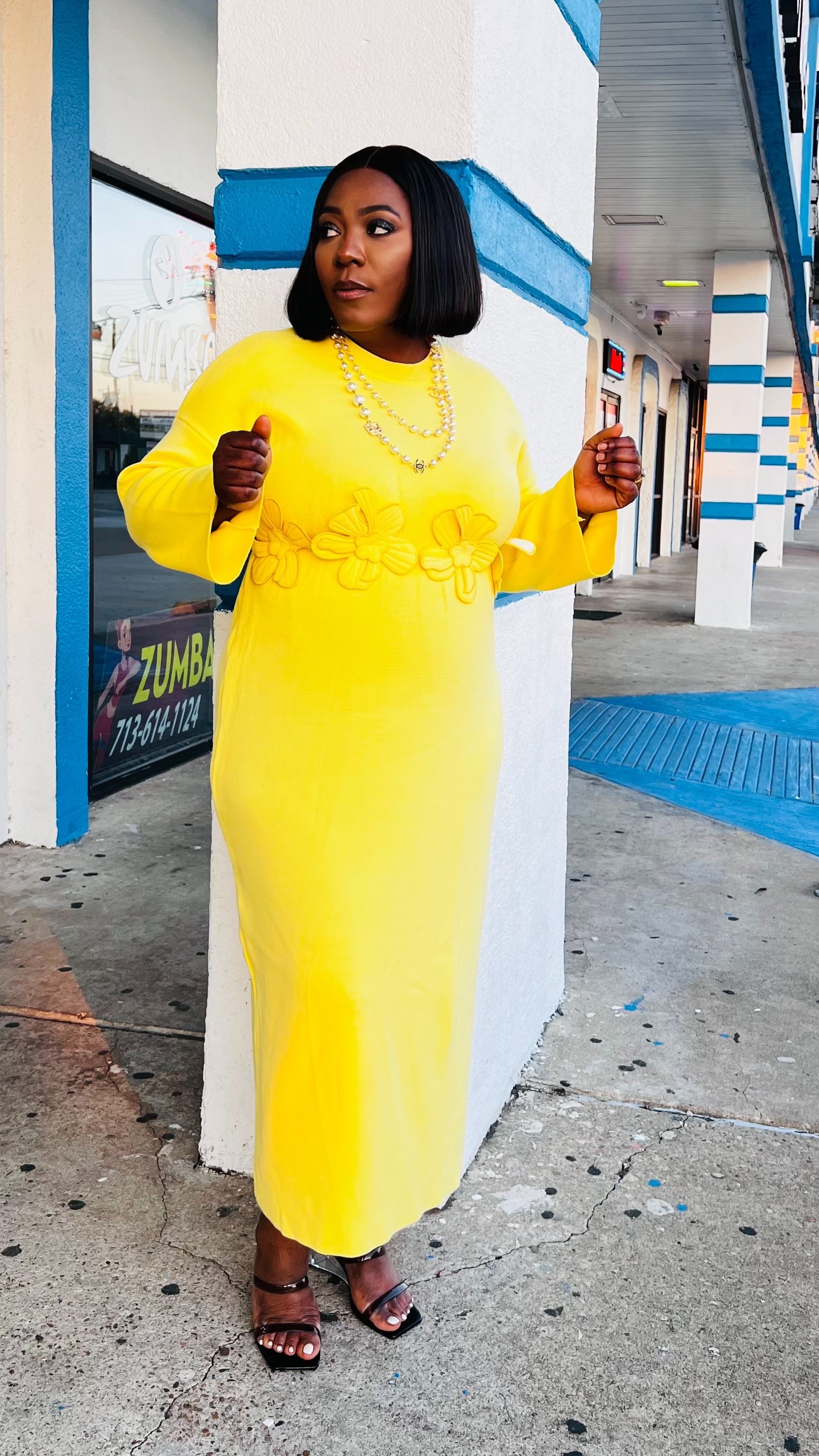 BLOOM SCULPT 3D FLOWER CINCH-BACK SWEATER DRESS (Yellow)