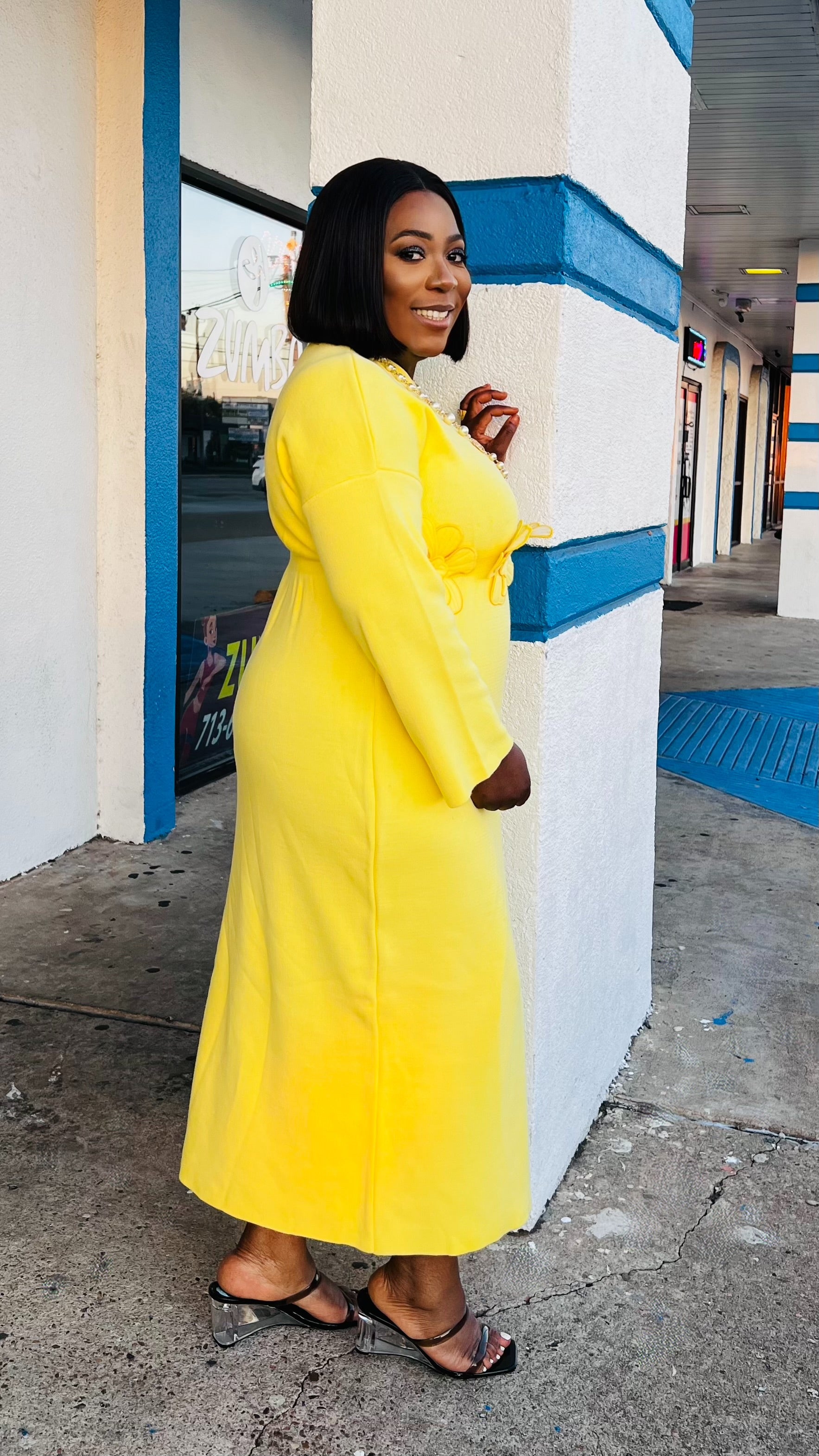 Radiate confidence in the Bloom Sculpt Cinch-Back Maxi Dress, designed with a vibrant yellow hue that instantly brightens any room. The signature 3D floral waist detailing adds sculpted definition, while the cinched-back design subtly shapes your silhouette for an elegant, feminine finish. Flowing sleeves and a sleek maxi length complete this statement look—perfect for celebrations, brunches, and picture-perfect moments.