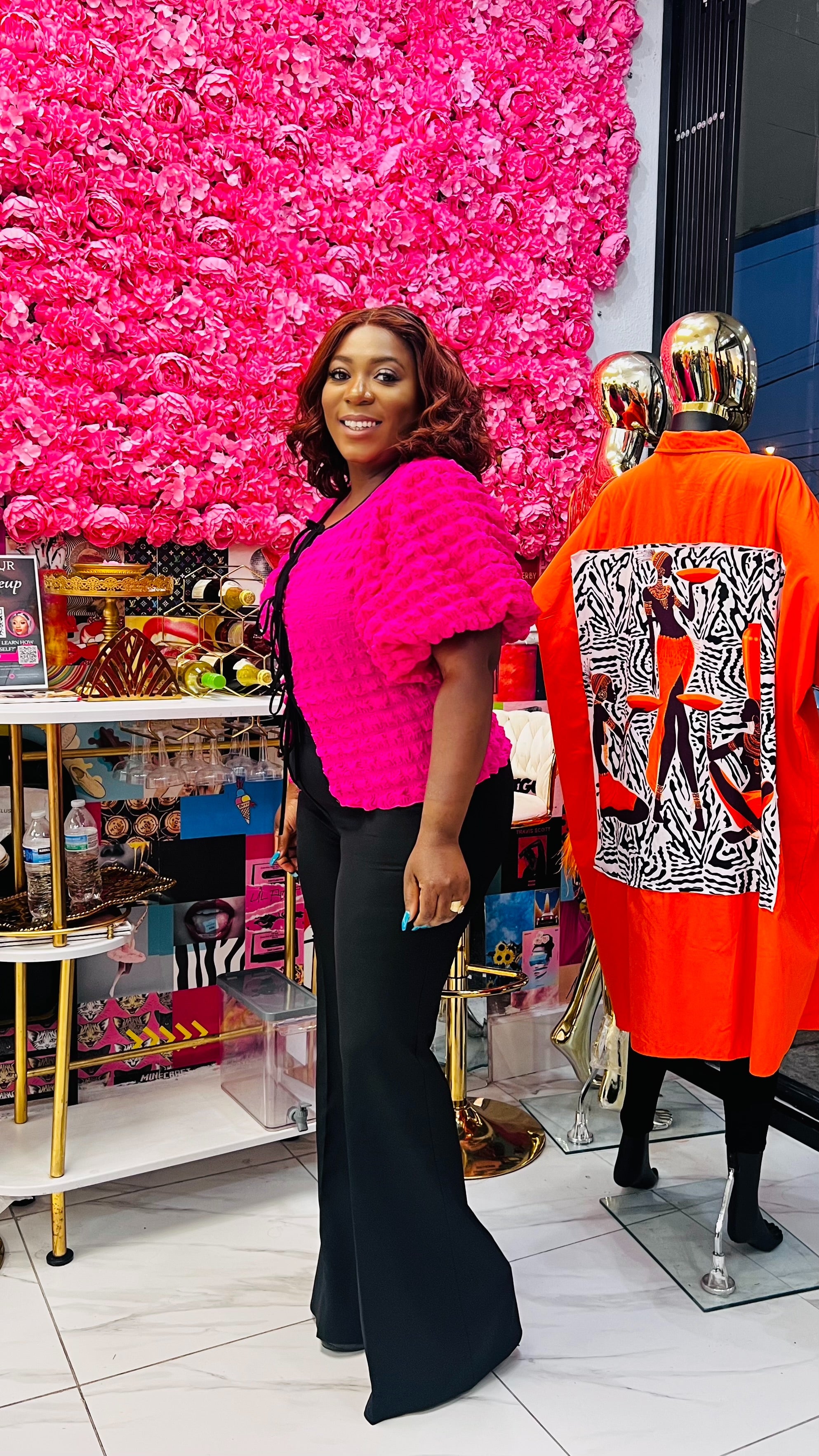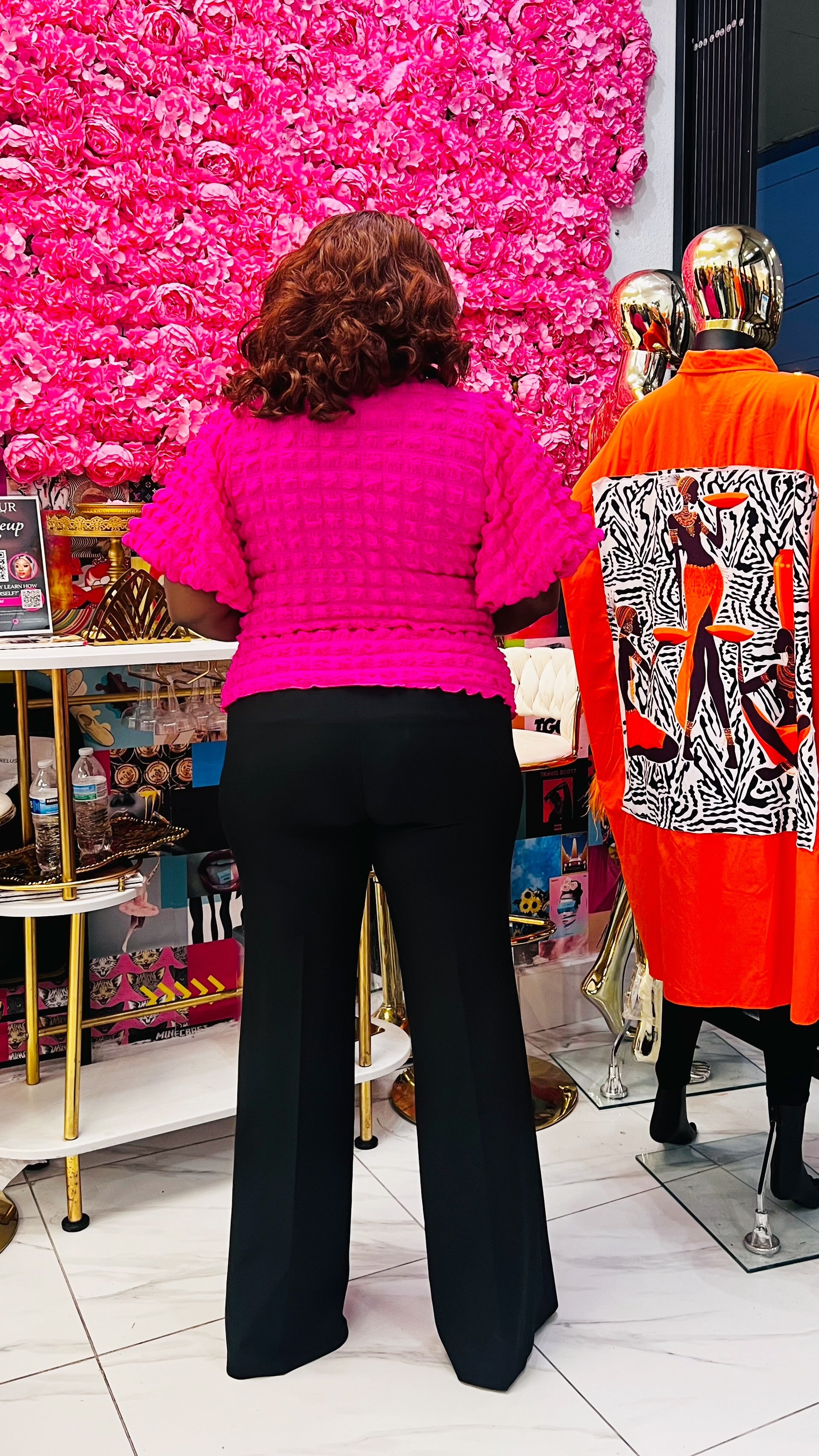 Bloom vibrant hot pink textured short-sleeve blouse with a waffle or bubble-knit pattern that gives it a chic, dimensional look. It features a front-tie closure with black ribbon detailing, adding a bold contrast and a touch of sophistication. The sleeves are slightly puffed and loose-fitting, giving a feminine and stylish silhouette. It’s a statement piece — perfect for pairing with high-waisted pants or skirts for a fashionable, confident, and modern look. Model is 5”6 wearing size Large  paired with our best seller “Miss Professional Structured Pants