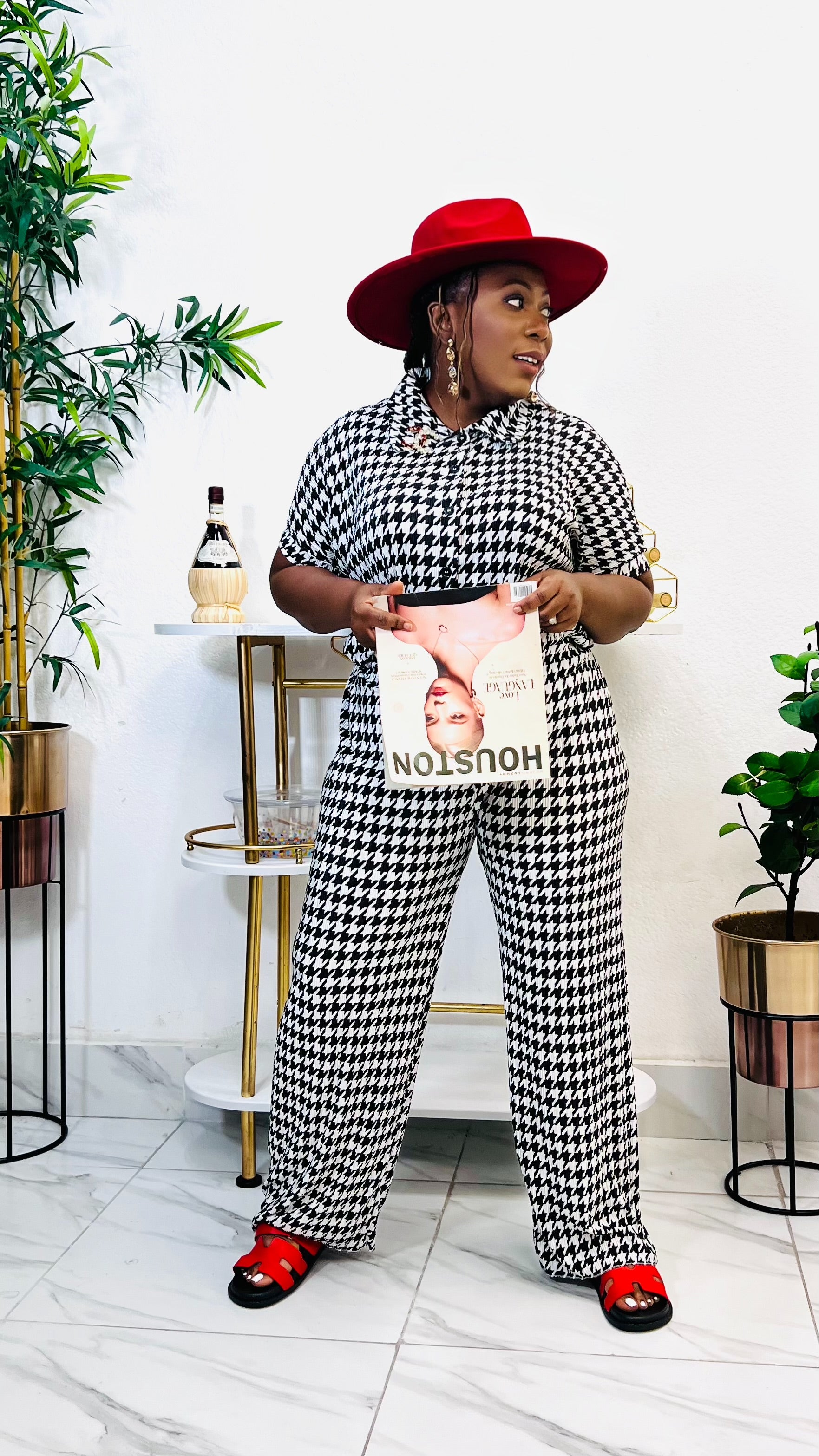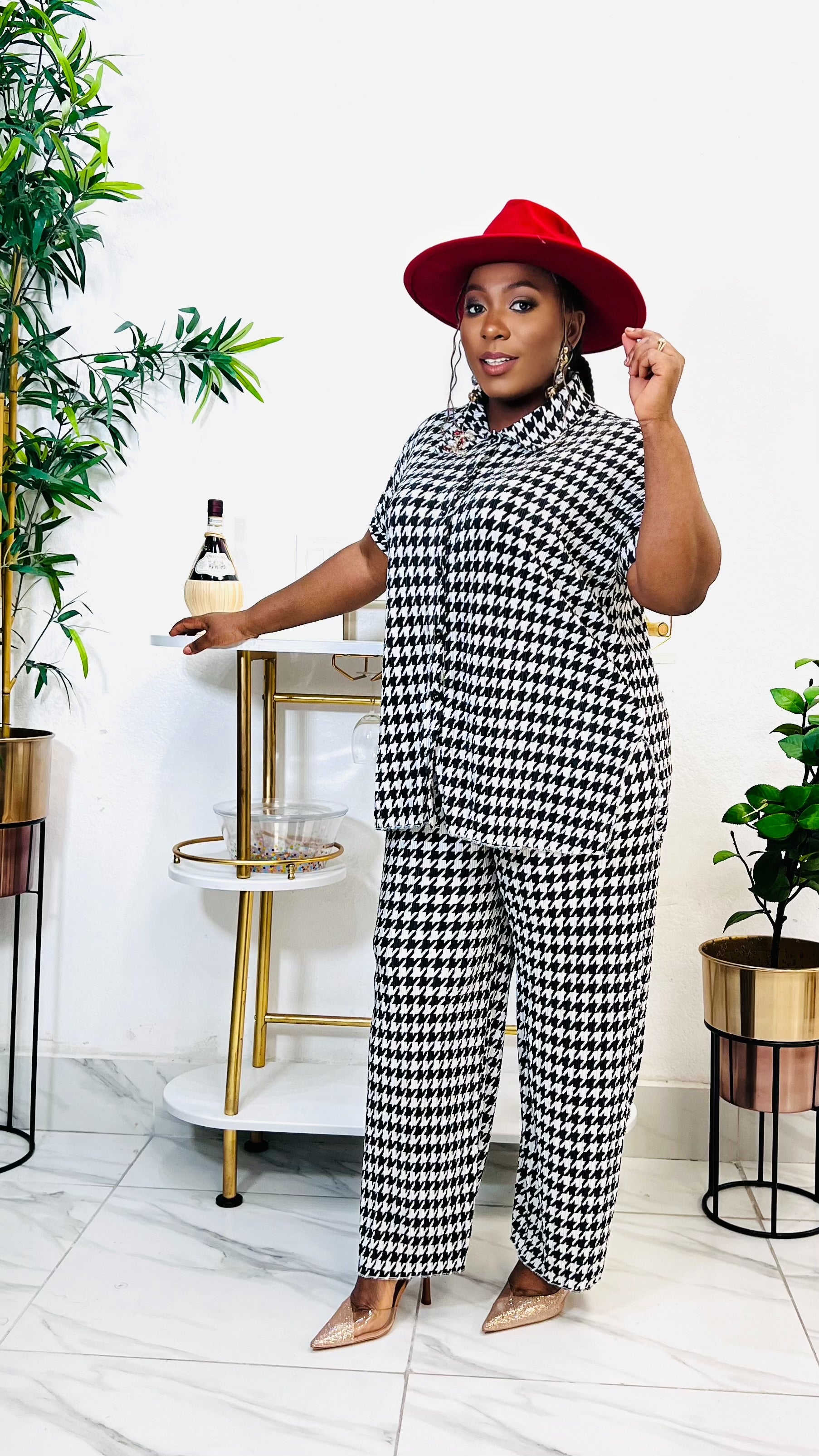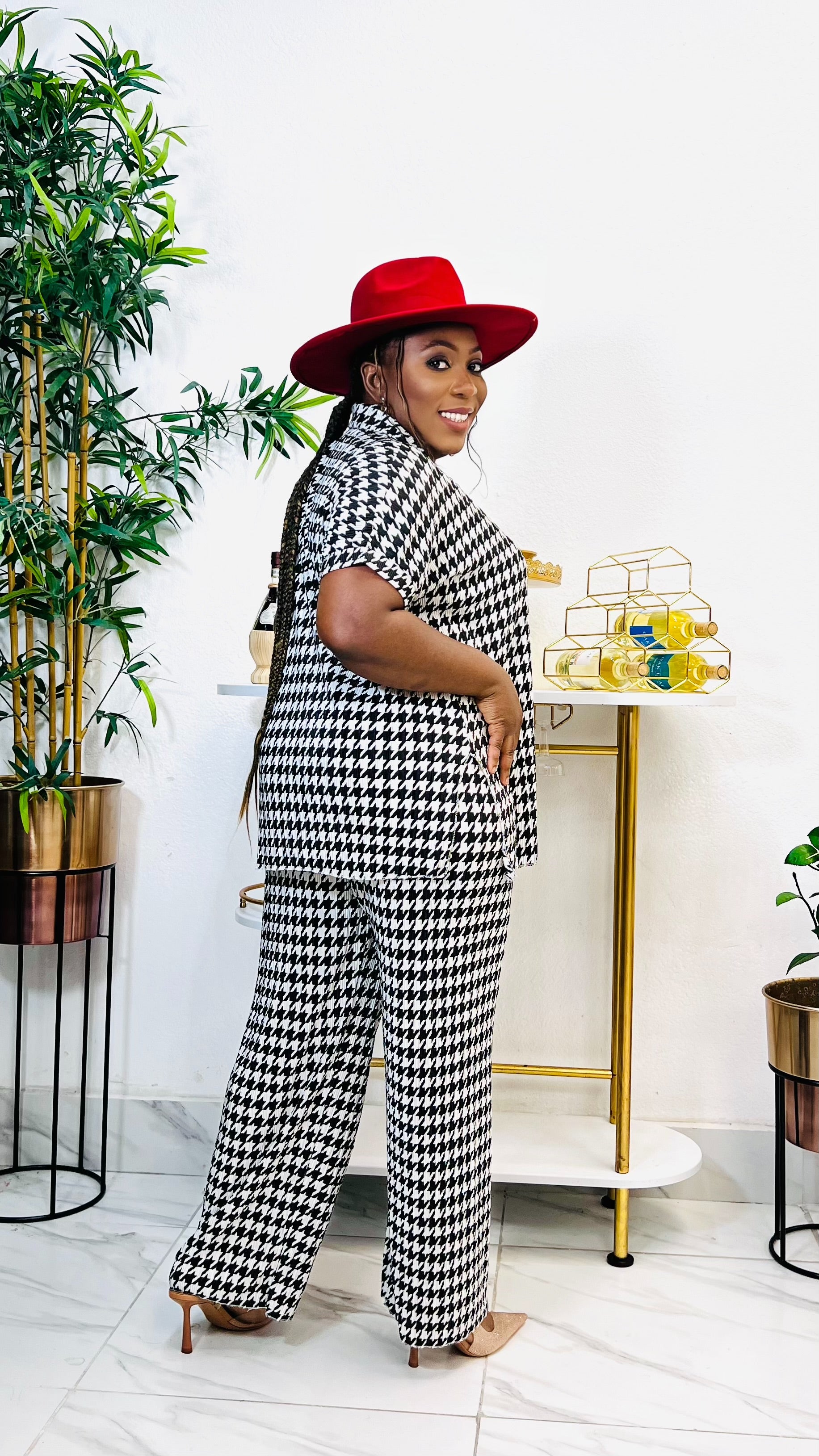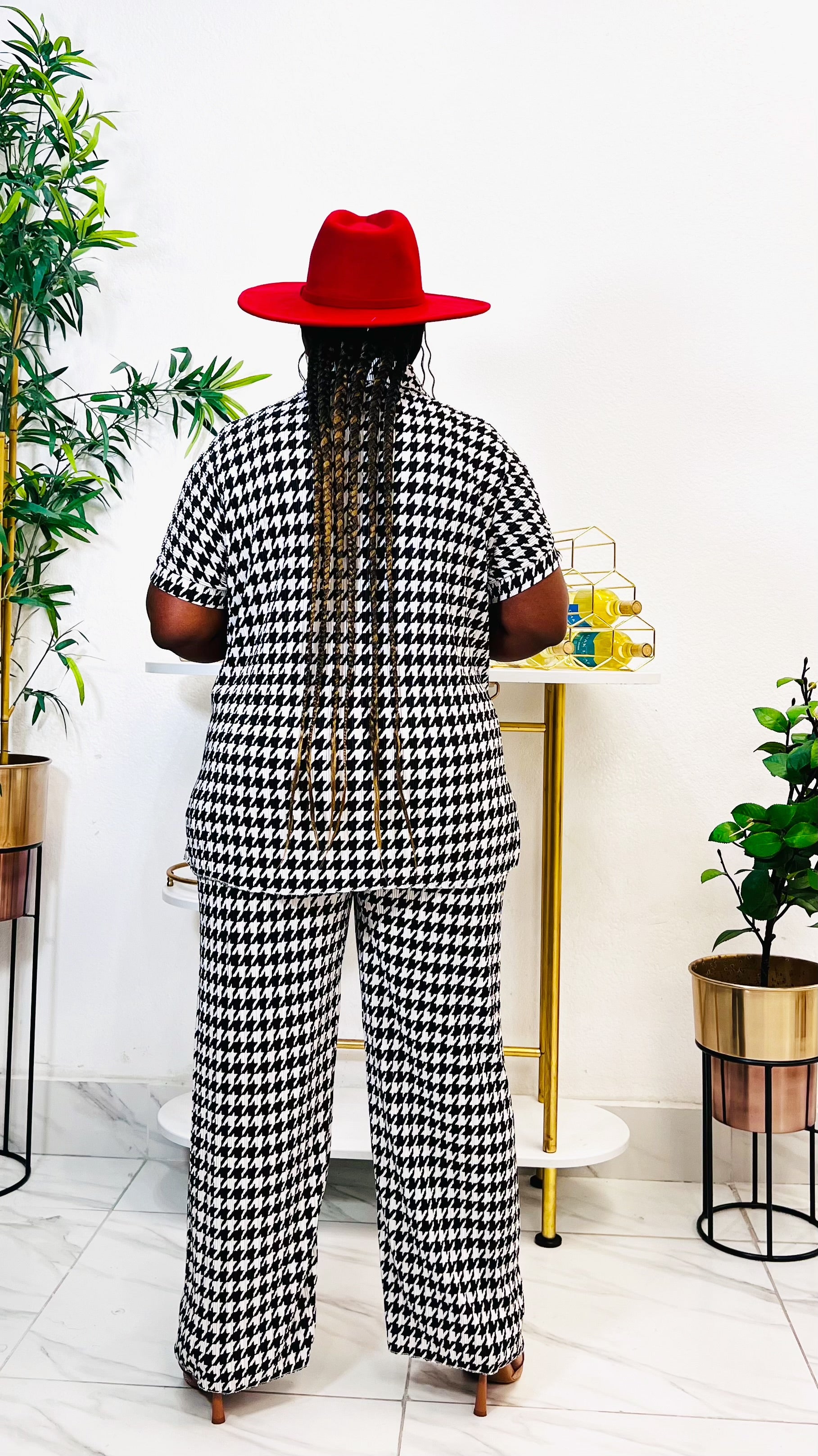 This stylish two-piece set includes a houndstooth pleated plisse top with a classic pointed collar and button-up design. Paired with the stretchy pants featuring an elastic waistband, this set offers both comfort and sophistication. Perfect for a chic and effortless look. 95% Polyester 5% SpandexSize + FitLength: 28"Sleeve Length: 7”Inseam: 32” Model is 5”6 wearing one size , 36DD Burst