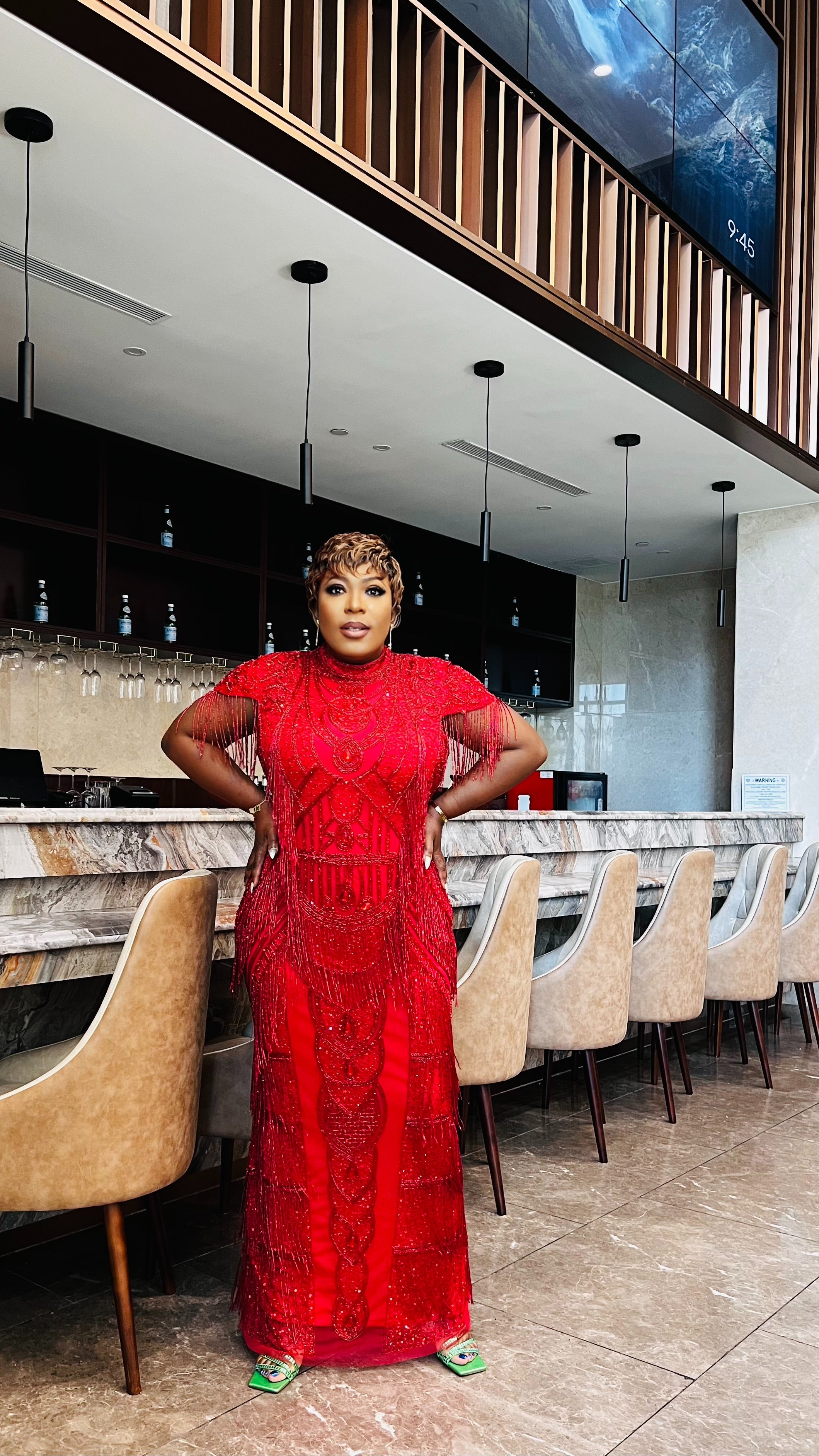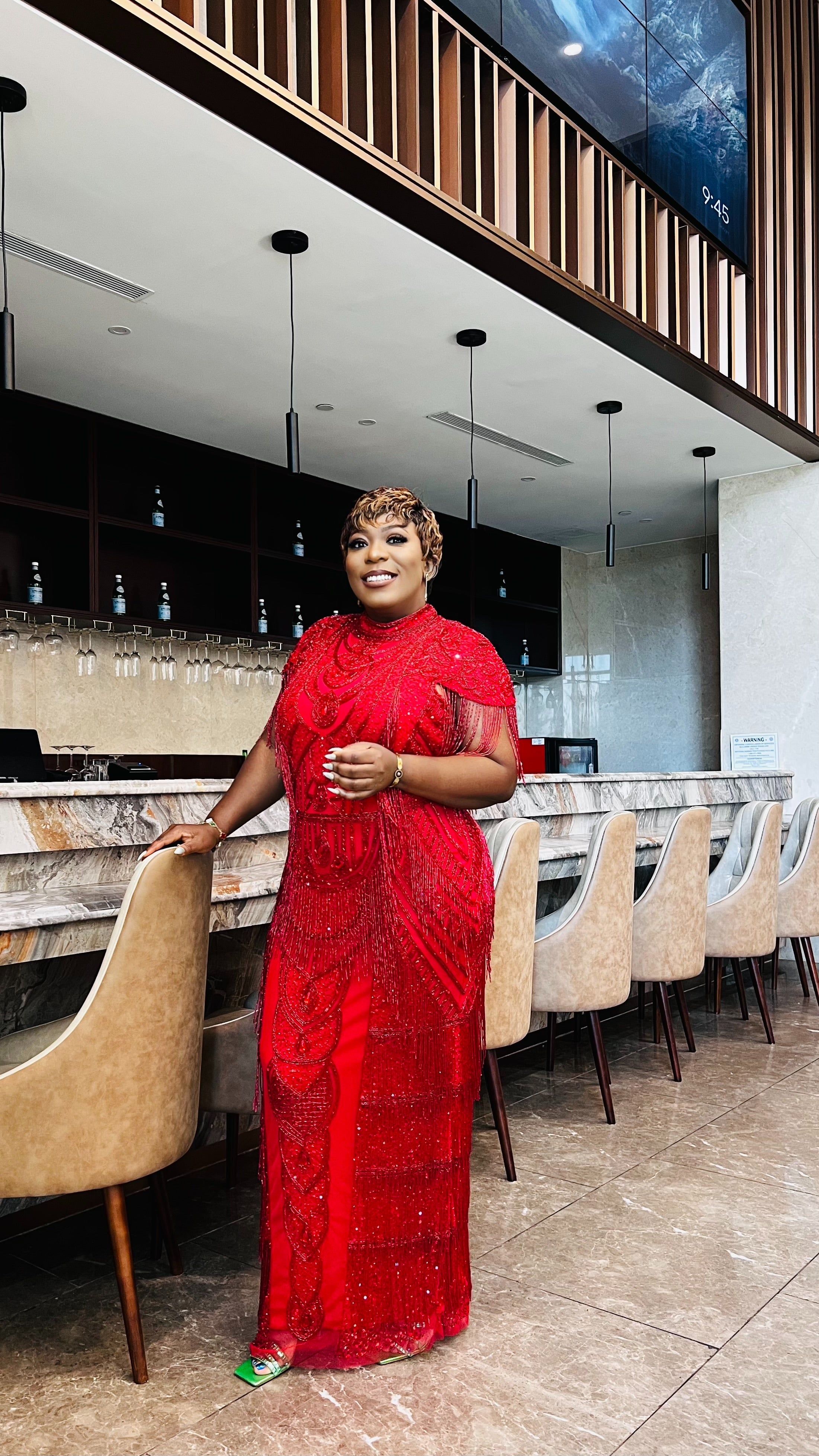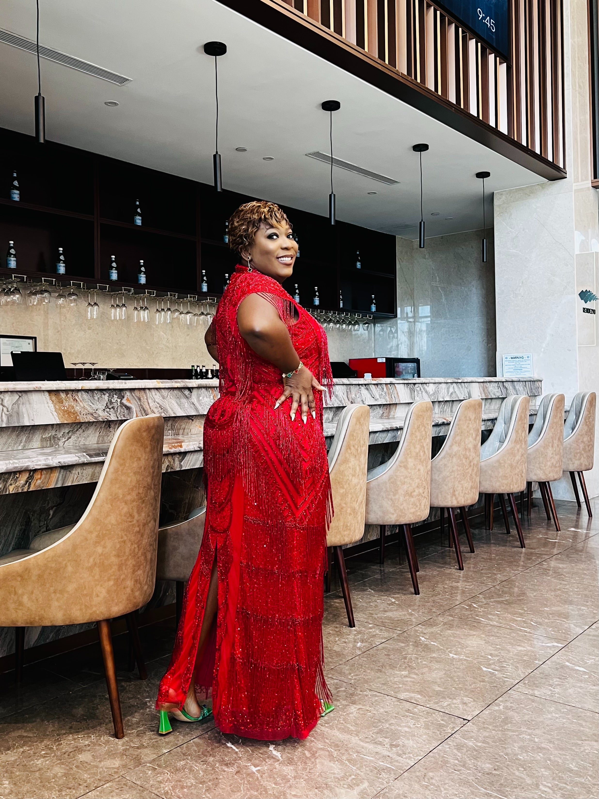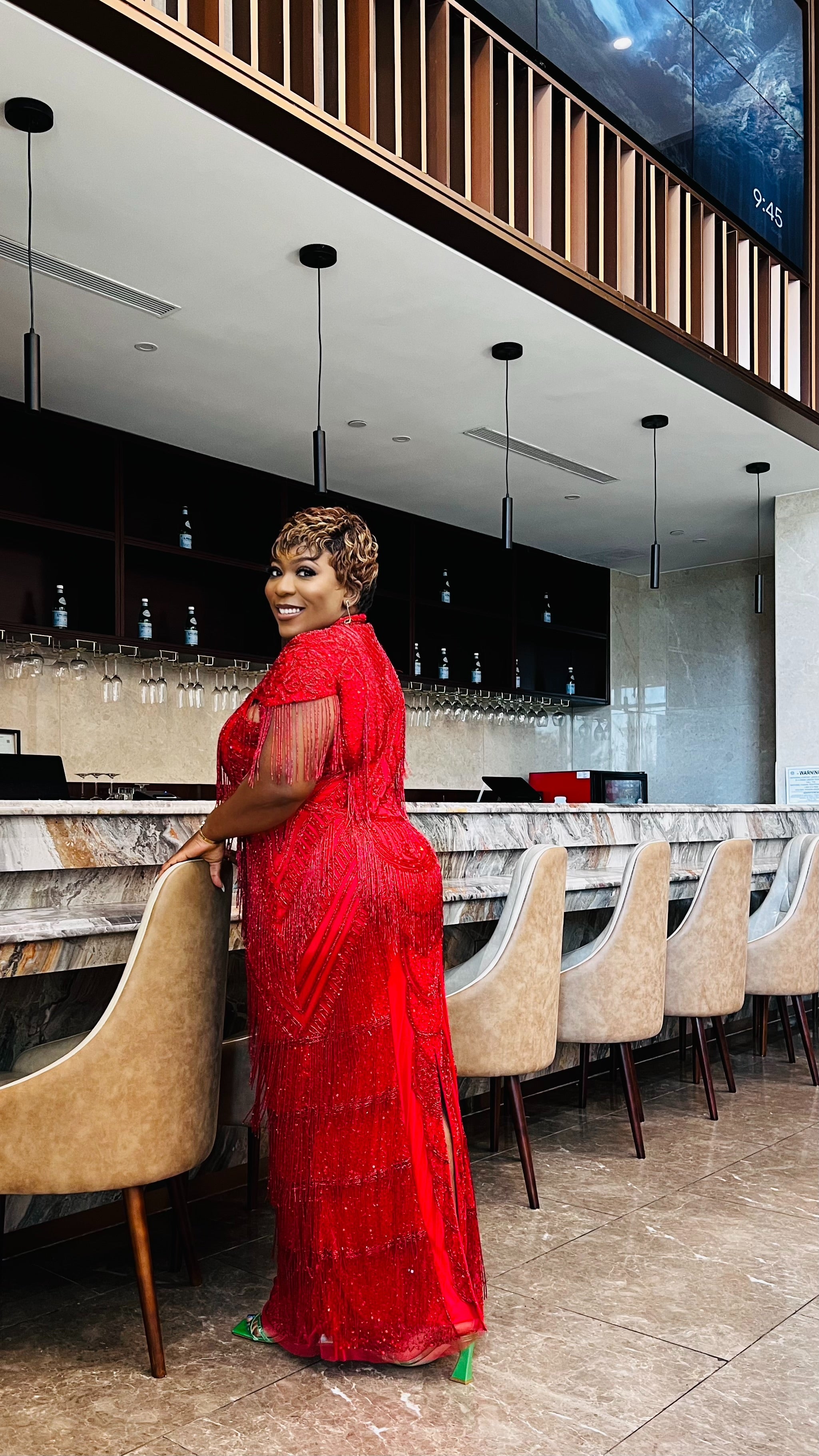 Elevate your wardrobe with our Cardi Exclusive Luxury Vintage Dress in red. Handcrafted with exquisite glass beads, this dress exudes elegance and sophistication. Embrace the allure of a bygone era and make a bold statement at your next event. Only for those with a discerning taste for the finer things in life.  Model is wearing size Large  Has back zipper  Has Button closure Al over fringe detail in glass bead  Hand Made !