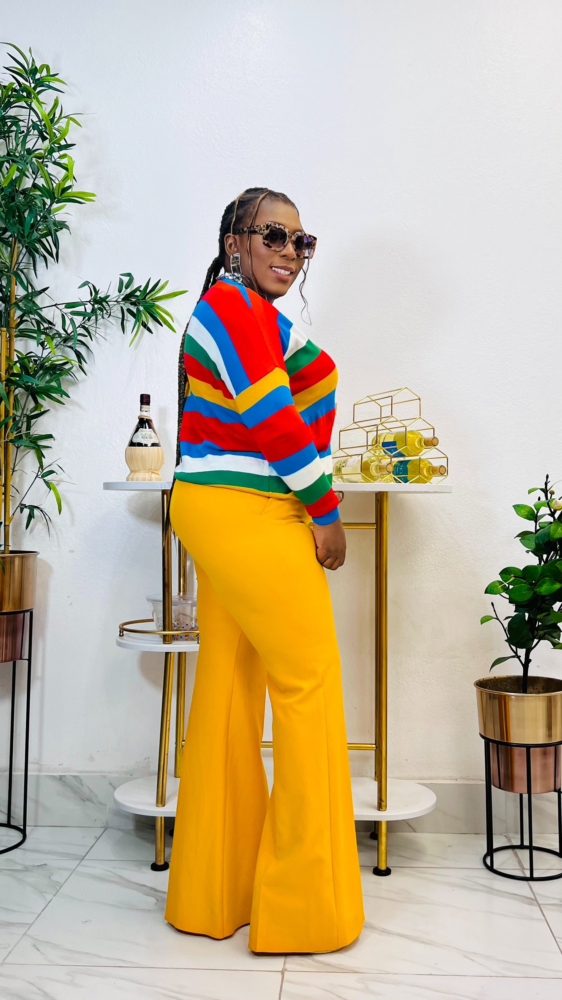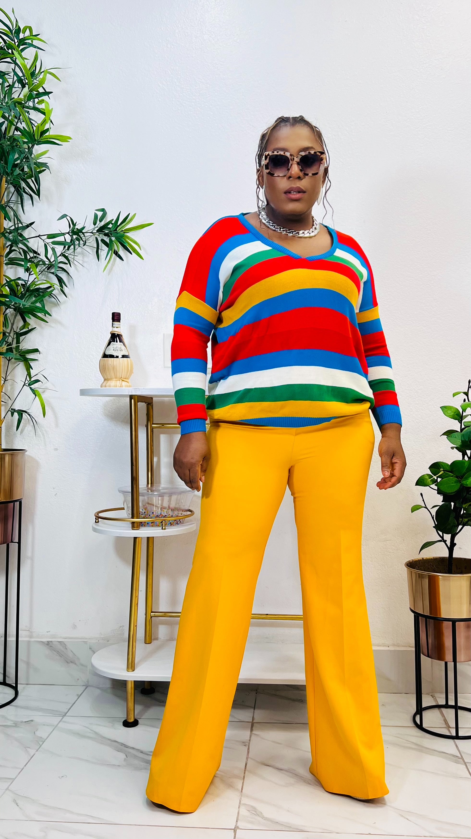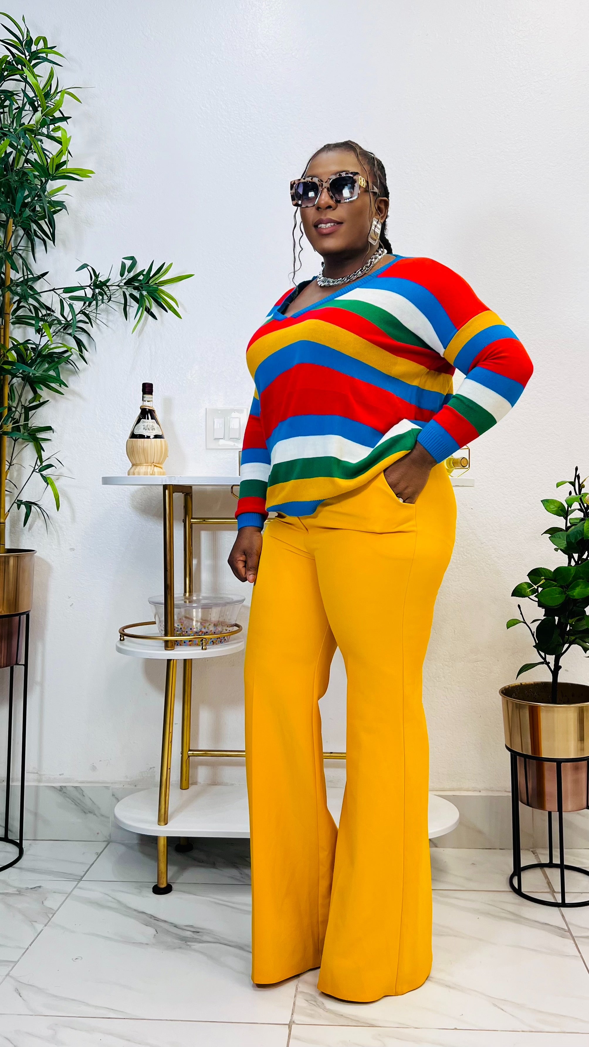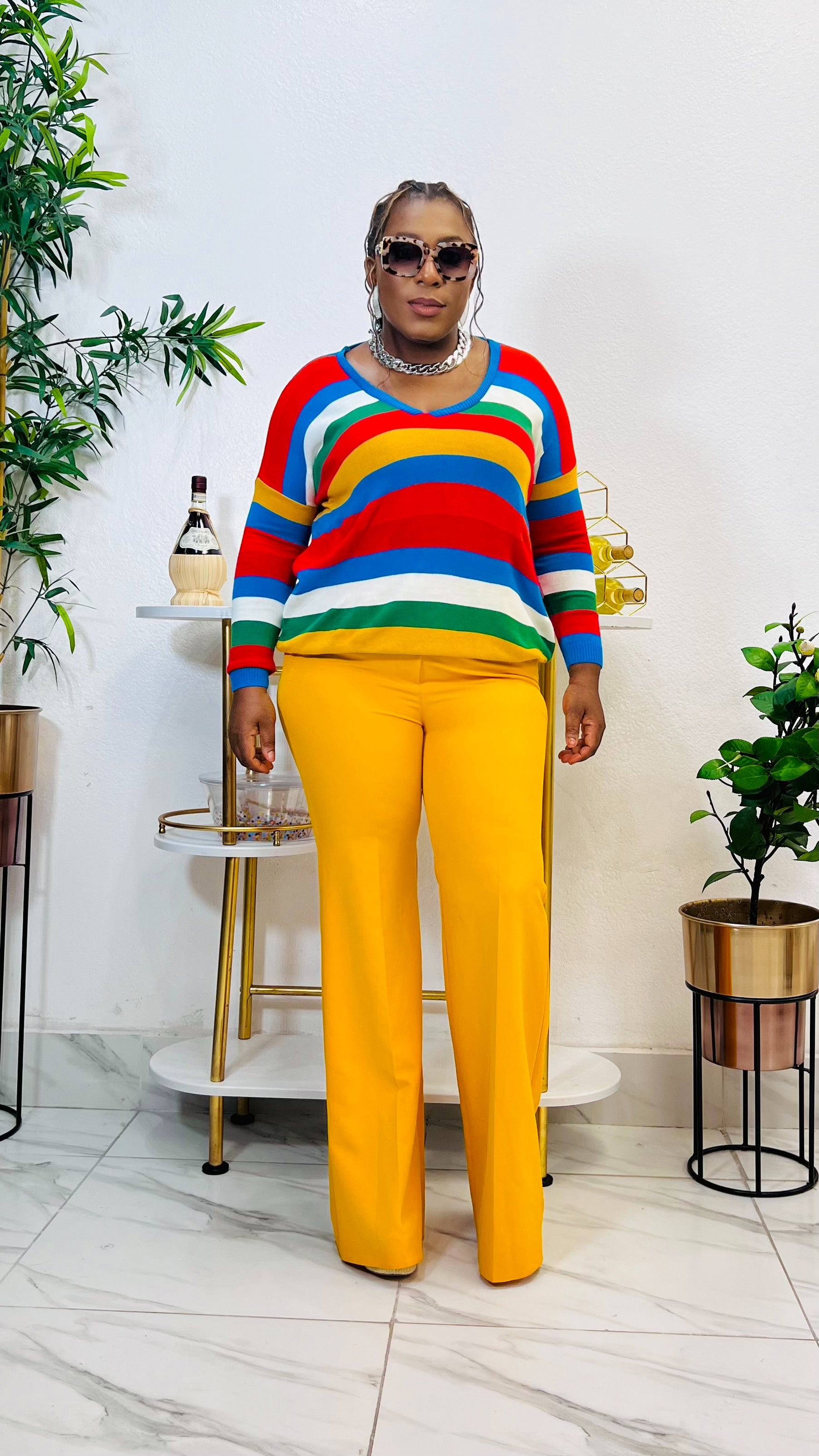 Enhance your wardrobe with the CARMEN STRIPE V-NECK SWEATER TOP. This stylish top features a flattering v-neckline and classic striped pattern, perfect for any occasion. The long sleeves provide warmth and comfort, making it a versatile addition to your wardrobe. Elevate your style with this expertly crafted sweater top. Model is wearing size Large pant : miss professional pant (Mustard)