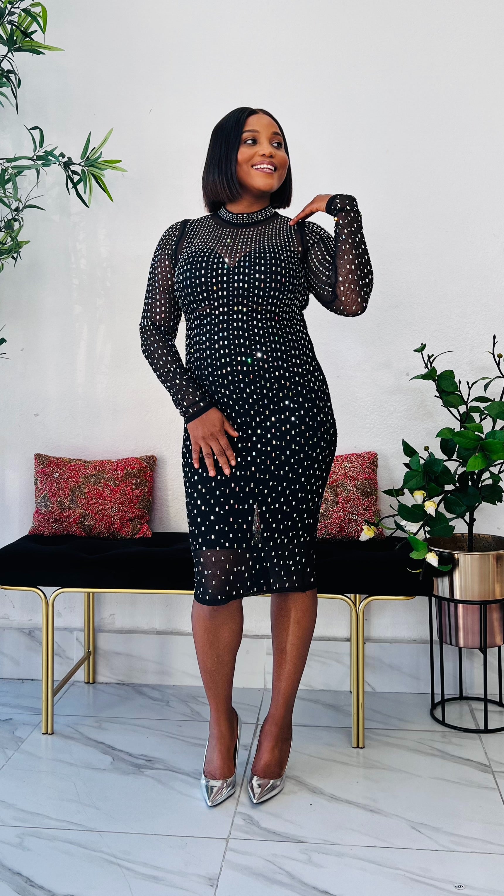 Turn heads with effortless elegance in the Chicane Crystal Illusion Midi Dress ✨ This stunning body-contouring midi features a sheer illusion mesh overlay adorned with delicate crystal embellishments that catch the light with every step. Designed with a sleek high neckline and long fitted sleeves, it offers the perfect balance of sophistication and glamour. The figure-hugging silhouette enhances your natural curves while the soft stretch fabric ensures a comfortable, flattering fit.