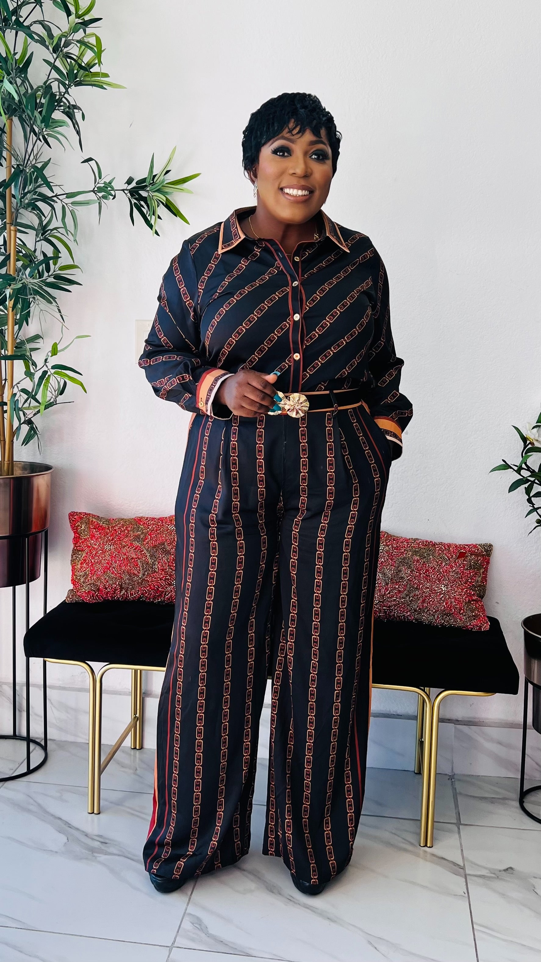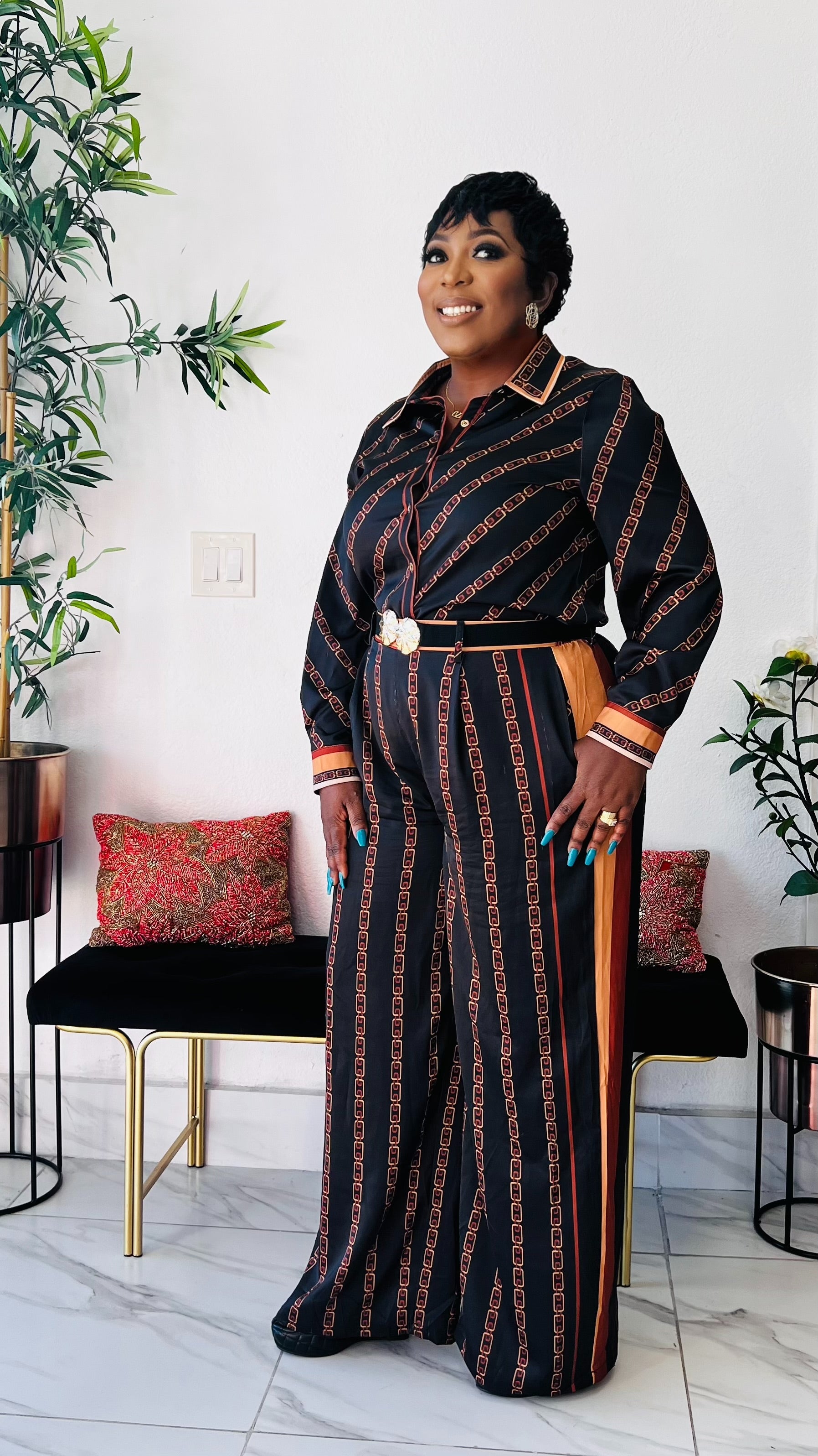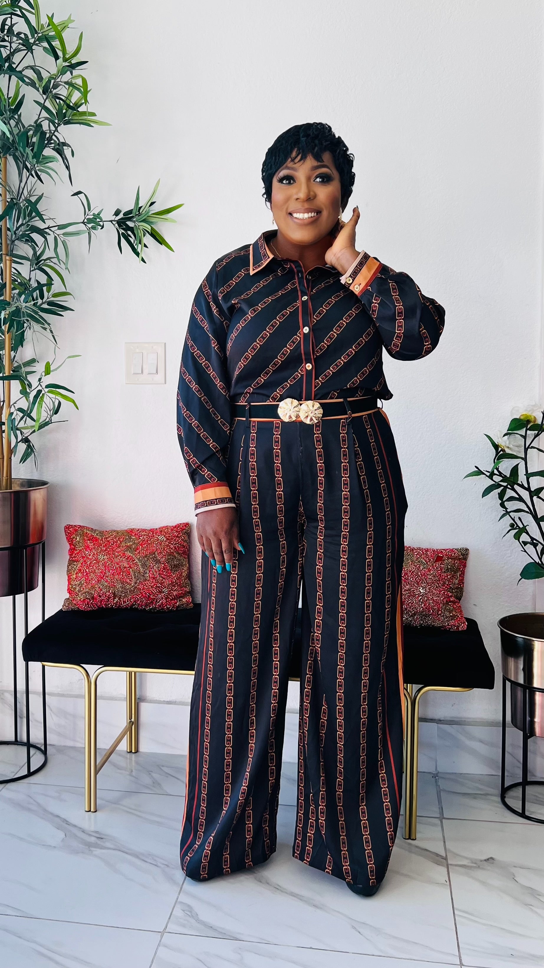 This 3pc set features a stylish and luxurious silk chain design, paired with a flattering belt and wide leg pant. Elevate your wardrobe with this versatile and modern ensemble, perfect for any occasion. Experience the ultimate blend of comfort and style with this must-have set.