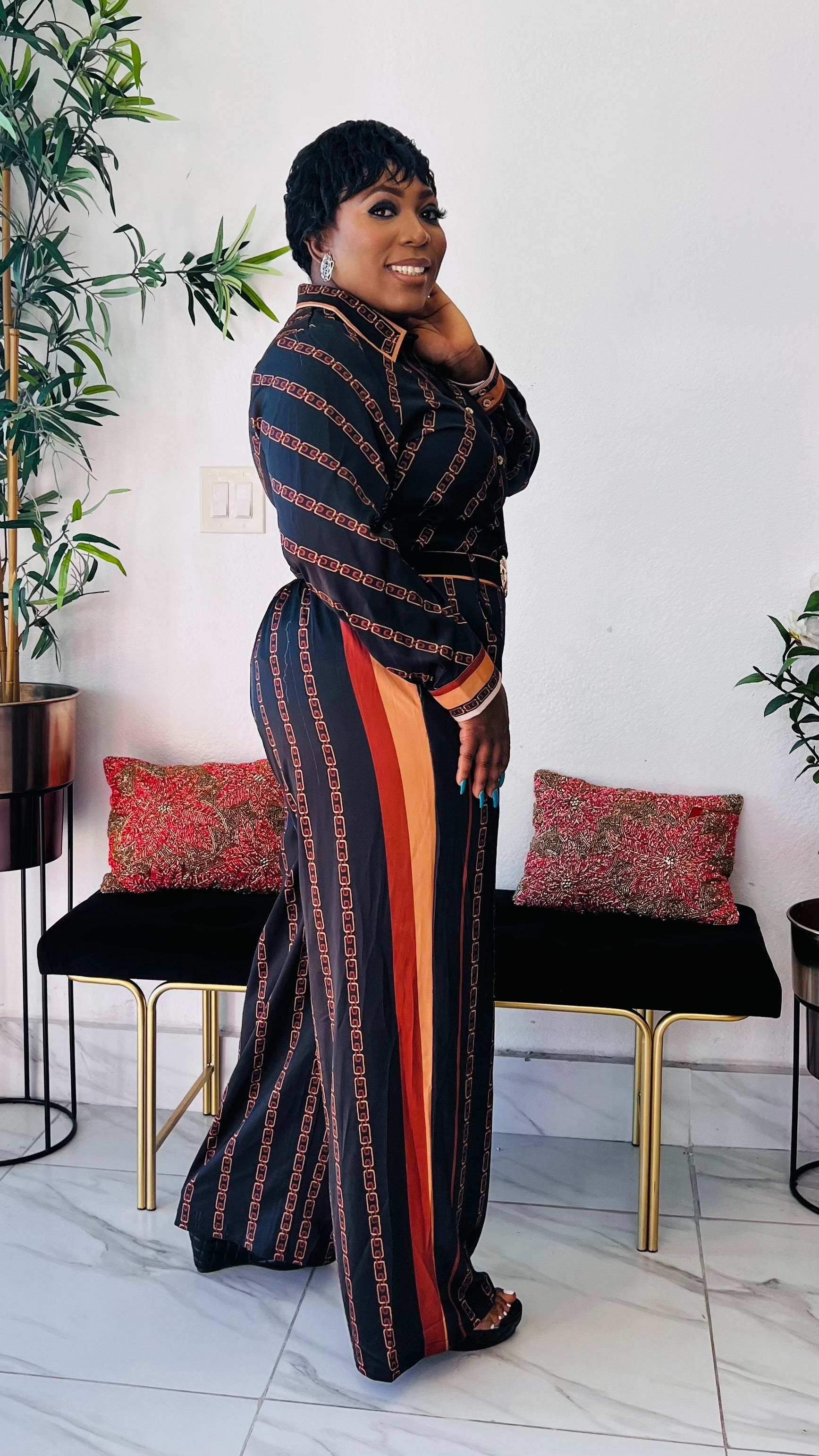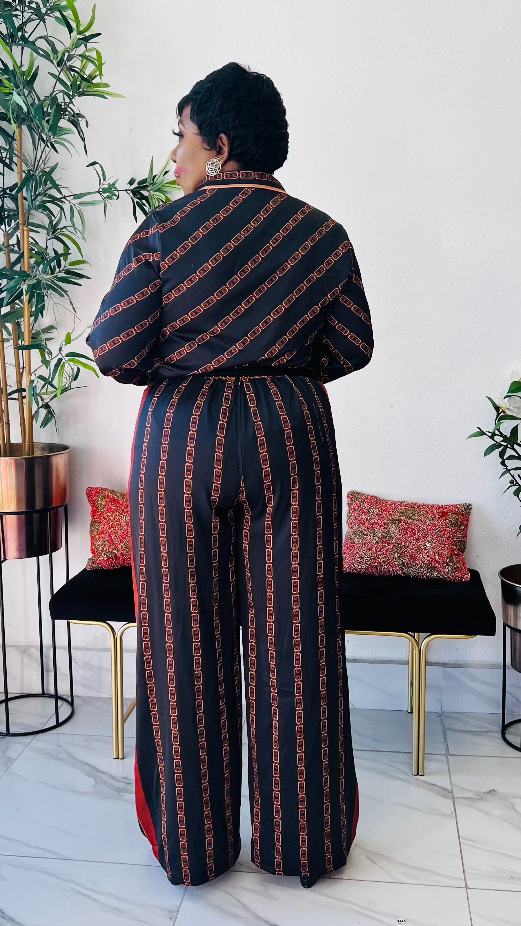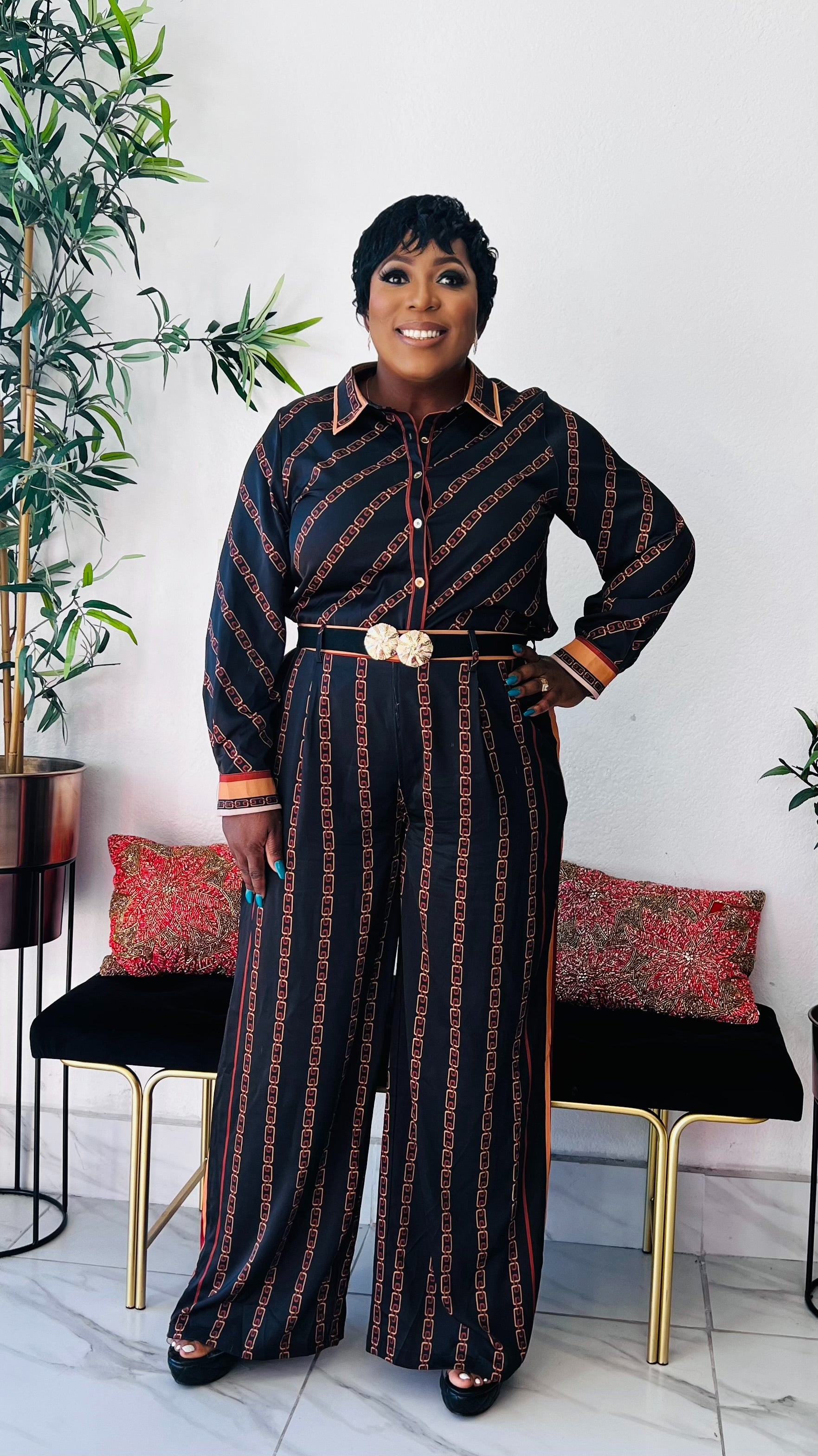 This 3pc set features a stylish and luxurious silk chain design, paired with a flattering belt and wide leg pant. Elevate your wardrobe with this versatile and modern ensemble, perfect for any occasion. Experience the ultimate blend of comfort and style with this must-have set.