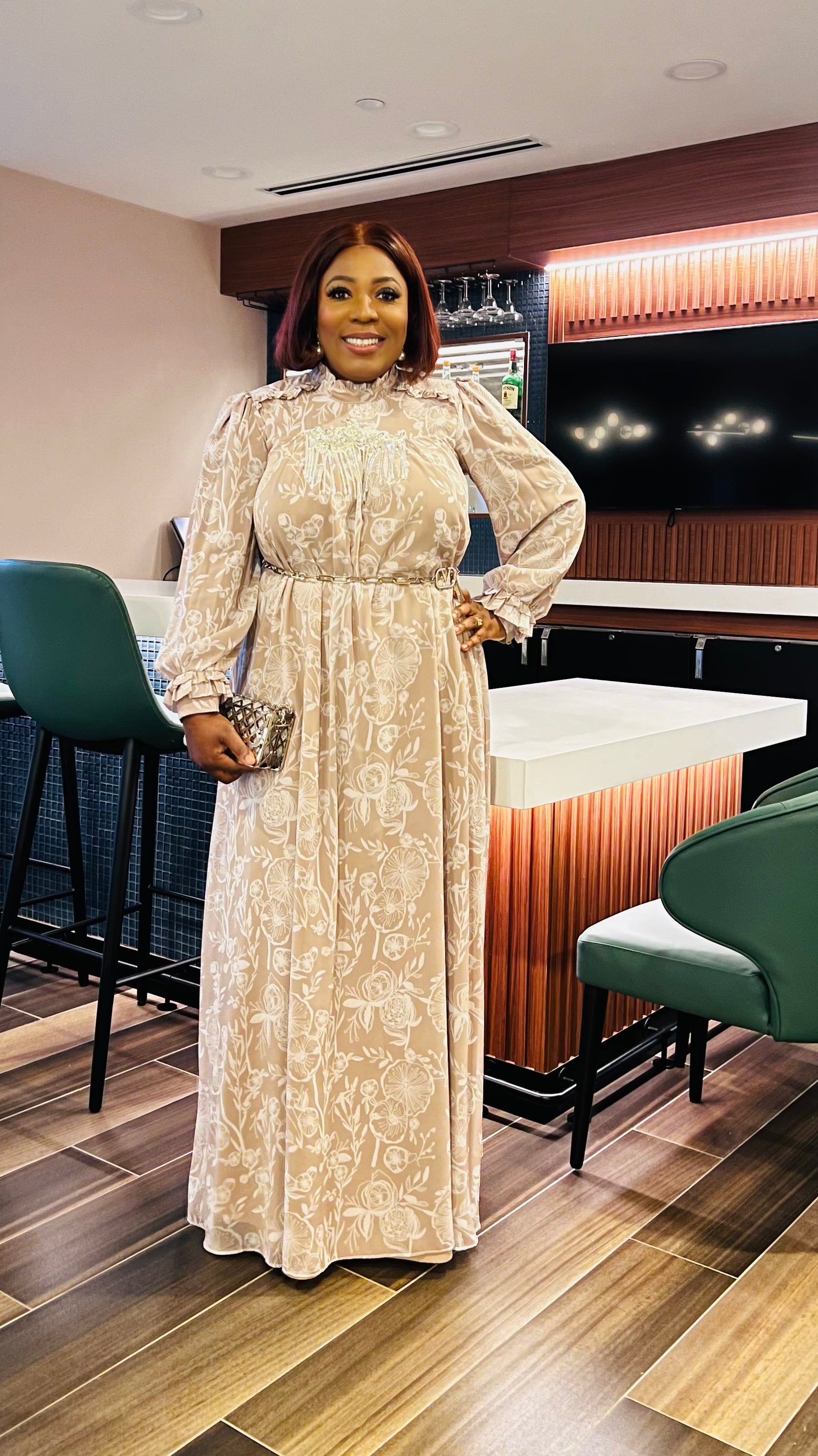The Ethereal Grace Embroidered Maxi Dress features a sheer ivory-toned overlay adorned with delicate floral embroidery, layered over a soft neutral lining for full coverage and comfort. Designed with a high neckline, subtle shoulder volume, and gently cinched waist enhanced by a slim gold belt detail, this silhouette flatters while remaining timeless.   The long sleeves with gathered cuffs add a romantic finish, making this dress perfect for elevated evenings, celebrations, worship, or refined daytime occasions. Graceful, feminine, and undeniably luxe.