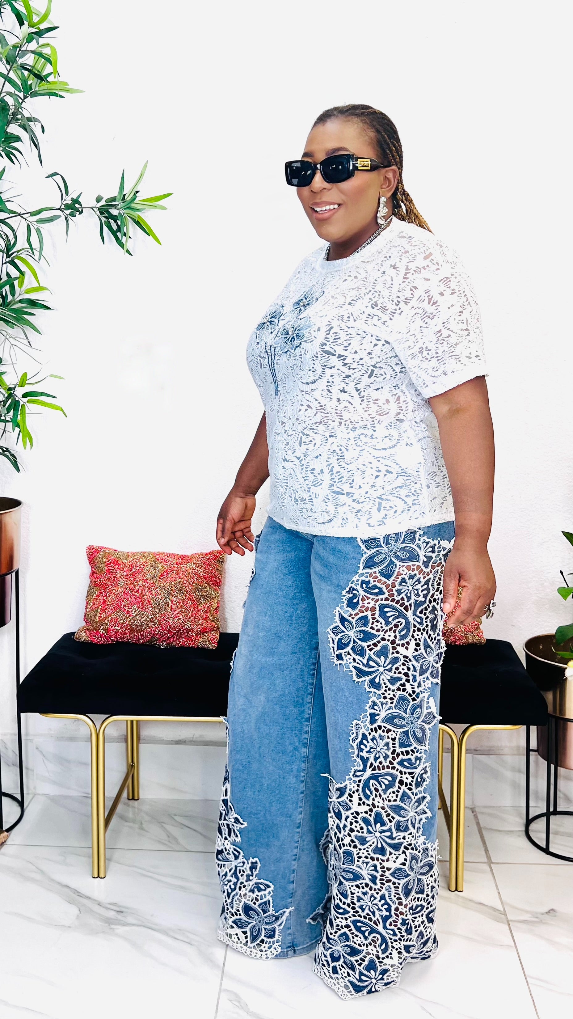 Elevate your style with our elegant LACE PETAL RHINESTONES TOP. Adorned with delicate lace petals and shimmering rhinestones, this top exudes sophisticated charm. Perfect for special occasions or a night out, it adds a touch of glamour to any outfit. Enhance your wardrobe with this stunning piece. model is wearing size LARGE