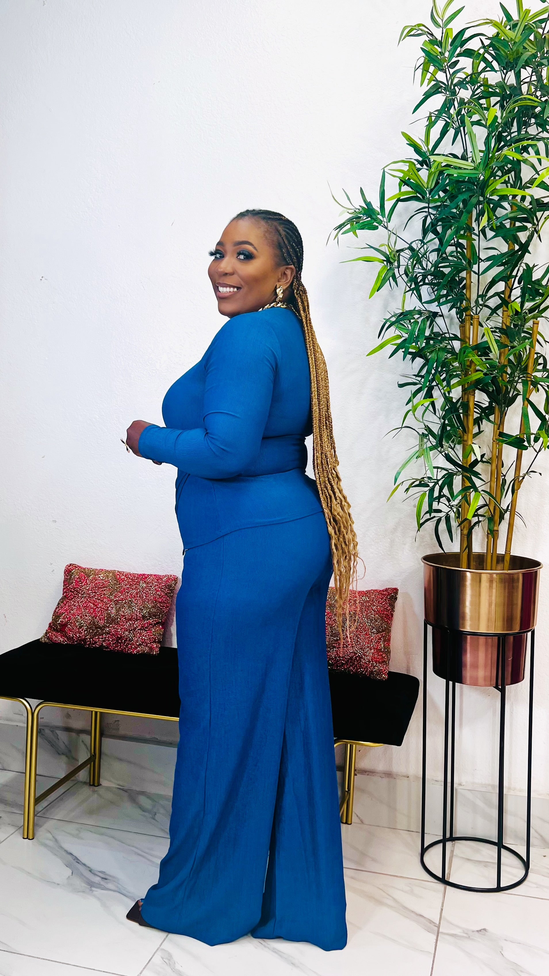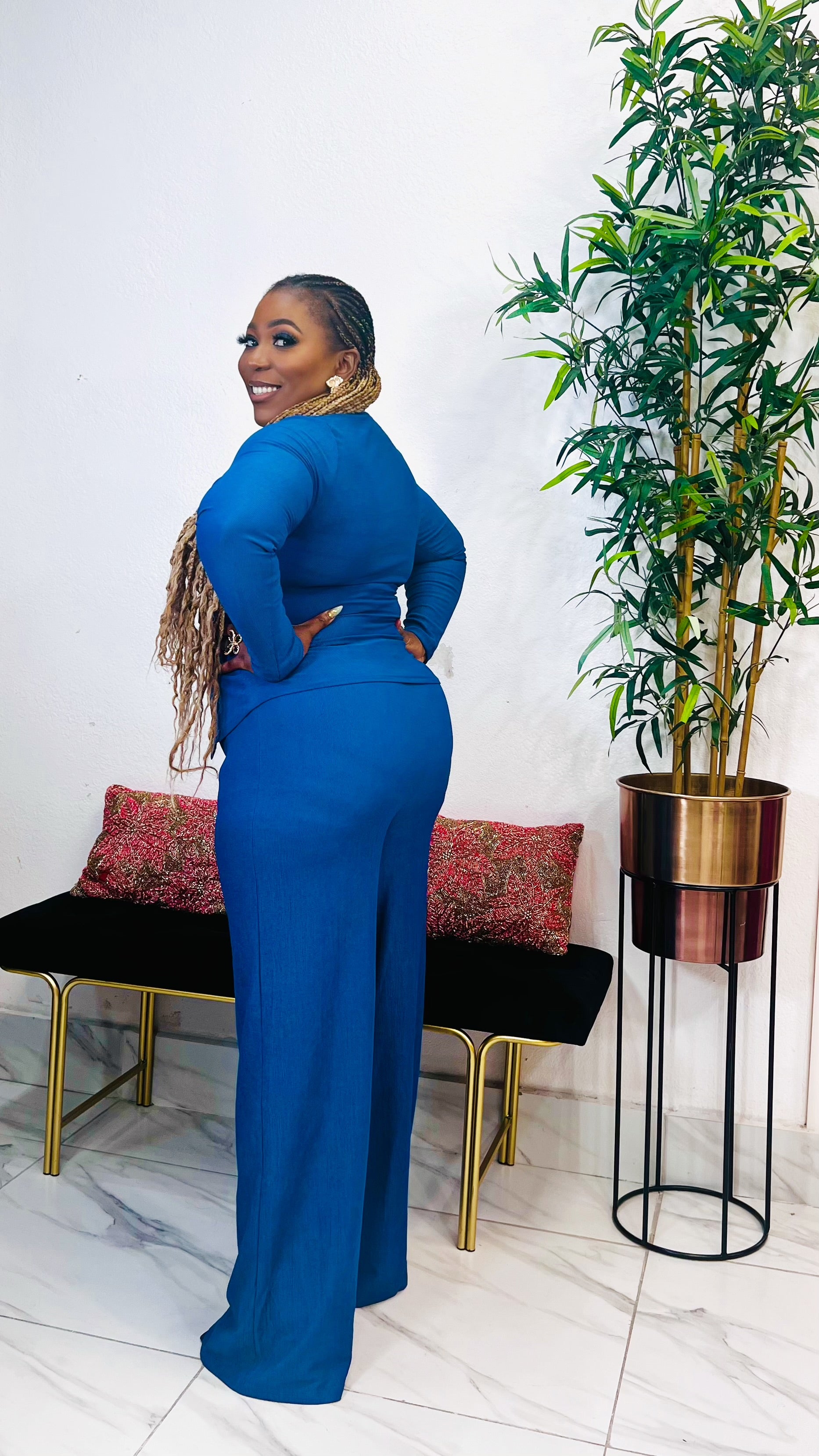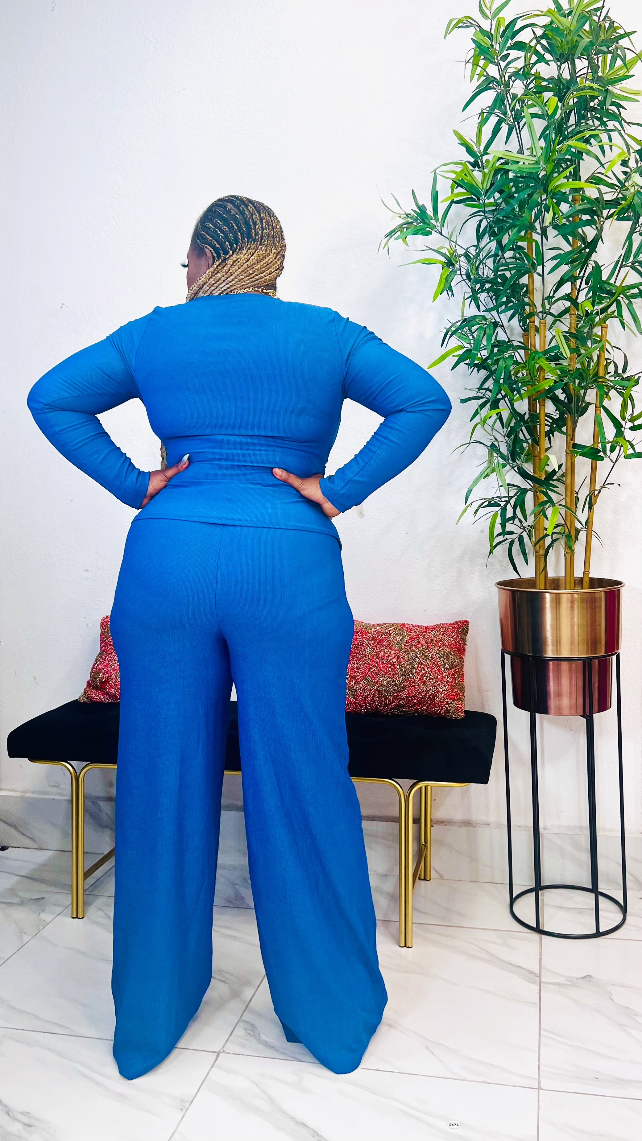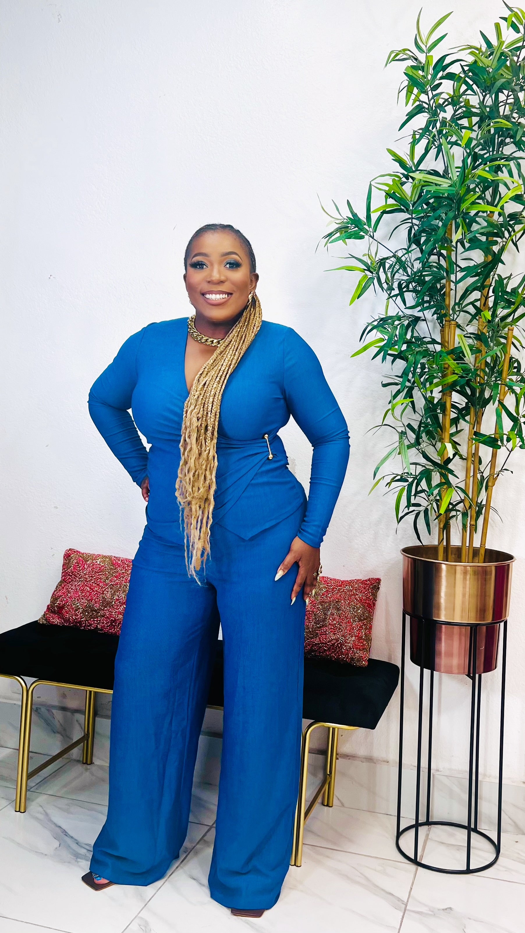 The LUCIA SIDE BUCKLE V-NECK PANT SET in Denim Blue offers a stylish and versatile addition to your wardrobe. Made from knit material, this set features a lavish gold buckle V-neck top and a matching wide leg pant set for a sophisticated look. Elevate your style with this trendy and comfortable outfit.  Shop this look in-store at STYLETITTUDE Apparel Boutique , your women’s boutique on Westheimer Rd, Houston (77077). We proudly serve customers across West Houston, Katy , Cypress , Richmond, Rosenberg, Missouri city, Energy Corridor, West Chase, and Alief  who are searching for chic women’s fashion close to home. Visit us today at 13964 Westheimer Rd, Houston, TX 77077, to try it on in person, or order online for fast nationwide delivery. True to size  Stretchy Knit Fabric  97% Polyester , 3% Lycra  Model is wearing size Large  Top length 22inches , Pant Length 45inches  Inseam “ 34 inches (Large)