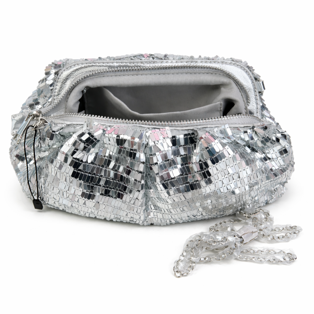 The Luminara Luxe Sequin Clutch is the definition of modern glamour. Designed with cascading metallic sequins that shimmer with every movement, this statement clutch captures light from every angle, creating a dazzling evening look. Its softly structured silhouette adds volume and elegance, while the sleek interior keeps your essentials secure for nights that call for sophistication. Perfect for galas, weddings, cocktail events, and upscale dinners, this clutch is the finishing touch for a woman who commands attention without saying a word. Details Metallic sequin exterior Soft gathered silhouette Spacious interior for essentials Detachable chain strap option Perfect for evening and special occasions