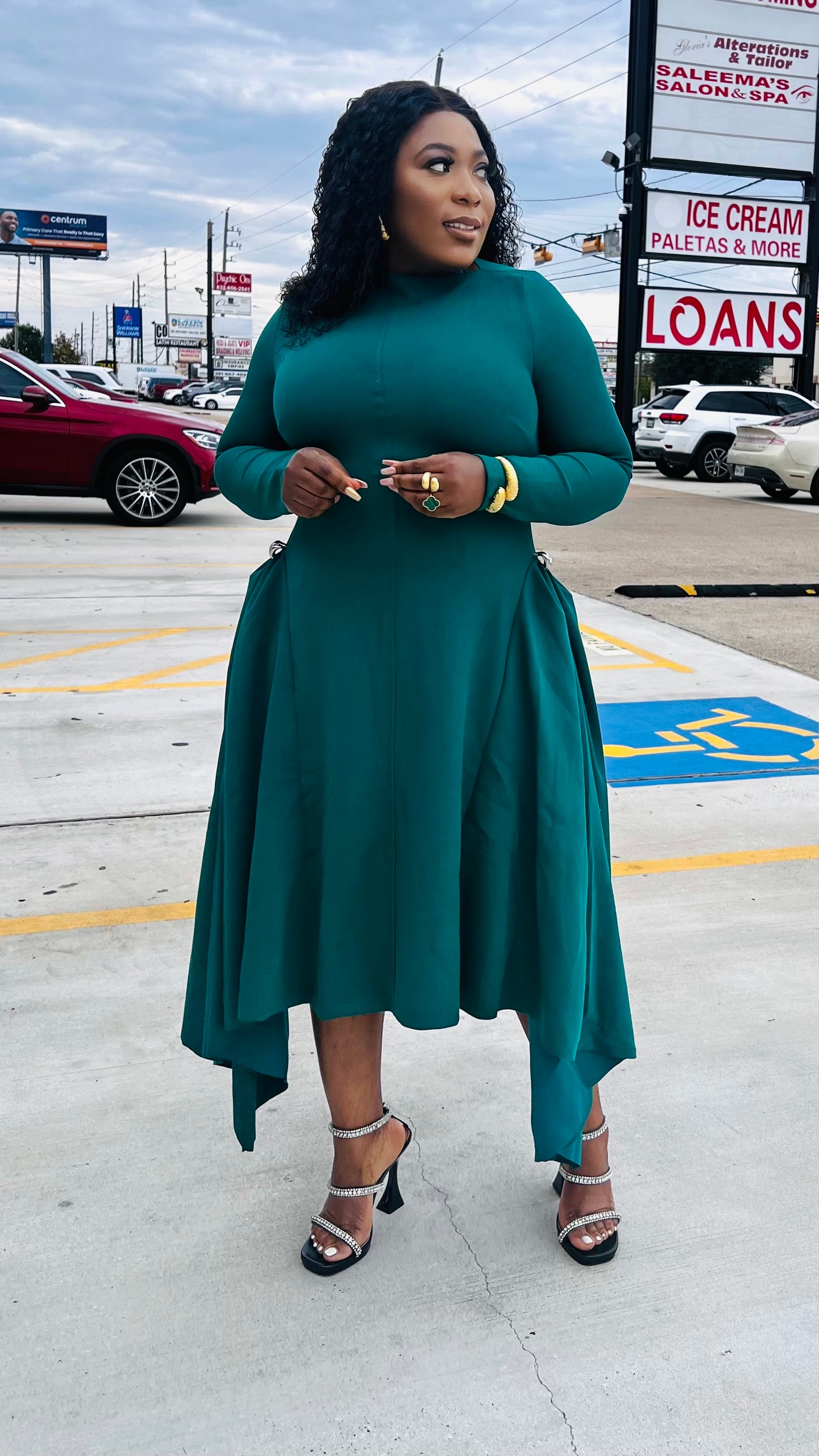 Step into timeless sophistication with the Madeline Asymmetric Elegance Midi Dress. Designed in a rich teal hue, this piece features a smooth, structured bodice that flatters effortlessly, long sleeves for a refined touch, and a flowing asymmetrical hemline that adds graceful movement with every step.  Side ring accents softly shape the waist, creating a flattering silhouette without compromising comfort. Perfect for brunch, church, special events, or polished everyday style — this dress is where classic meets modern chic.   Model is 5”6 wearing size Large (Burst 36DD , waist 40 , Hip 46 ) Fitted Silhouette  Dress length 54 inches  Asymmetrical side length   Very stretchy  Has long back zipper