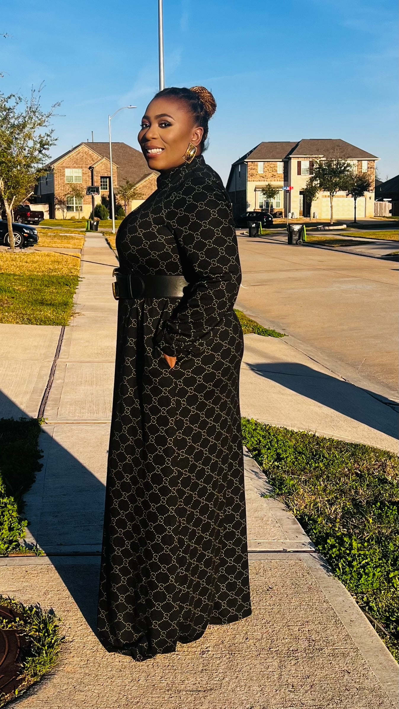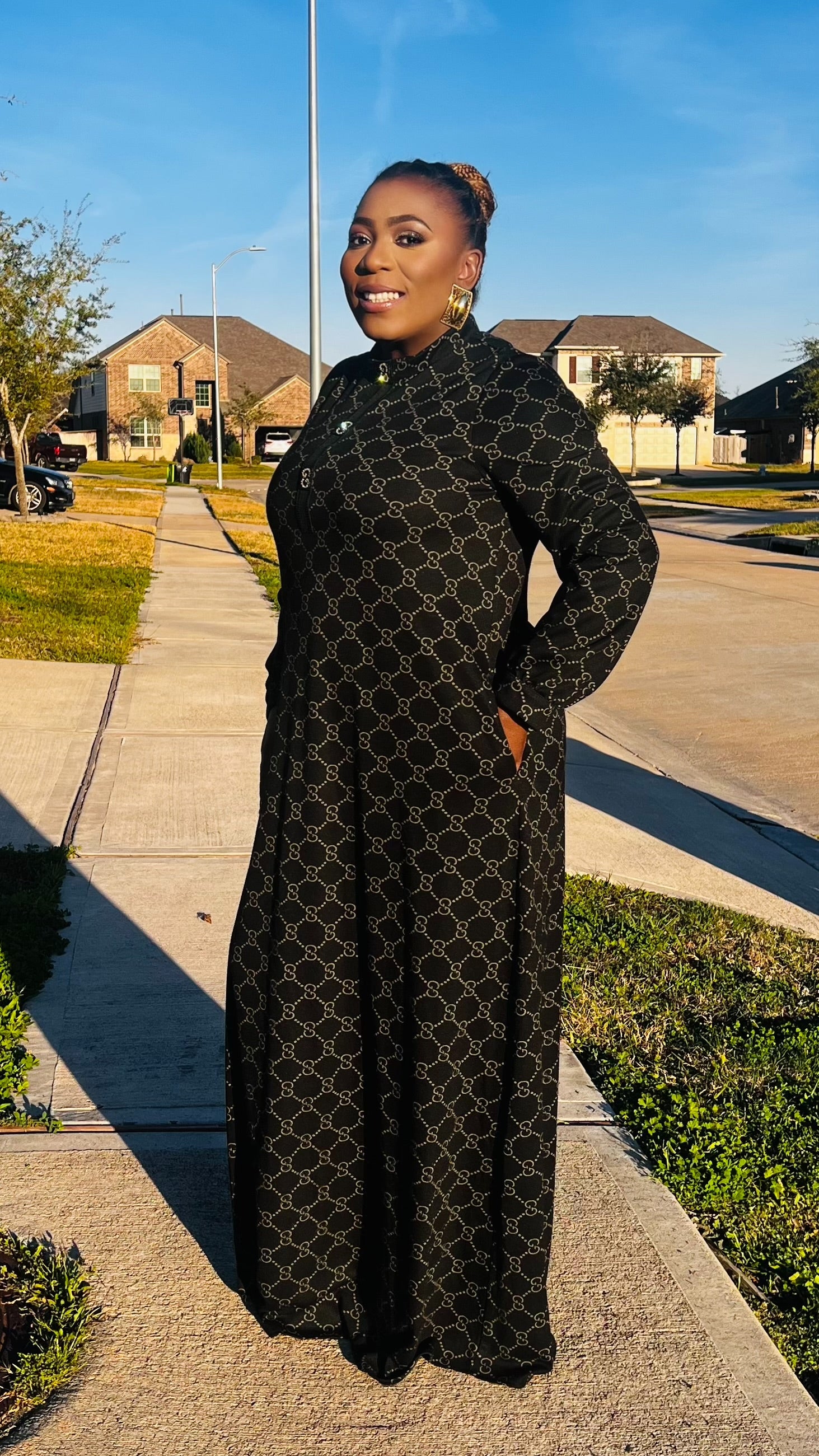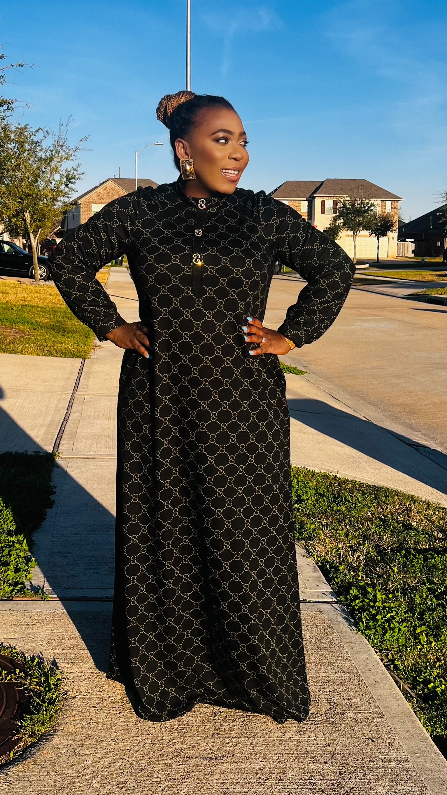 The Monroe Noir Signature Maxi Dress is the definition of understated luxury. Designed in a flowing full-length silhouette, this piece features a refined allover chain-inspired print set against a classic black backdrop for a look that is both bold and sophisticated.   The high neckline and long sleeves create a sleek, modest finish, while the relaxed drape offers graceful movement with every step. Crafted for comfort without compromising elegance, this dress transitions seamlessly from church to evening events, business gatherings, and elevated everyday moments.   Why you’ll love Monroe Noir: • Elegant full-length silhouette • Luxe chain-inspired print detailing • Modest high neckline with long sleeves • Flowy, comfortable fit • Timeless black for effortless styling