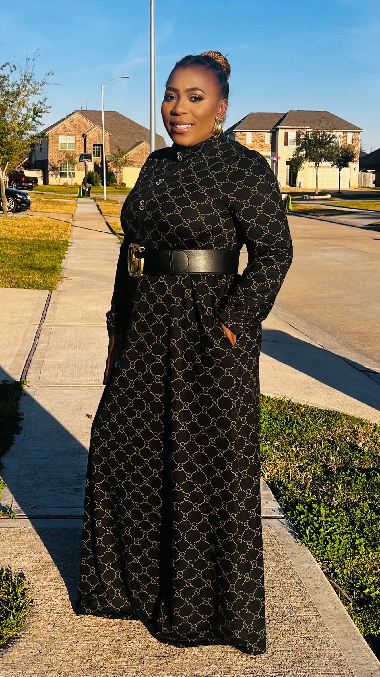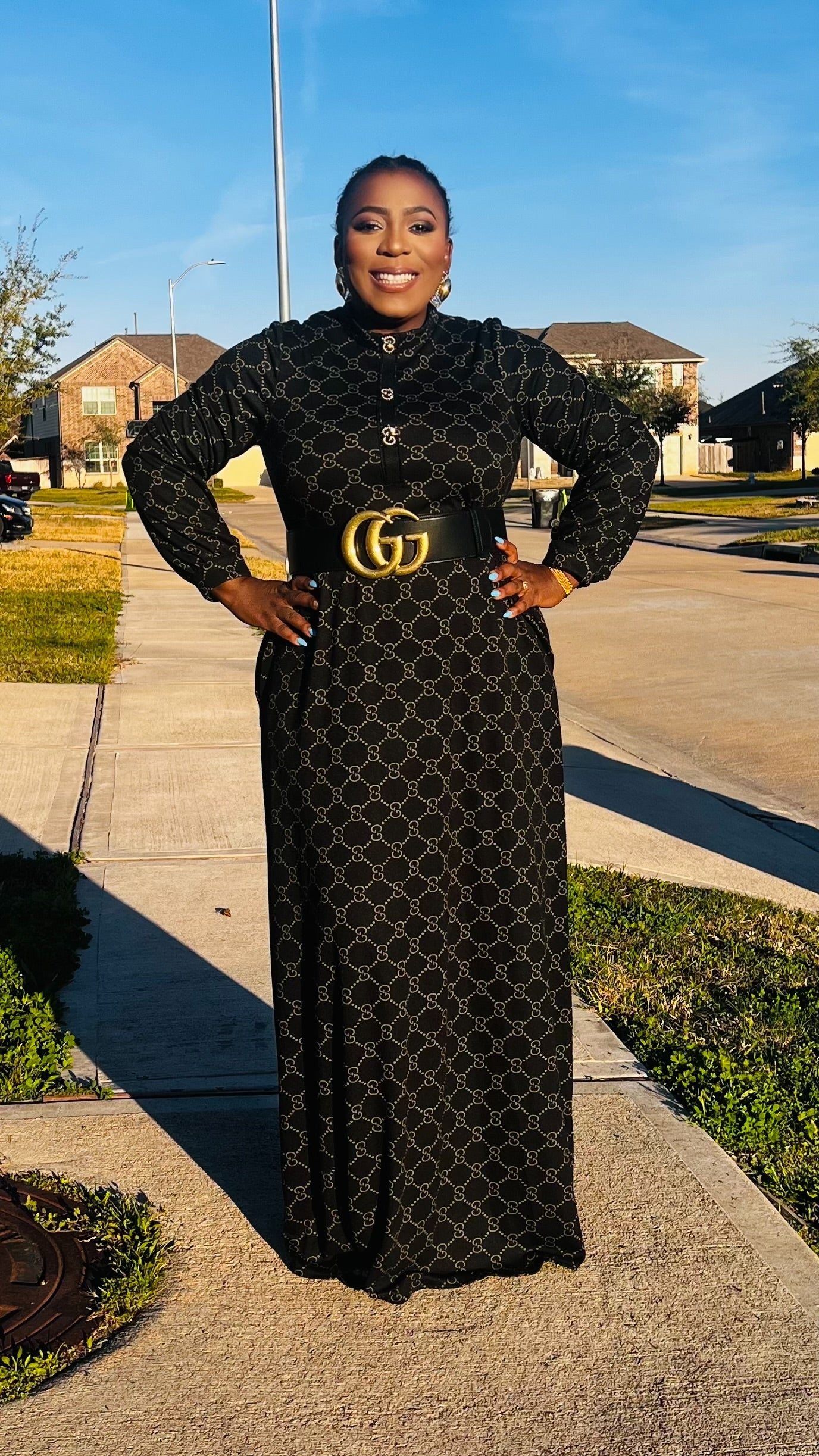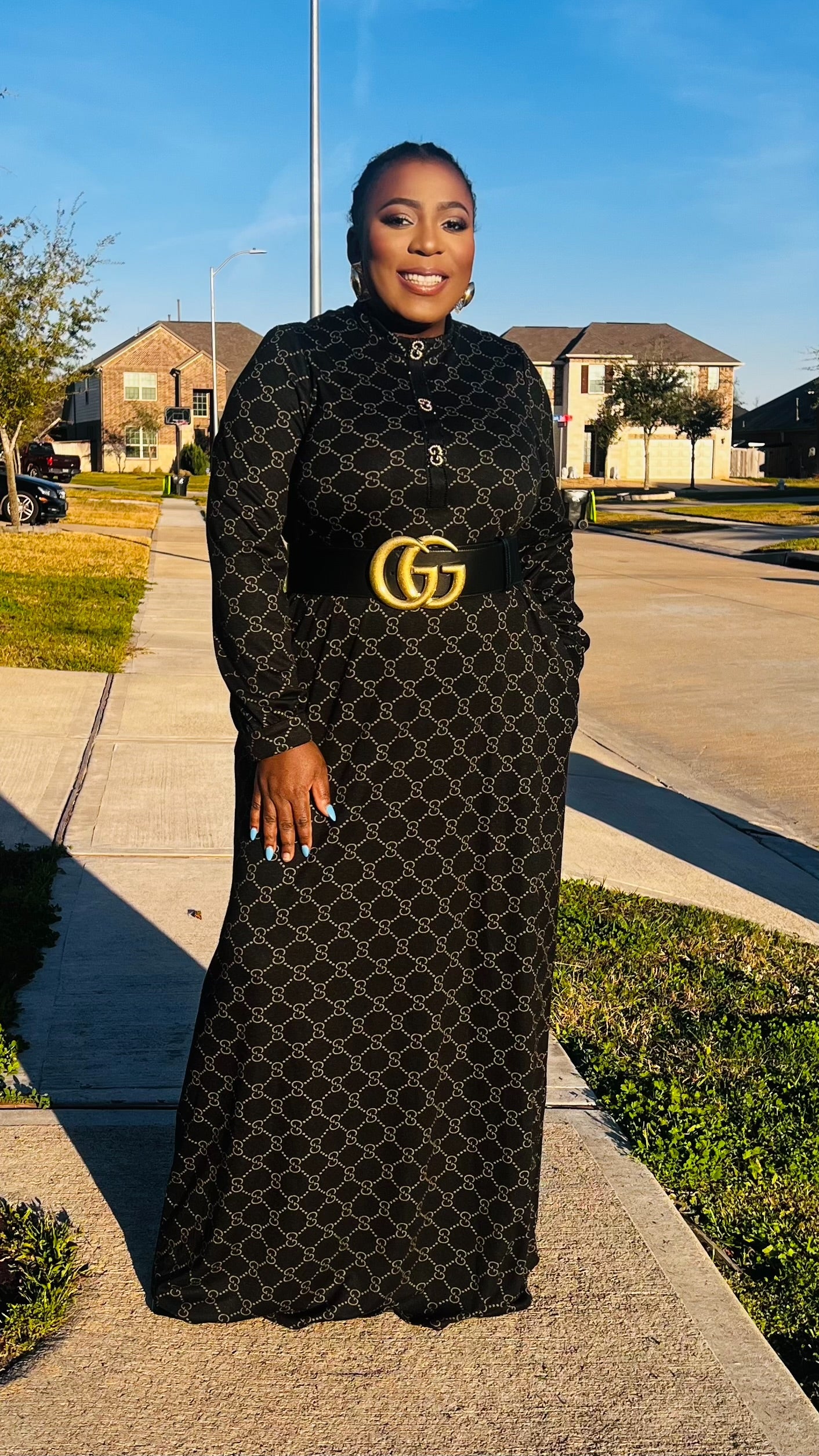 The Monroe Noir Signature Maxi Dress is the definition of understated luxury. Designed in a flowing full-length silhouette, this piece features a refined allover chain-inspired print set against a classic black backdrop for a look that is both bold and sophisticated.   The high neckline and long sleeves create a sleek, modest finish, while the relaxed drape offers graceful movement with every step. Crafted for comfort without compromising elegance, this dress transitions seamlessly from church to evening events, business gatherings, and elevated everyday moments.   Why you’ll love Monroe Noir: • Elegant full-length silhouette • Luxe chain-inspired print detailing • Modest high neckline with long sleeves • Flowy, comfortable fit • Timeless black for effortless styling