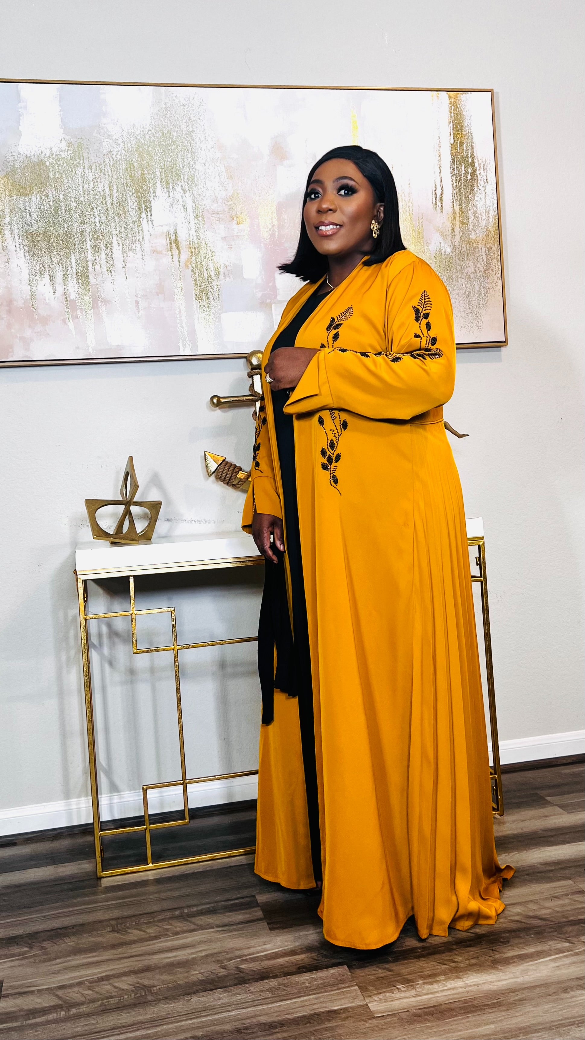 The NEEMAH 3 Piece Rhinestone Kimono Kaftan Set offers a versatile ensemble suitable for various occasions. Comprising a mustard yellow kimono with back pleated detail , black rhinestones with a sleeveless black dress and a self tie belt , this set combines elegance with comfort. Rhinestone embellishments enhance aesthetic appeal, making it ideal for both casual and formal settings. Crepe material  Has no stretch  comfortable fit  Runs true to size  Model is 5”6 wearing size Large