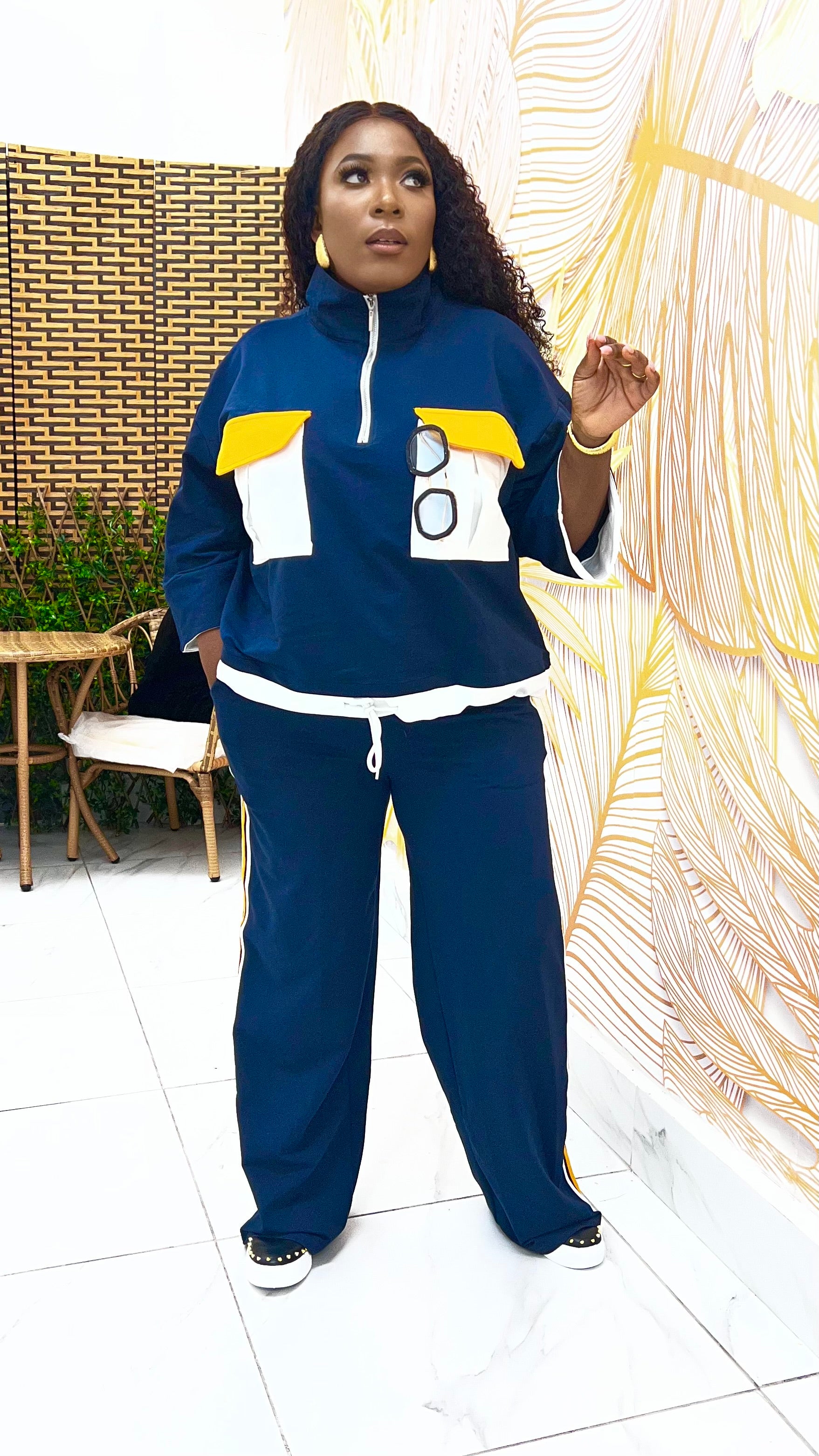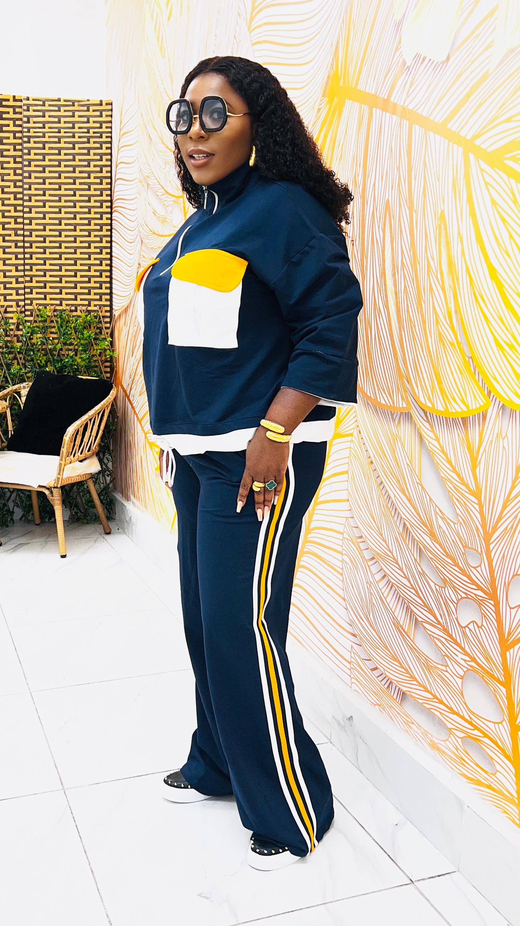 The Neo-Retro Luxe Athleisure Set is a refined blend of vintage inspiration and modern sophistication. Designed for women who value both comfort and presence, this two-piece set reimagines classic athleisure through a luxury lens.   The zip-front top features bold oversized contrast pockets that nod to retro utility styling, while the relaxed, non-cinched silhouette ensures effortless wear. The matching wide-leg pants are finished with statement side stripes, creating a lengthened, fluid line that moves beautifully with every step.   This set is the definition of polished ease—perfect for travel, casual outings, or styled street-chic moments. Details: Two-piece luxe athleisure set Relaxed, free-flowing fit (no cinched waist) Zip-front top with oversized contrast pockets Wide-leg pants with bold stripe detailing Pull-on waistband for comfort Designed for versatility, confidence, and everyday luxury