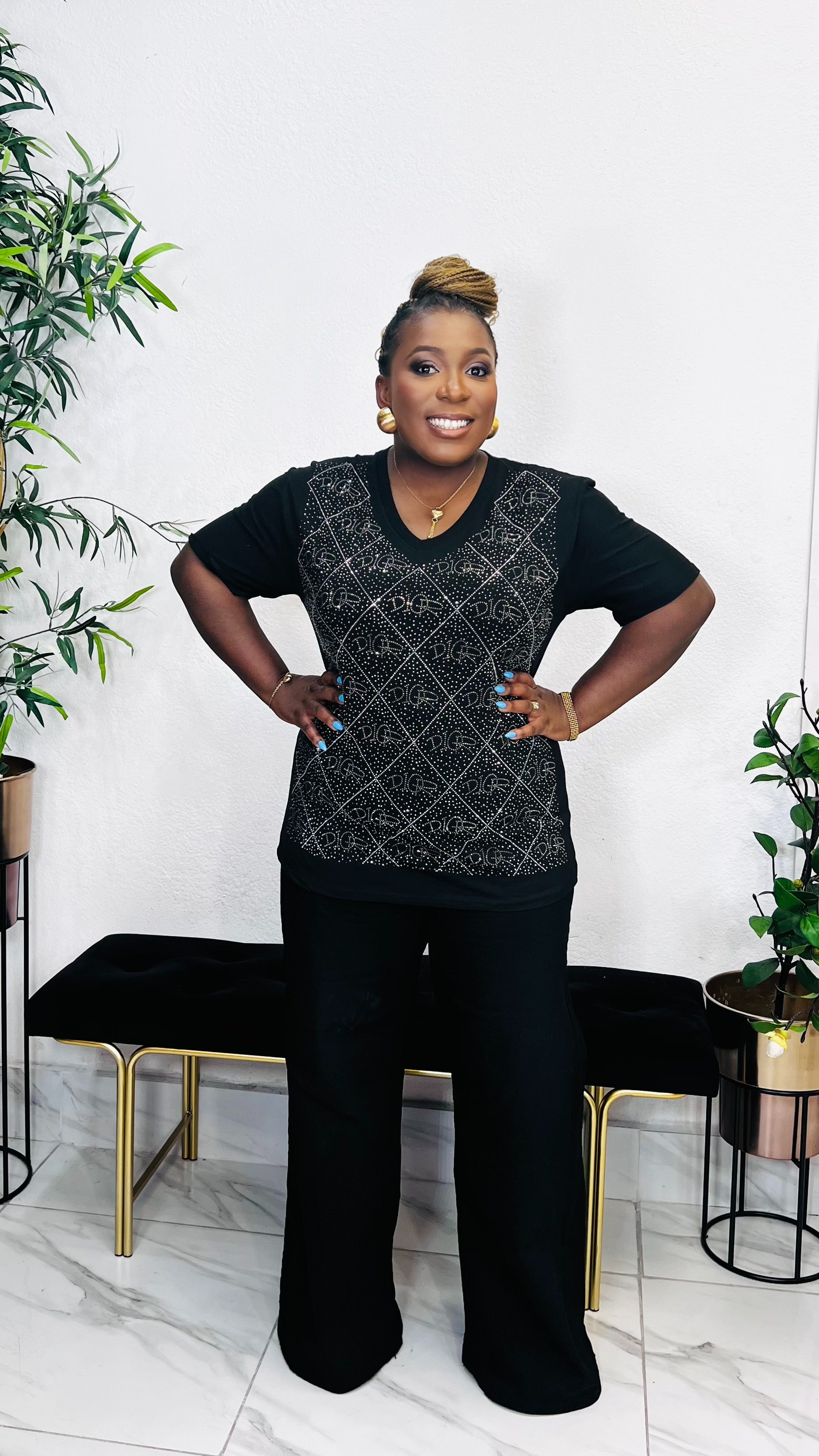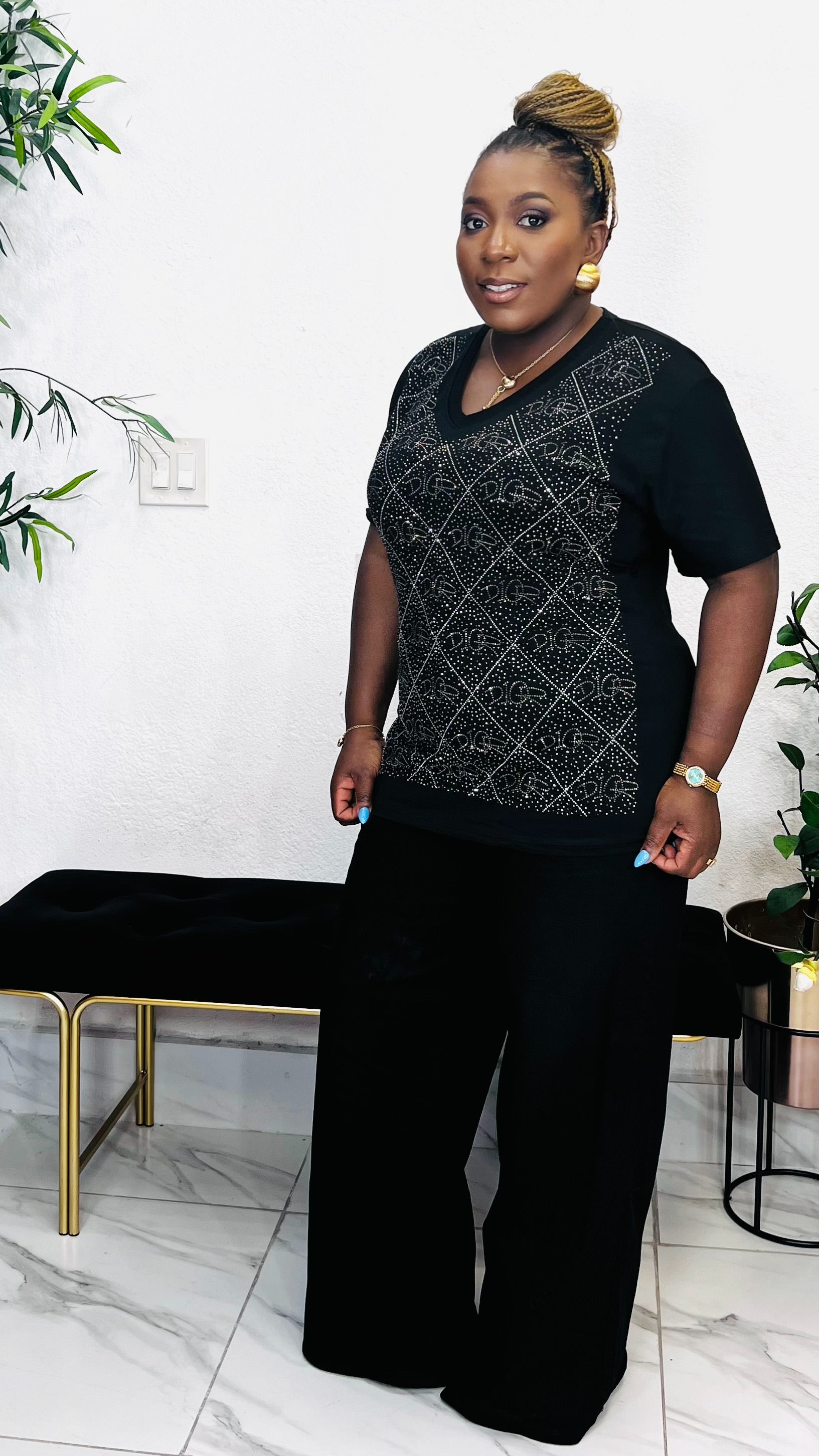 Bold, confident, and effortlessly chic — the Noir Dynasty Crystal Luxe Top is designed for the woman who loves subtle sparkle with a polished finish. Crafted in a classic black stretch fabric, this short-sleeve top features an all-over crystal-inspired geometric pattern that adds texture, shine, and elevated detail without overwhelming the look.   The relaxed luxe silhouette drapes beautifully, making it perfect for both everyday styling and dressed-up moments. Pair it with tailored pants, denim, or statement accessories for that signature STYLETITTUDE soft-luxury aesthetic.