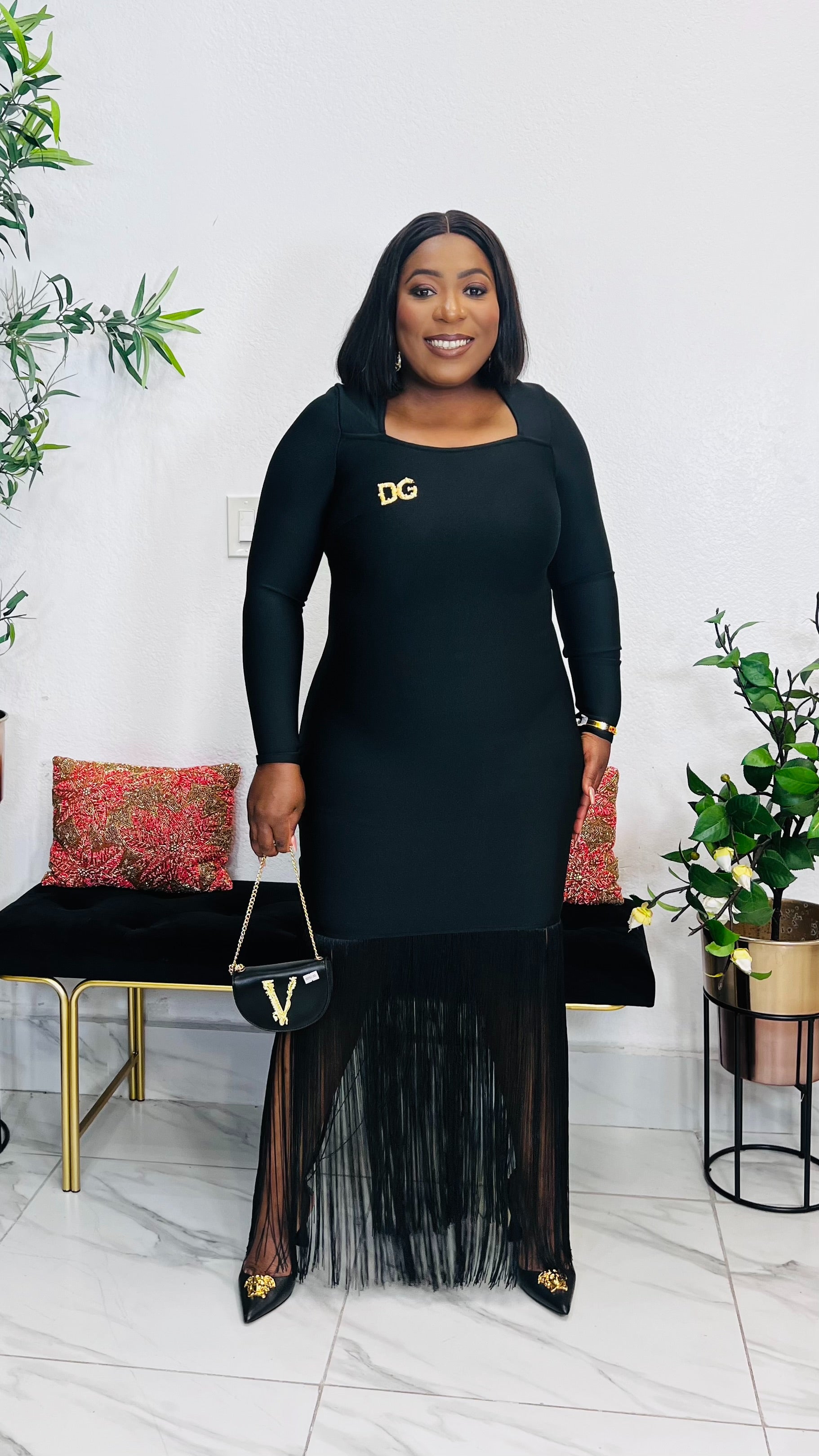 Turn every entrance into a moment with our Valencia Fringe Bandage Midi Dress. Expertly tailored from high-stretch bandage fabric, Valencia smooths, sculpts, and supports your curves while keeping you comfortable. The long sleeves and clean neckline offer a classy, minimal finish—but the magic lies in the dramatic fringe hem. It sways beautifully with every movement, adding height, shape, and a touch of runway glamour. Sleek, bold, and irresistibly chic, this dress blends sophistication with confidence. Perfect for birthday celebrations, night events, romantic dinners, parties, and holiday glam—Valencia will turn heads every time. Brooch and accessories pictured are styling suggestions only, not included.  Premium stretch bandage fabric Model is 5”6 wearing size LARGE Sculpting & body-defining fit Statement fringe hem detail Long sleeves for a classy silhouette Midi length Back zip  Breathable, comfortable stretch True to size: order your regular size Body-hugging fit for a snatched silhouette High stretch accommodates curves Perfect body contour without tight restriction If between sizes: size up for easier movement   STYLE NOTES “Pair with gold or rhinestone accessories for a luxurious, red-carpet finish.”