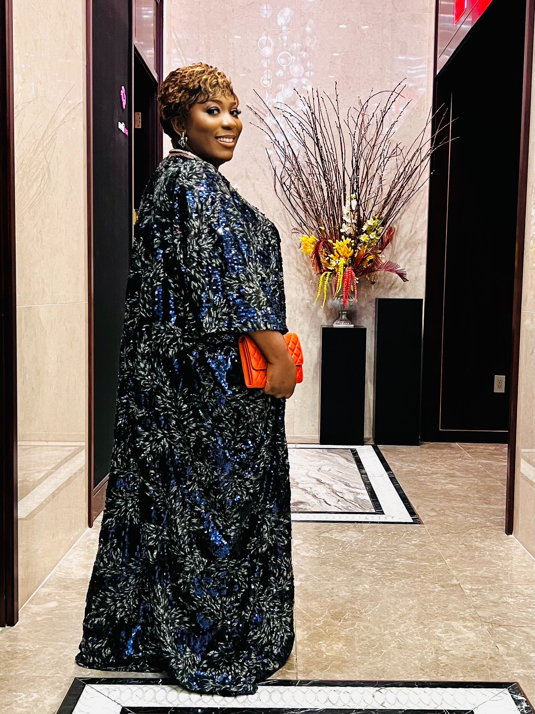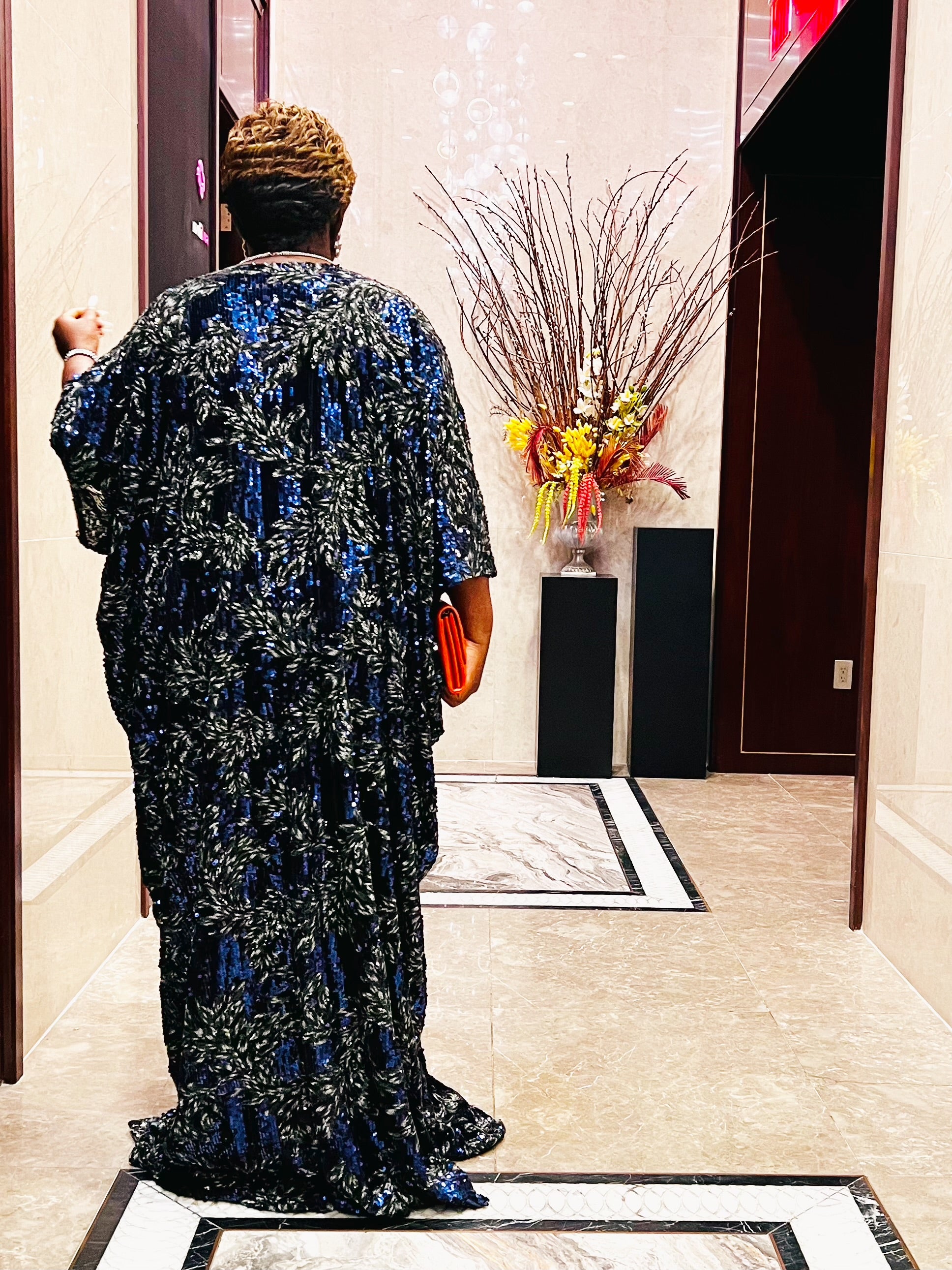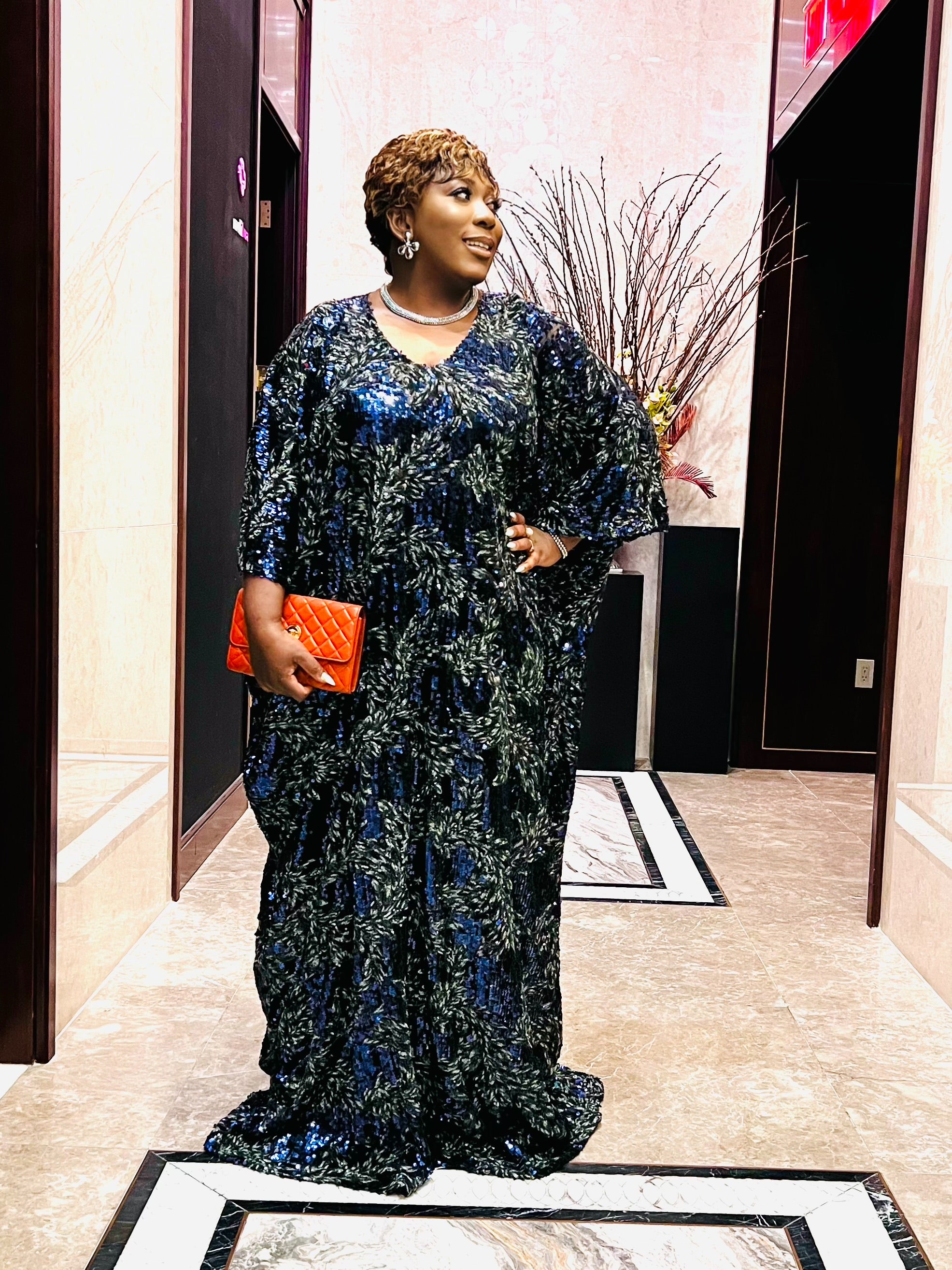 Elevate your evening wardrobe with our NORA V-NECK SEQUIN LACE KAFTAN MAXI DRESS in Navy Blue. The intricate sequin lace detailing and elegant V-neckline offer a touch of sophistication and glamour, perfect for any special occasion. Make a statement with this luxurious and exclusive dress. Free Fitting  Oversized Dress  True To Size  Model is wearing Large