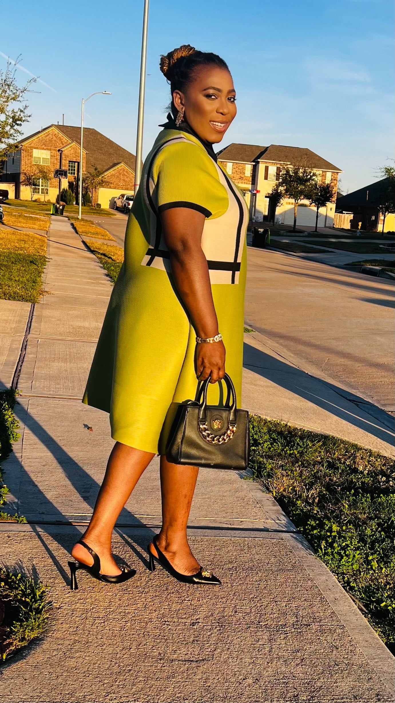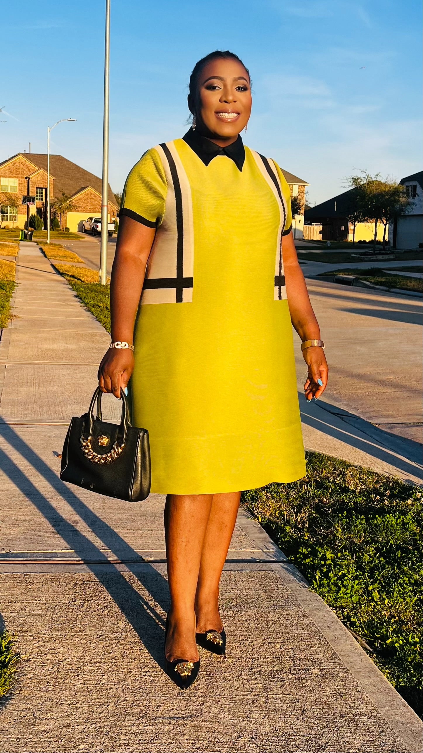 The Novara Pleated Miyake Dress is where architectural texture meets radiant confidence. Crafted from luxe Miyake-style pleated fabrication, this statement piece is lightweight, breathable, and beautifully structured to hold its sculpted silhouette while allowing effortless movement.   Designed in a vibrant citron hue that commands attention, Novara features a polished contrast collar and sleek vertical accents that elongate the frame for a streamlined, elevated finish. The relaxed shift cut flatters without clinging, making it perfect for power meetings, church, brunch, or any moment you plan to own.