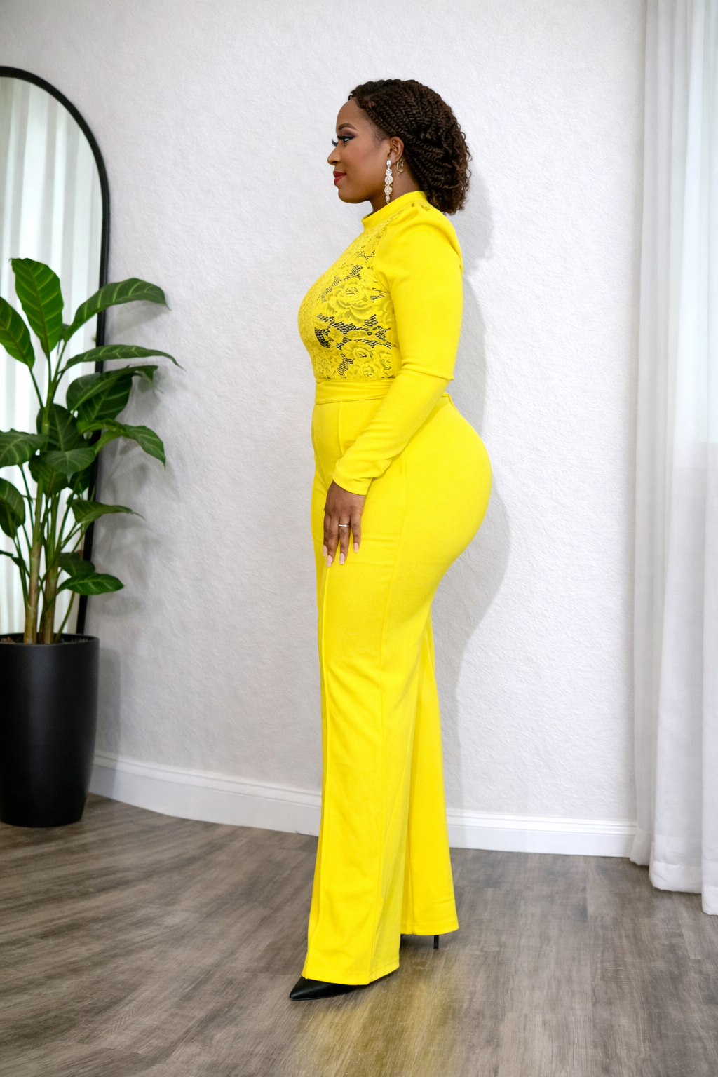 The Prescott Lace Sequin Jumpsuit in Lemon features a round neckline and intricate lace, complemented by a mid-sequin bodice. With stretchy fabric (95% Poly/5% Spandex), puff long sleeves, and a wide-leg design, it offers comfort without sacrificing style. The included self-tie belt enhances the silhouette, suitable for various occasions. Inseam measures approximately 36 inches. Round Neckline Lace and sequins Bodice Top Puff Longs Sleeve  Center Back Zipper Matching Self Tie Belt Included Wide Legs Stretchy Inseam: 36' Approx. Fabric: 95% Poly / 5% Spandex