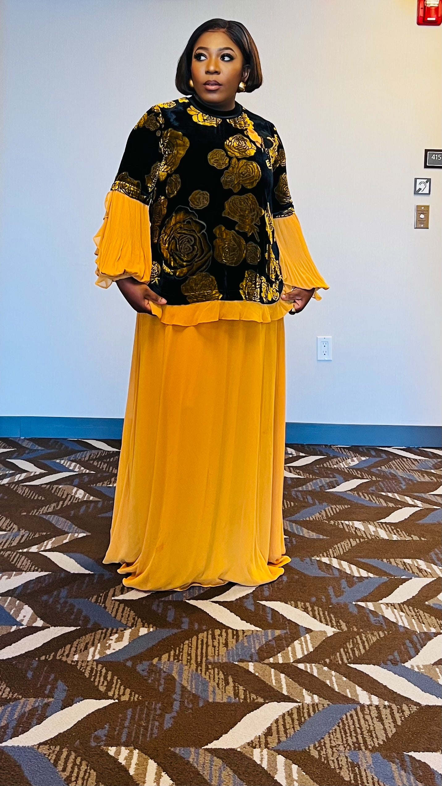 Featuring a black velvet-finish top adorned with rich gold floral motifs, this piece is elevated by dramatic sheer chiffon sleeves in a vibrant mustard hue for a striking contrast.   The flowing mustard chiffon maxi skirt adds softness and movement, creating a balanced silhouette that feels both powerful and graceful. Designed with a relaxed, modest fit and statement proportions, this look is perfect for women who love fashion with presence—ideal for special occasions, celebrations, worship, or standout daytime events.   This is not just an outfit — it’s wearable confidence.