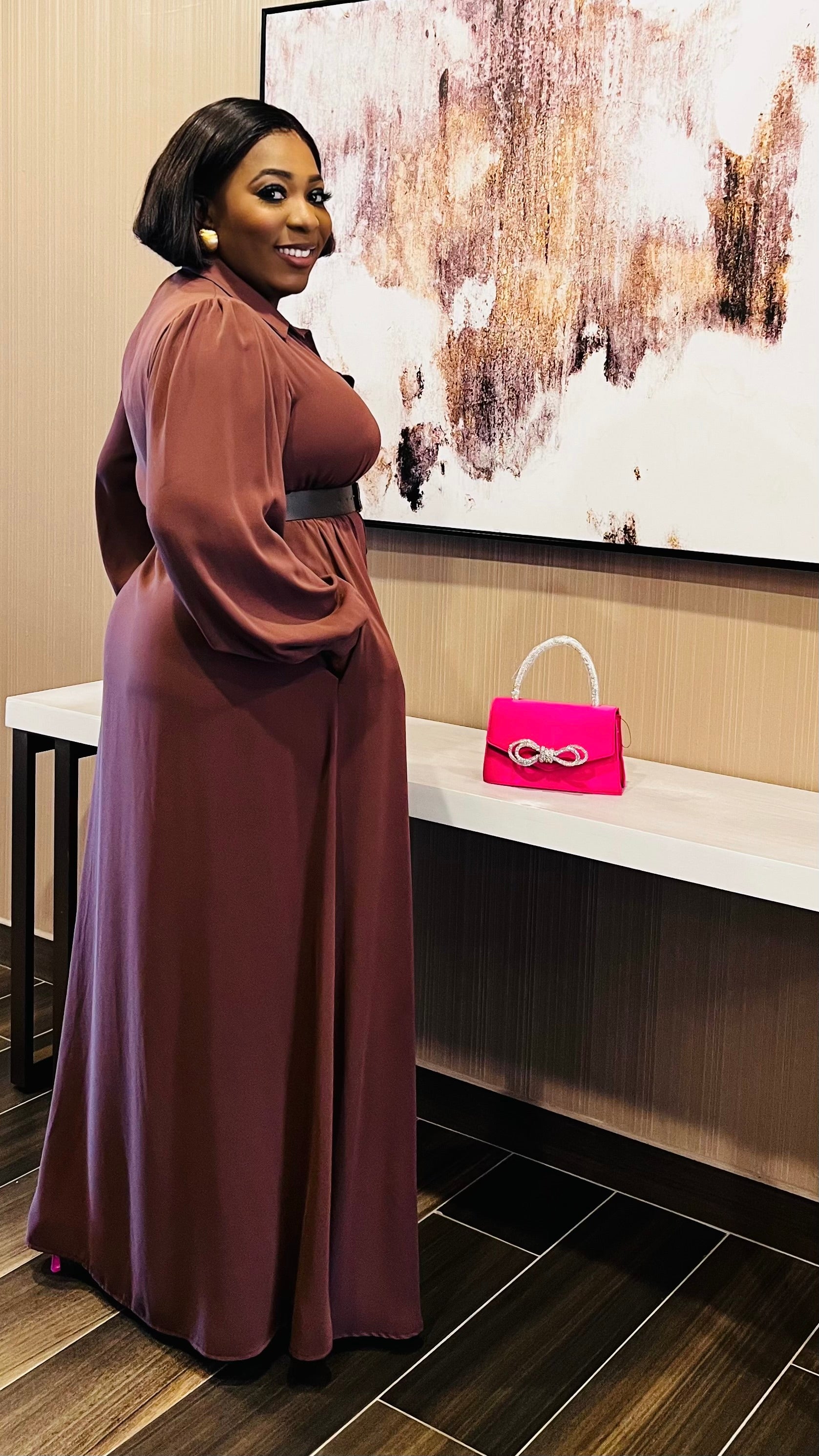 This full-length shirt dress features a structured button-down front, softly puffed long sleeves, and a flattering detachable belt that defines the waist without restricting movement.   A warm, luxe neutral that exudes understated luxury. The brown shade offers a grounded, earthy elegance — ideal for classic styling and year-round wear Delicate embroidered floral accents on the bodice add a subtle feminine touch, while the flowy silhouette creates a graceful drape that flatters every body type. Finished with functional side pockets, this dress is equal parts practical and polished — perfect for brunch, events, church, dinners, or elevated everyday wear.   Dress it up with heels and a statement bag or keep it relaxed with flats — either way, it delivers confidence and class.