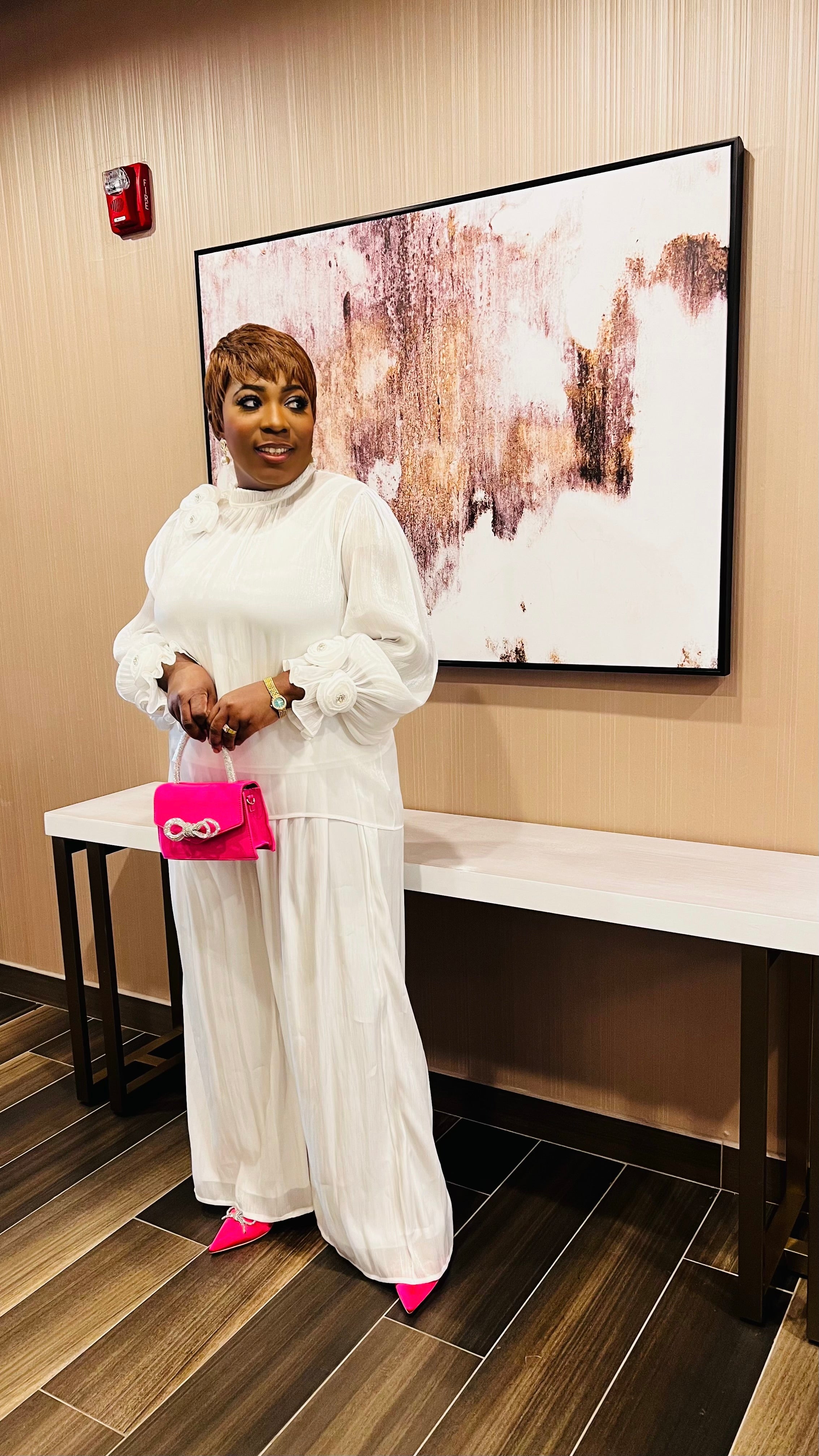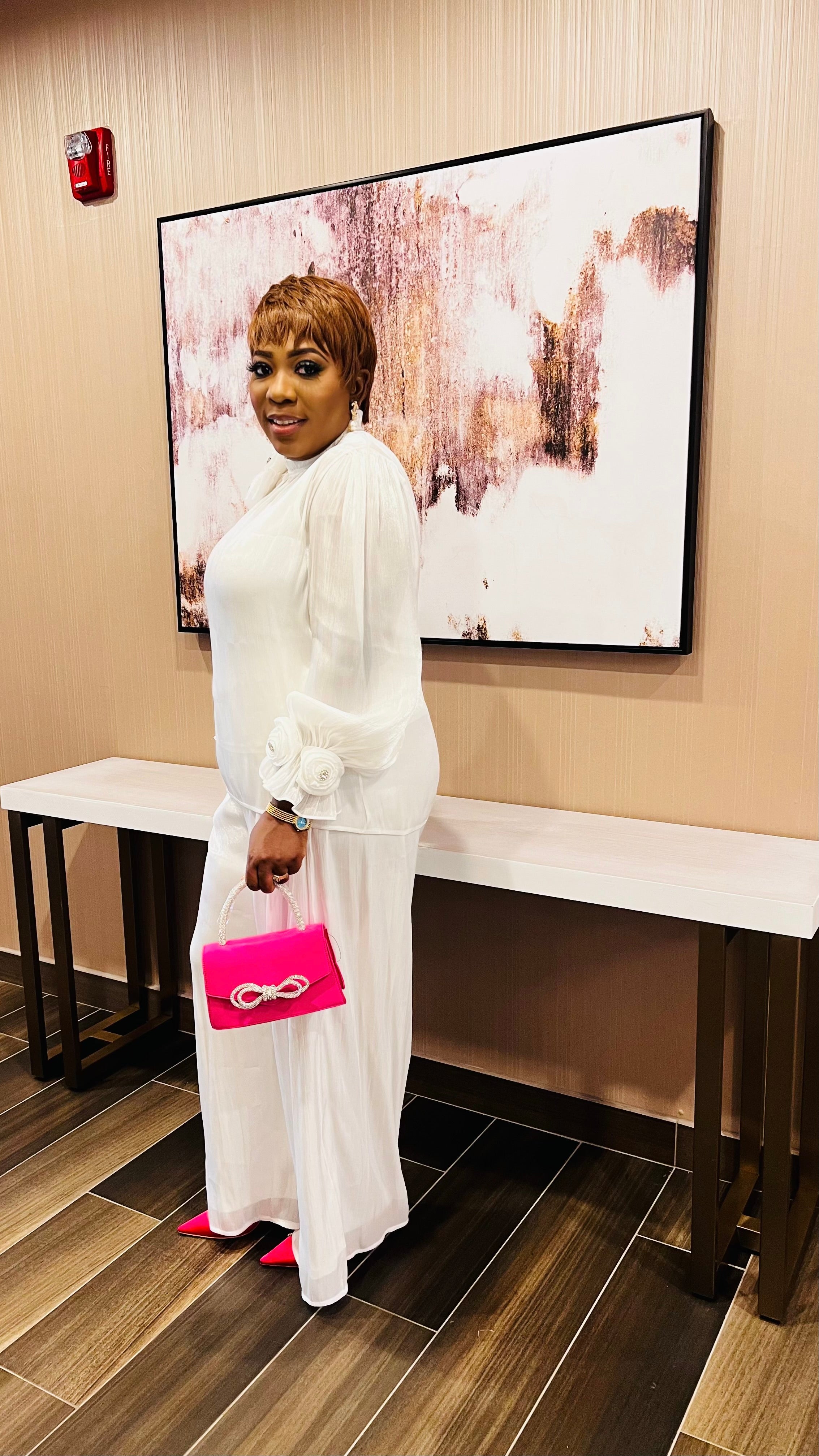 Crafted in a flowing, sheer-overlay silhouette, this maxi dress features delicate gathered detailing and sculpted rosette accents at the sleeves that feel almost hand-crafted. The high neckline adds an air of grace, while the airy drape moves effortlessly with every step, creating a light, floating effect.   Designed for the woman who loves quiet luxury with intentional detail, this piece is perfect for elevated occasions, celebrations, church, or moments when softness speaks louder than boldness.   Style it with statement heels or a pop-color bag for contrast — the dress remains the moment.