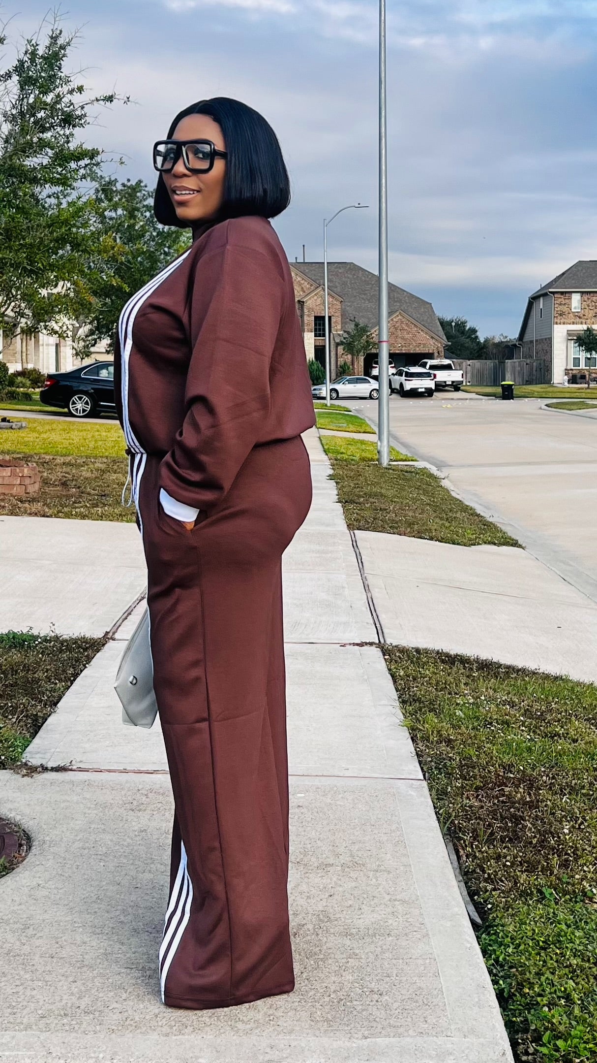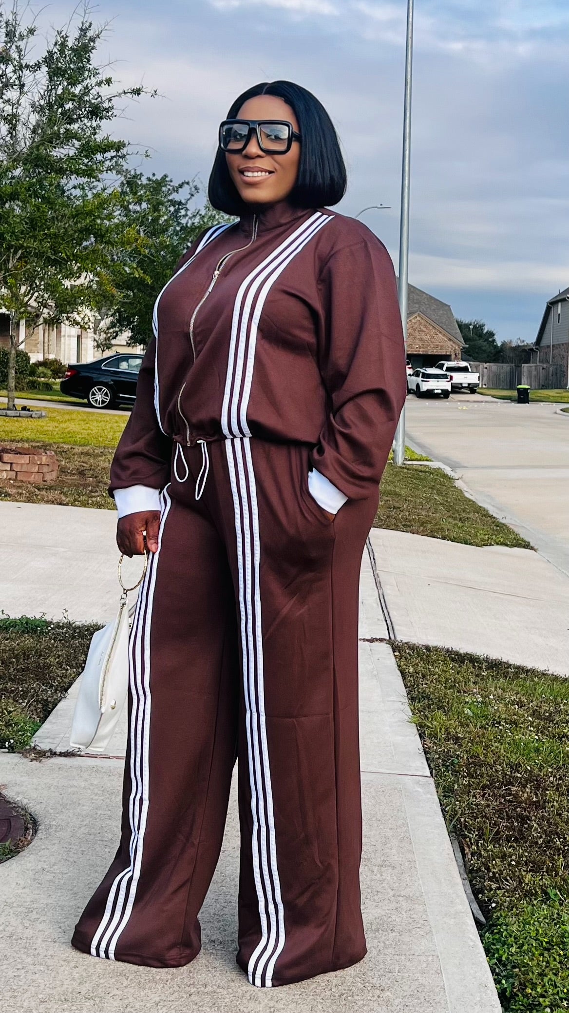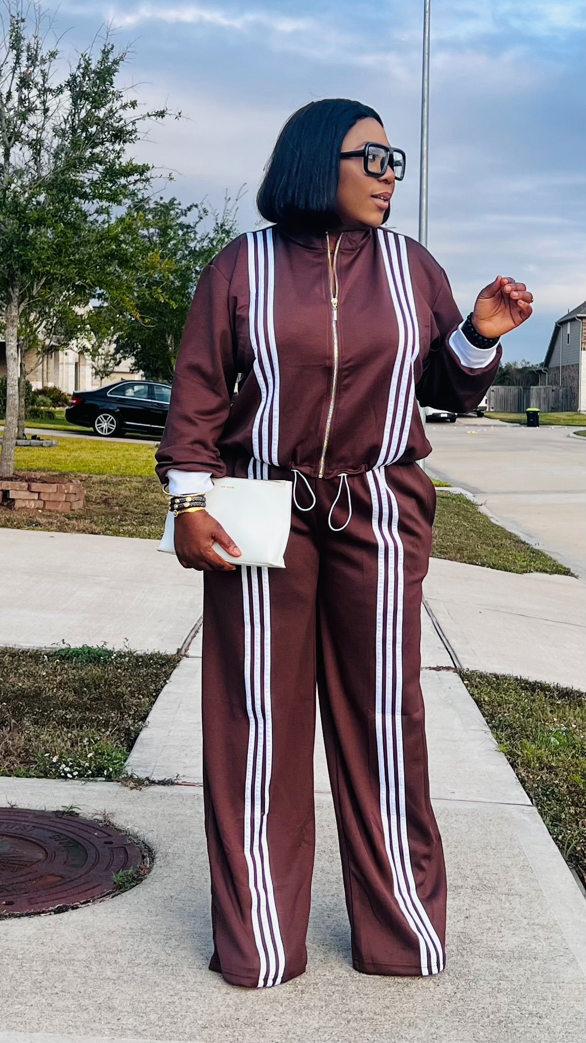 Step into effortless sophistication with the ZARIA Stripe Luxe Set, your new go-to for elevated casual chic. This two-piece ensemble features a relaxed zip-up top and wide-leg pants, both designed in a rich, smooth fabric that drapes beautifully on every figure. Bold contrasting vertical stripes elongate the silhouette, giving you that tall, sleek, confident look. The top includes a functional zipper and adjustable drawstring waist for the perfect fit, while the matching trousers offer a comfortable, flowy finish that moves with you. Whether you’re heading out for errands, brunch, travel days, or a casual luxe moment, this set keeps you polished without trying too hard. Available Colors:🖤 Black , 🤎 Brown FIT : Runs True To Size ( Model is wearing size Large )  Key Features: Soft, breathable fabric Ultra-flattering vertical stripe detail Zip-front jacket top Tall Ladies Friendly  Adjustable drawstring waist Wide-leg relaxed-fit pants Pockets for everyday convenience   Perfect for STYLETITTUDE babes who want comfort and class in one statement look.
