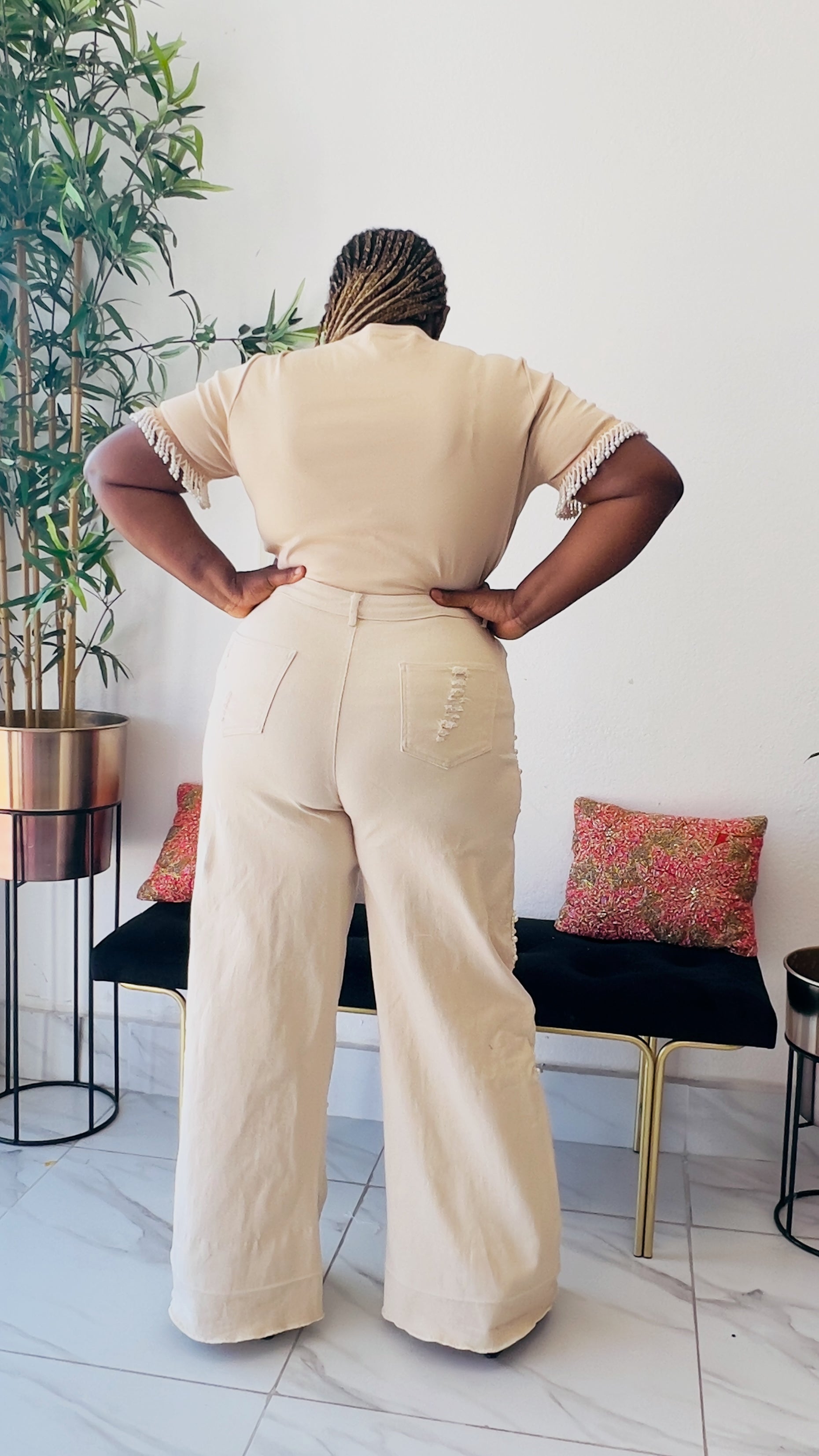 Indulge in luxury with our TWINKLE PEARL FRINGE WIDE LEG DENIM / JEAN PANT. The high waist and adorable pearl button detail elevate these pants to a new level of sophistication. Feel elegant in the nude color, perfect for any occasion. Experience the perfect blend of style and comfort. Very stretchy  Model is wearing size Large  Inseam “31