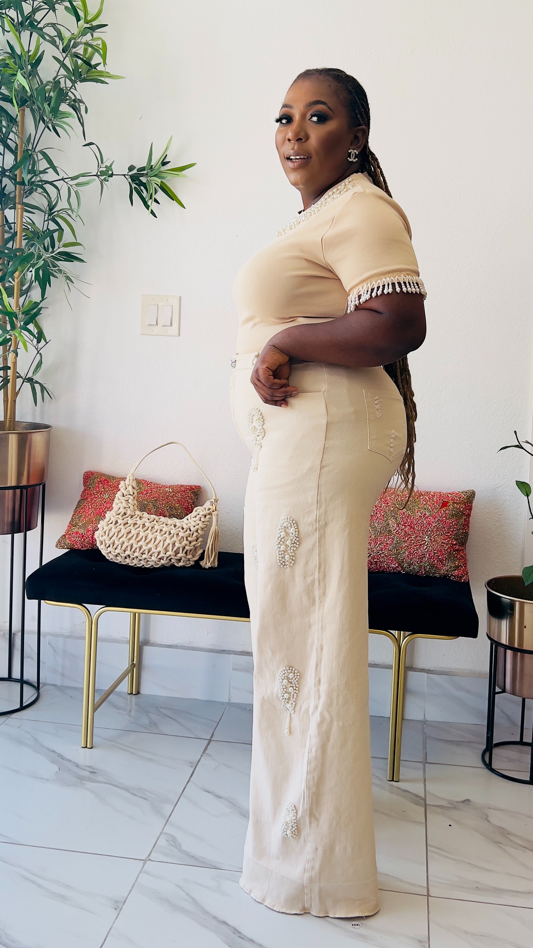 Indulge in luxury with our TWINKLE PEARL FRINGE WIDE LEG DENIM / JEAN PANT. The high waist and adorable pearl button detail elevate these pants to a new level of sophistication. Feel elegant in the nude color, perfect for any occasion. Experience the perfect blend of style and comfort. Very stretchy  Model is wearing size Large  Inseam “31