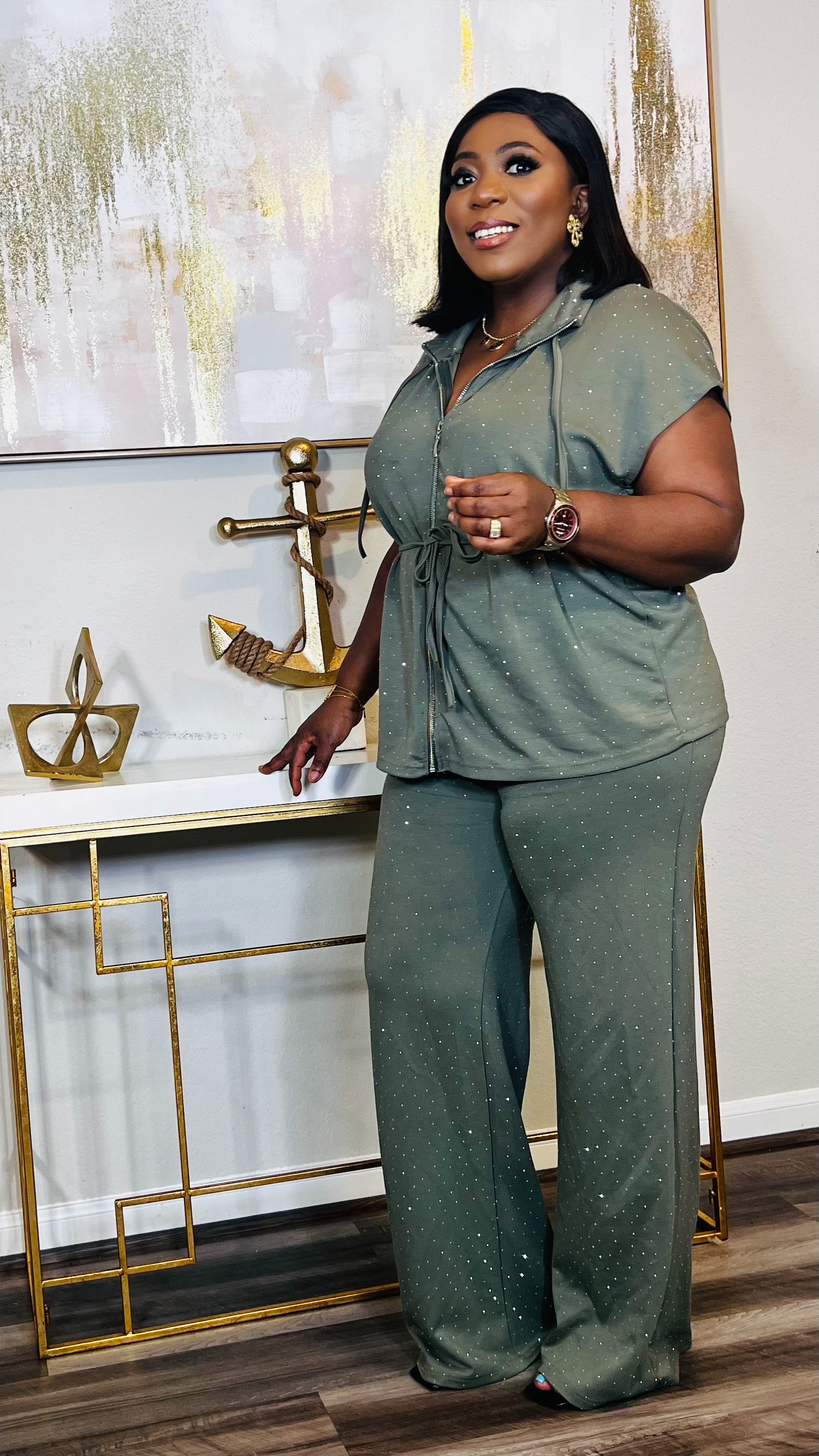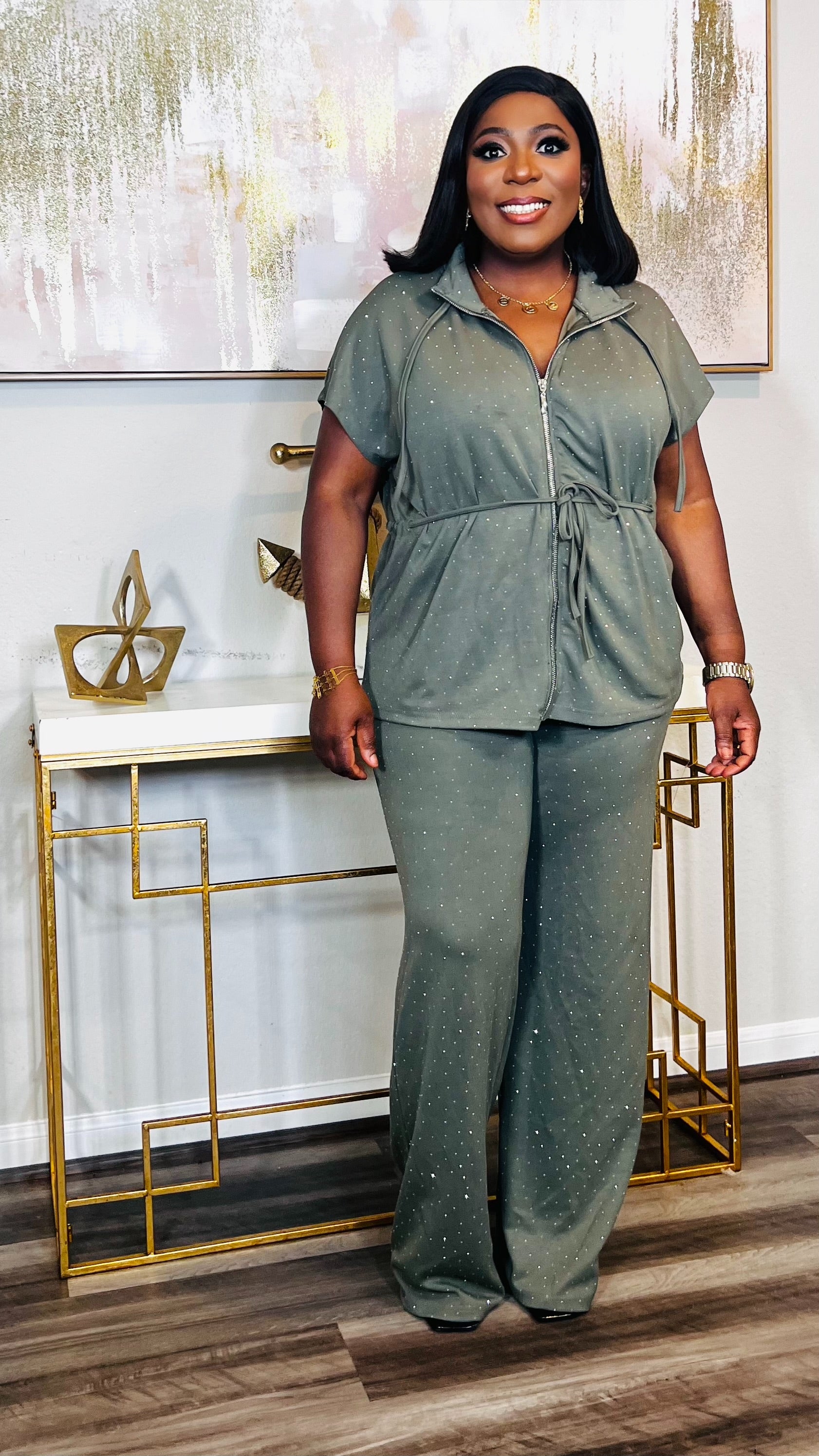 The Emilia Rhinestone 2-Piece Set is a comfortable yet stylish outfit designed for everyday wear with a subtle touch of sparkle. The top features a zip-front design with a soft collar and short sleeves, finished with delicate rhinestone accents scattered throughout the fabric. A drawstring waist allows you to adjust the fit, creating a flattering shape while keeping the look relaxed and easy.   The matching wide-leg pants provide a smooth, comfortable fit that moves effortlessly throughout the day. The soft olive tone gives the set a fresh, earthy feel that pairs easily with heels, sandals, or casual flats. Whether you’re stepping out for errands, meeting friends, or enjoying a relaxed day out, this two-piece set delivers effortless style and comfort. Details Two-piece matching set Zip-front short sleeve top Adjustable drawstring waist Rhinestone detailing throughout Wide-leg pants Comfortable, relaxed fit   Model Info Model is 5’6” wearing size LARGE  True To Size / Amazing Stretch