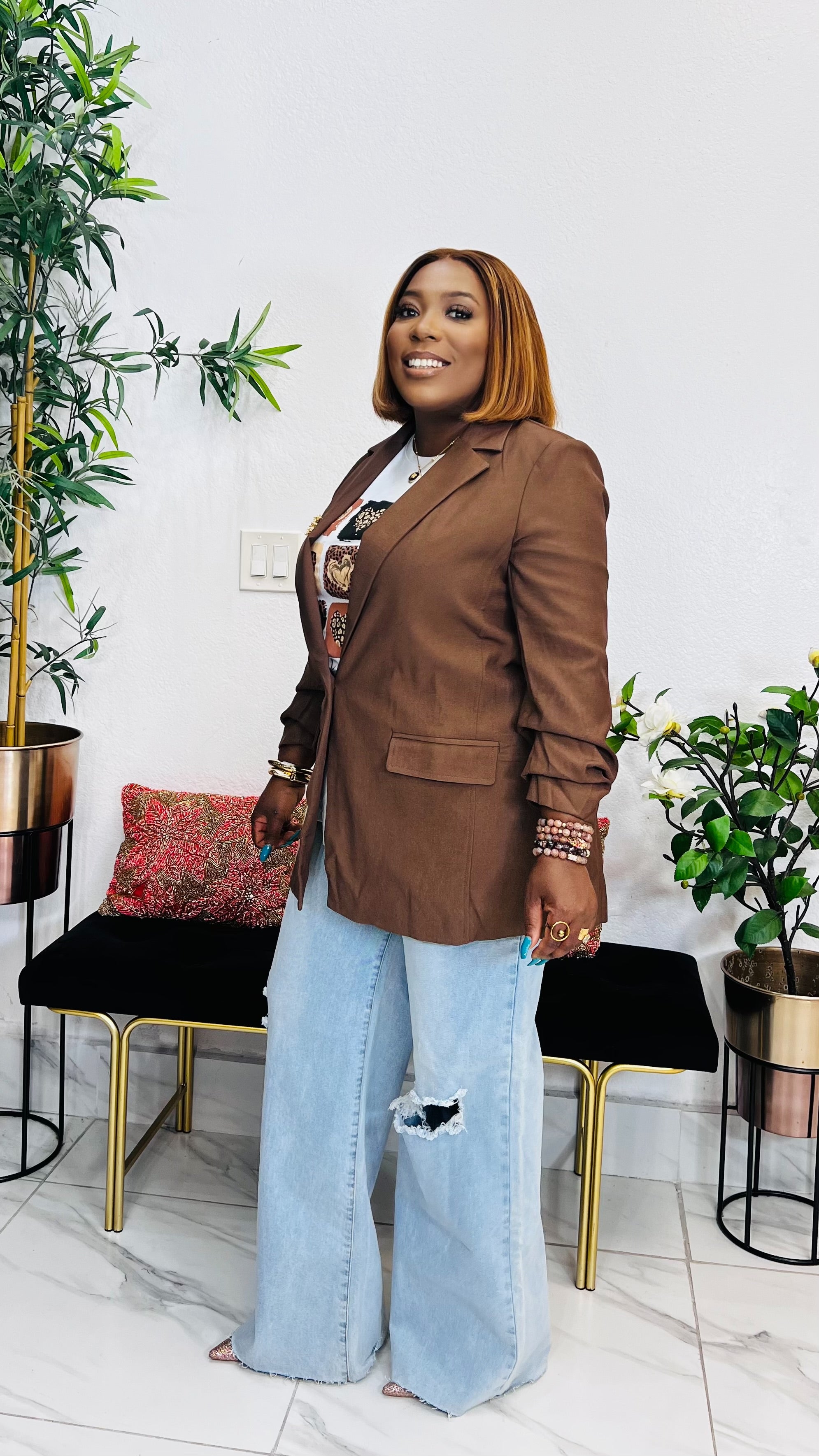 COCOA TAILORED LINEN BLAZER RUCHED SLEEVE