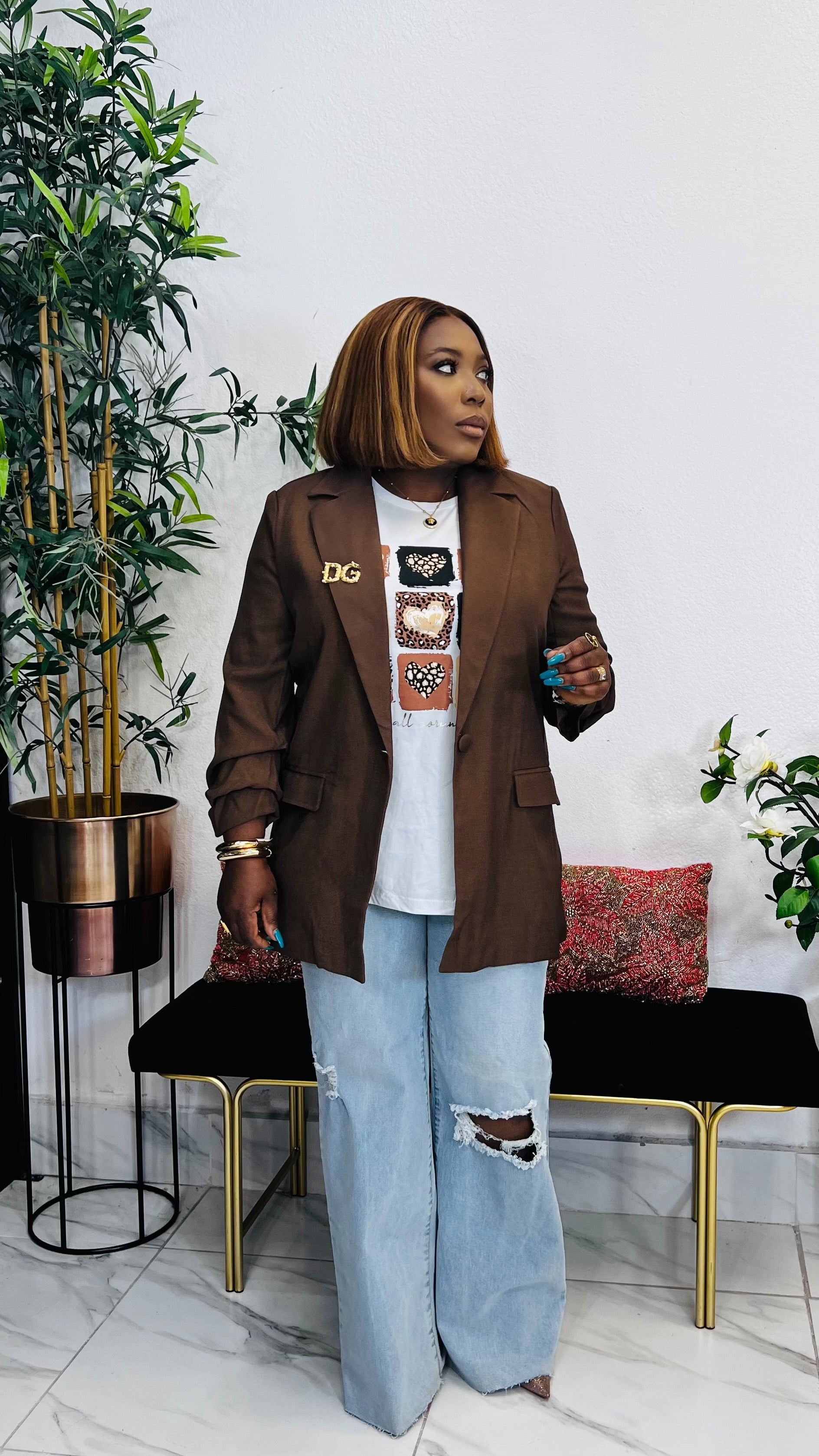 Designed in a rich brown hue that pairs effortlessly with everything, this blazer brings polished simplicity to any look. The clean, structured silhouette and chic three-quarter sleeves make it perfect for work, brunch, or layering over your favorite statement pieces.   Soft, versatile, and timeless, it’s the go-to blazer every stylish woman needs in her closet. Let it elevate denim, trousers, dresses, or your everyday basics with ease and elegance.