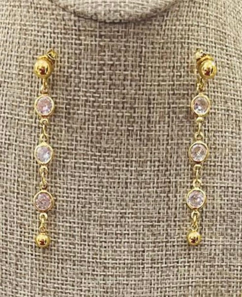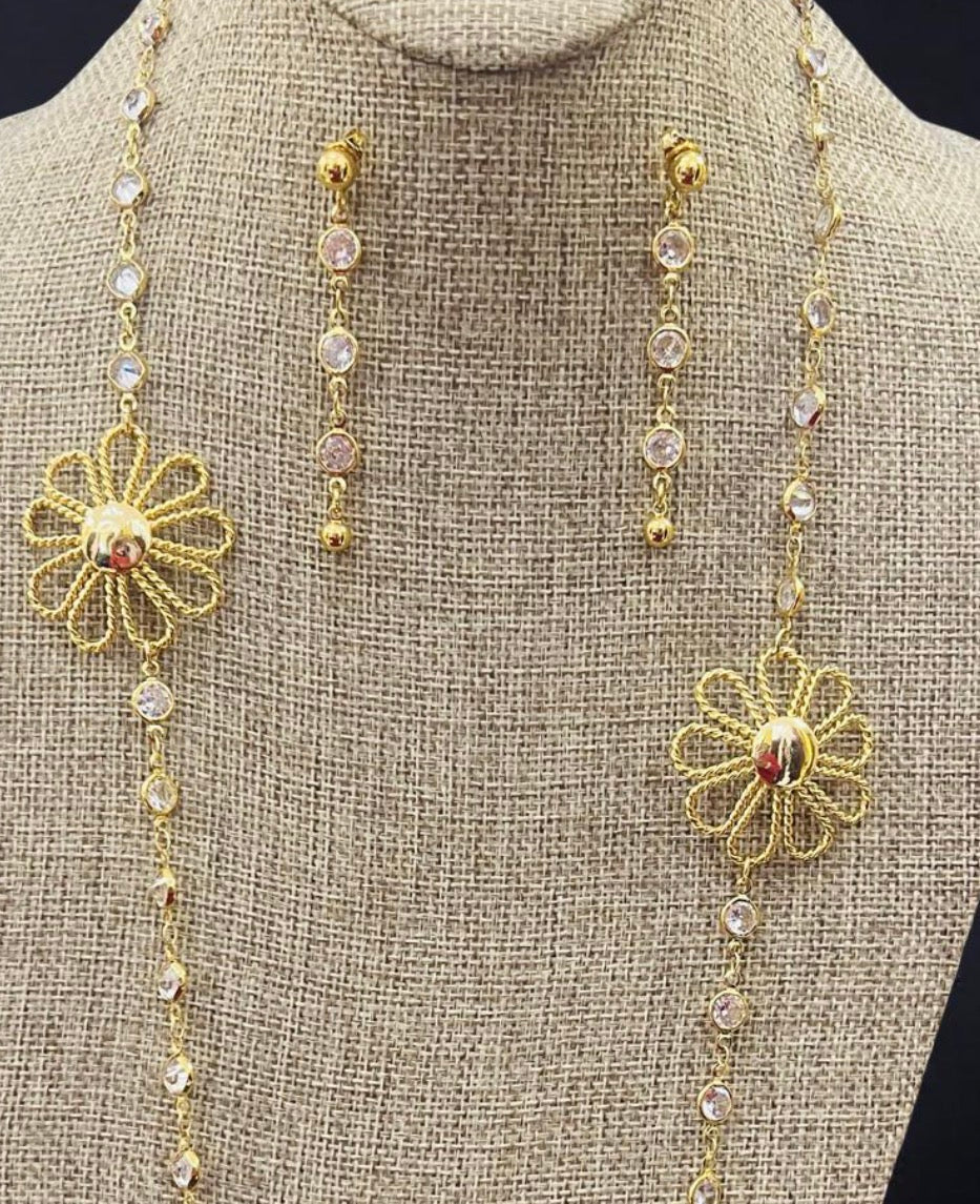 Turn heads with this stunning Golden Bloom Necklace/ Earrings Set, featuring a long gold chain adorned with crystal accents and two elegant flower charms. The matching drop earrings add the perfect touch of sparkle for a polished, feminine look. Lightweight, versatile, and effortlessly chic — perfect for any occasion. Details: Gold-tone finish with crystal accents Non tarnish  18k gold plated  Includes matching drop earrings Lightweight and comfortable Ideal for casual or dressy looks