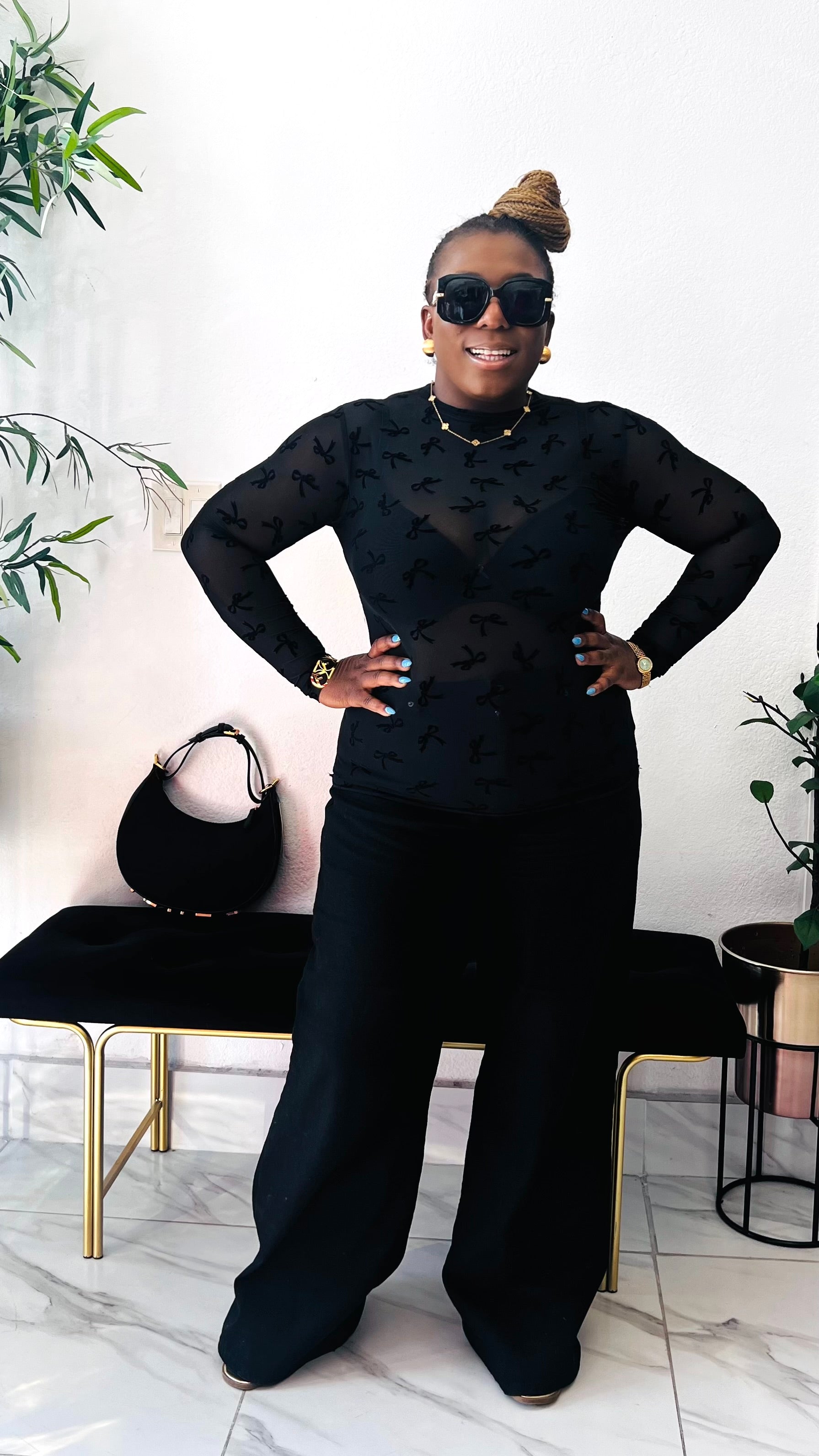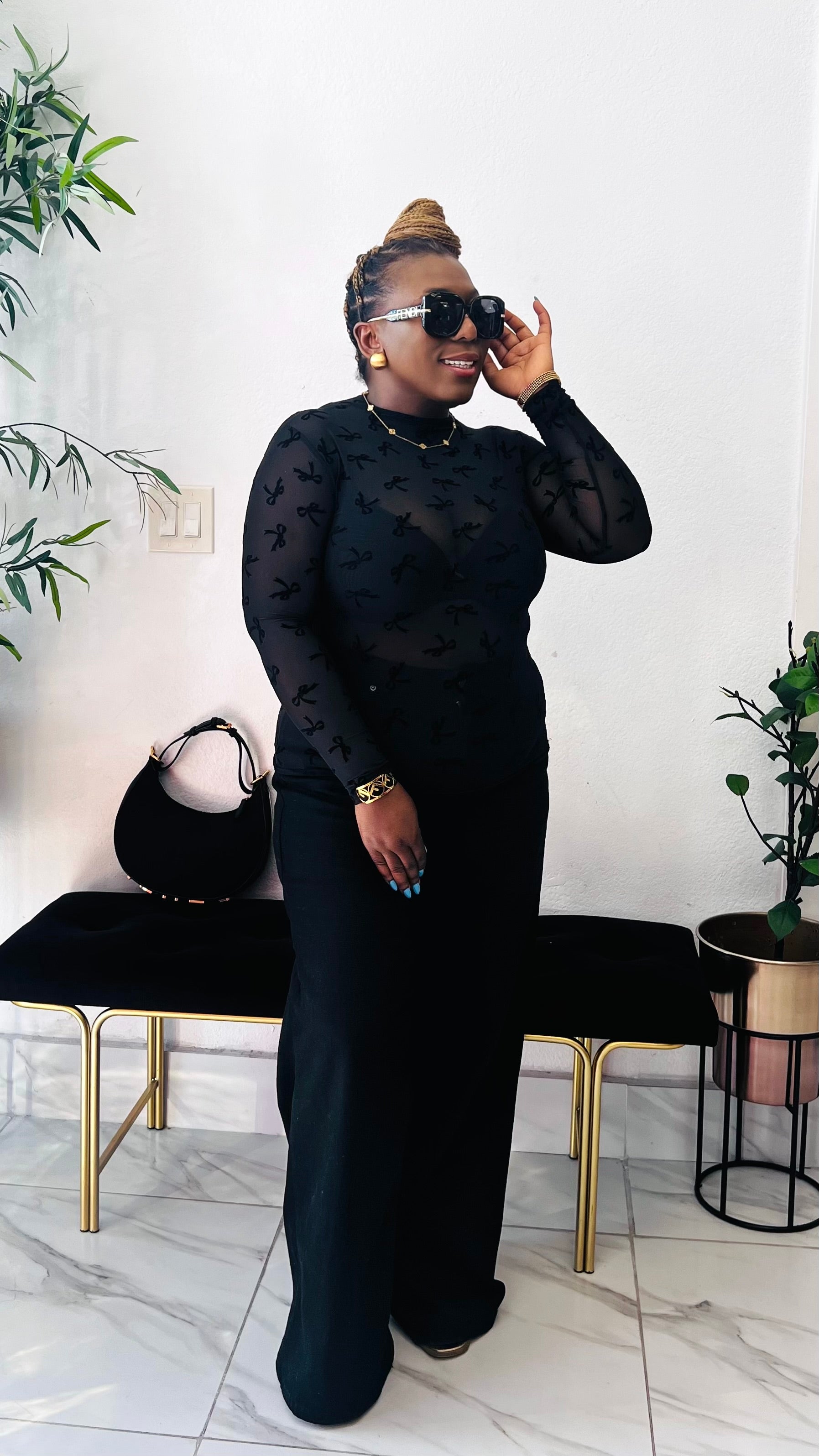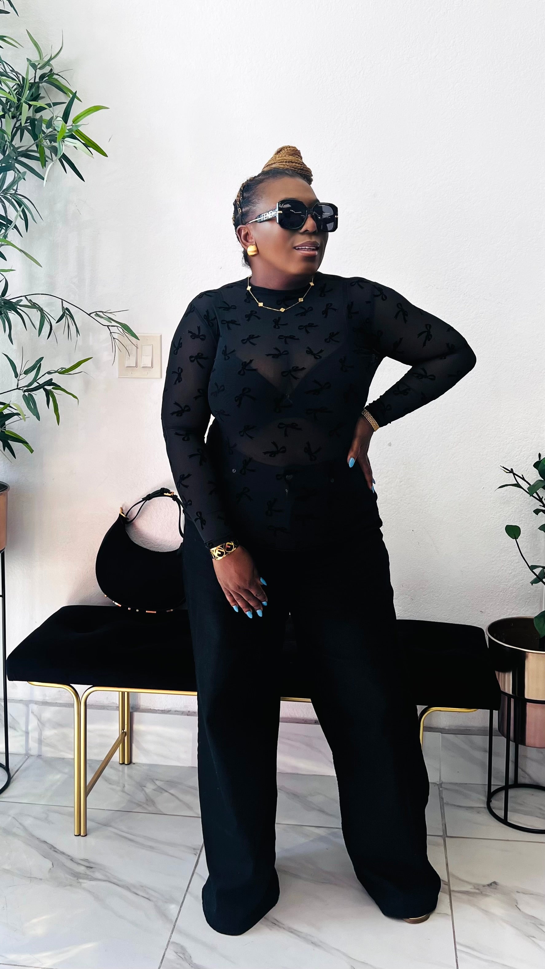 The Velvet Bow Illusion Mesh Top blends delicate detail with modern sophistication. Designed in sheer stretch mesh and finished with subtle velvet bow accents throughout, this fitted long-sleeve silhouette creates an effortlessly chic layered look. Lightweight, breathable, and flattering, it’s the perfect statement piece for styling with tailored trousers, denim, or sleek evening separates. Soft yet bold, this top delivers that refined “soft luxury” energy — ideal for elevated everyday wear or dressed-up moments. Style Details Sheer illusion mesh fabric Velvet bow textured design Fitted long-sleeve silhouette Lightweight stretch comfort True to size with flexible fit Model is wearing size Large
