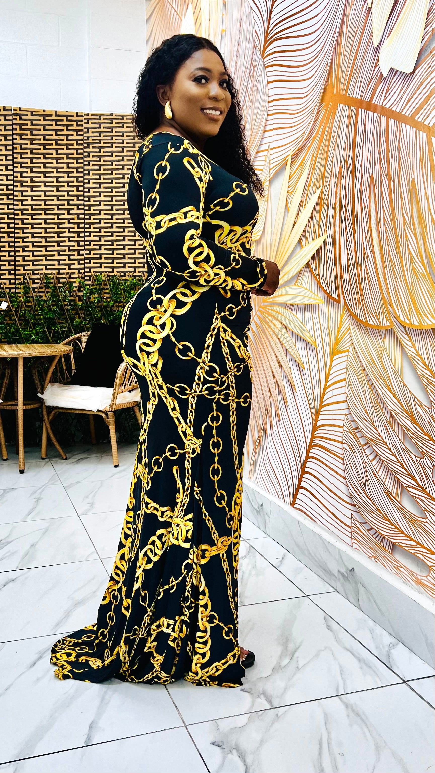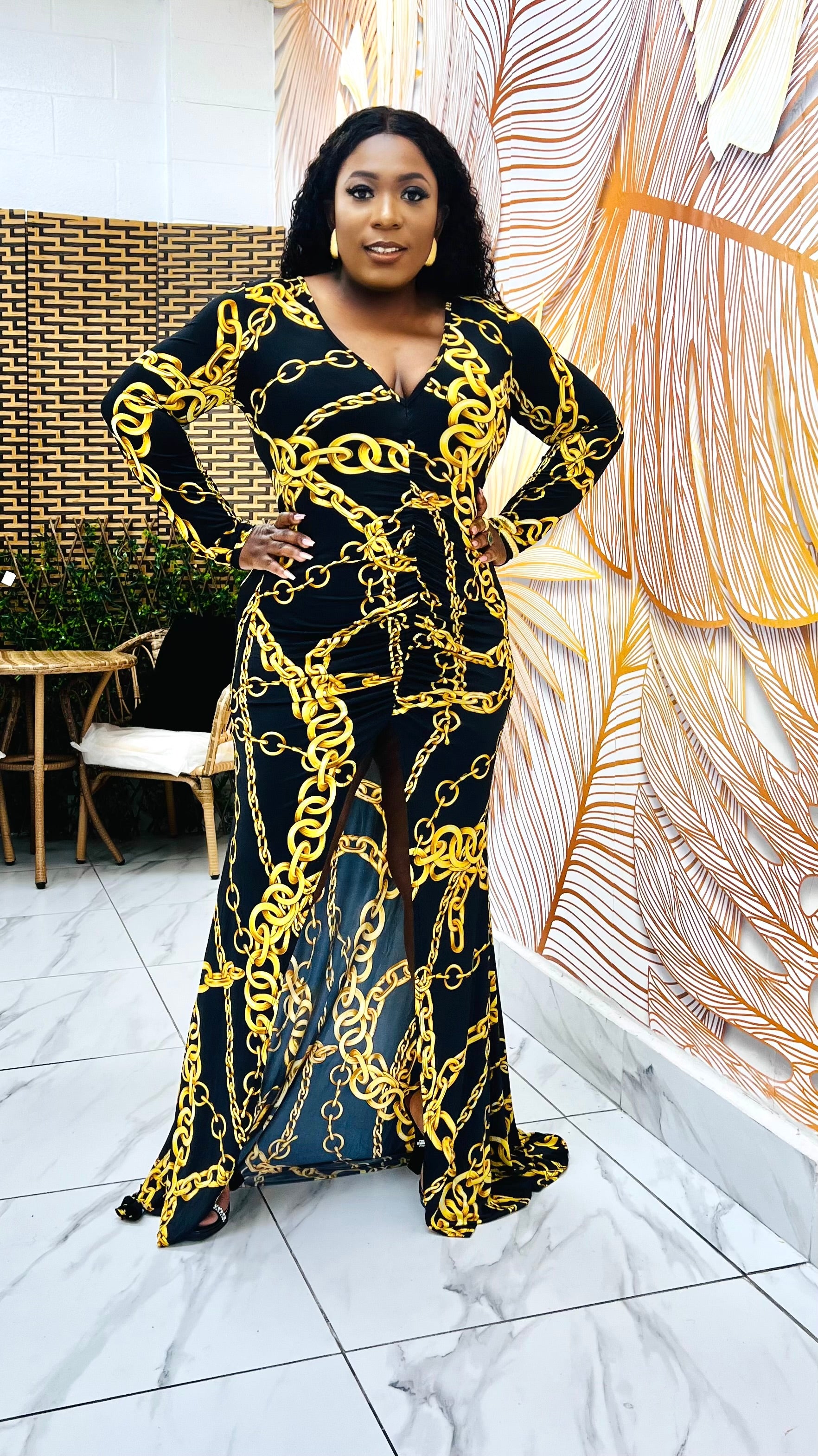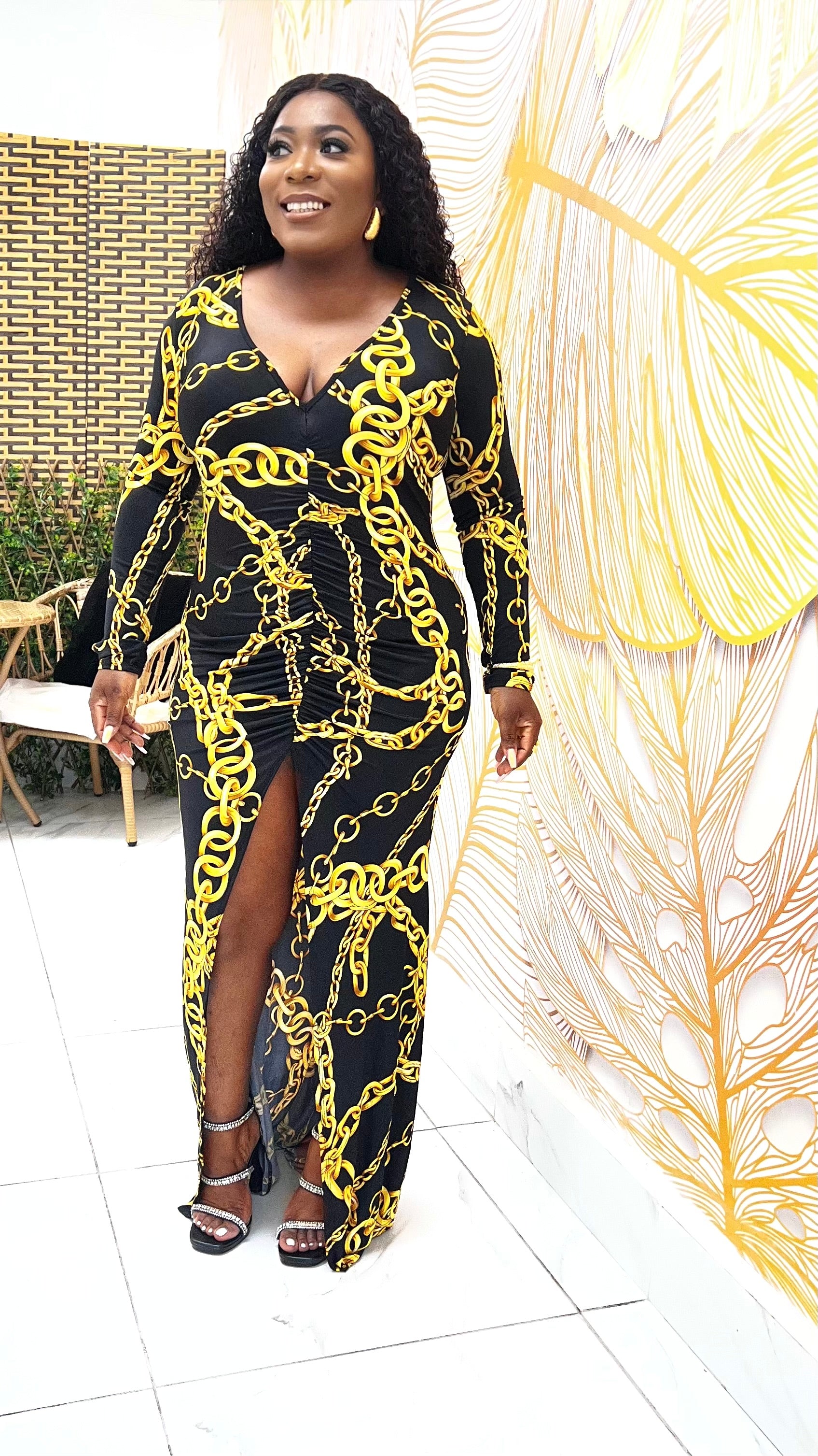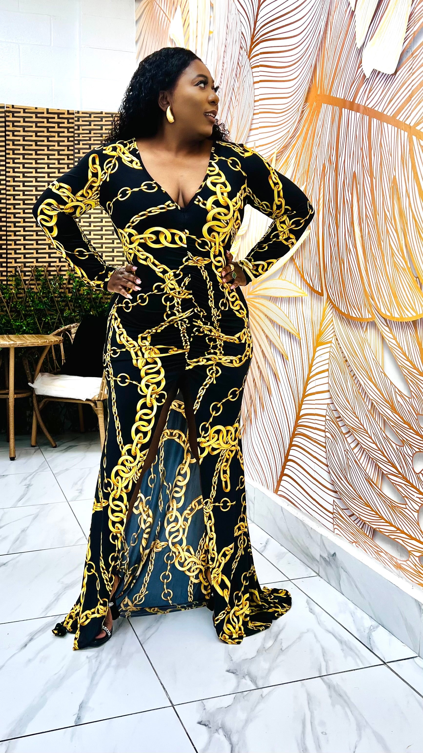 The Versara Chain Drape Maxi is a striking blend of bold pattern and sculpted elegance. Designed with a rich black base and dramatic gold chain print, this piece commands attention while remaining effortlessly sophisticated. The deep V neckline frames the silhouette beautifully, while the ruched front detail creates a flattering draped effect that enhances natural curves.   A high front slit adds movement and a touch of drama, making this dress perfect for upscale events, celebrations, or statement evenings out. Crafted from soft stretch fabric, it hugs the body comfortably while maintaining a sleek, polished look.