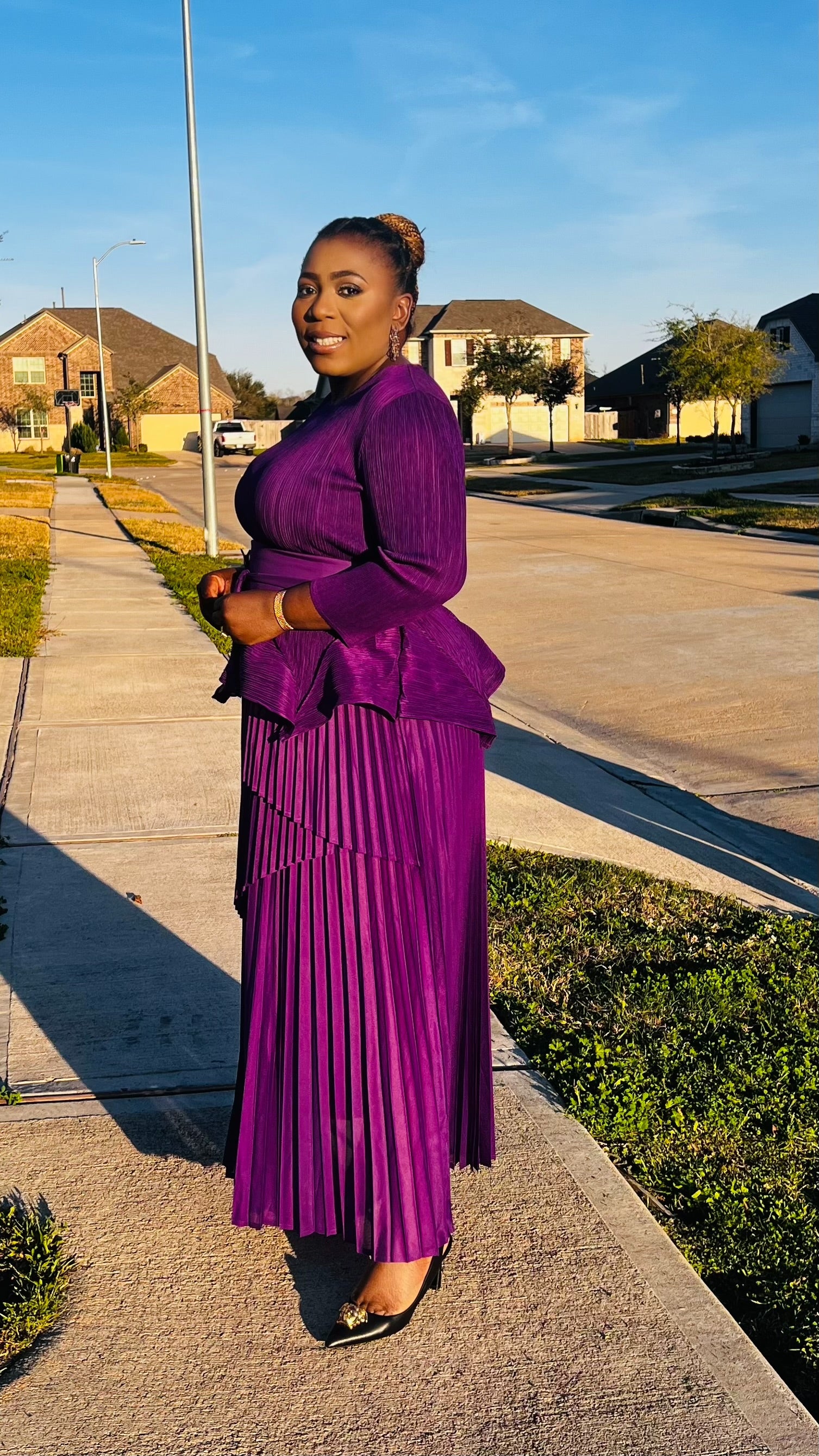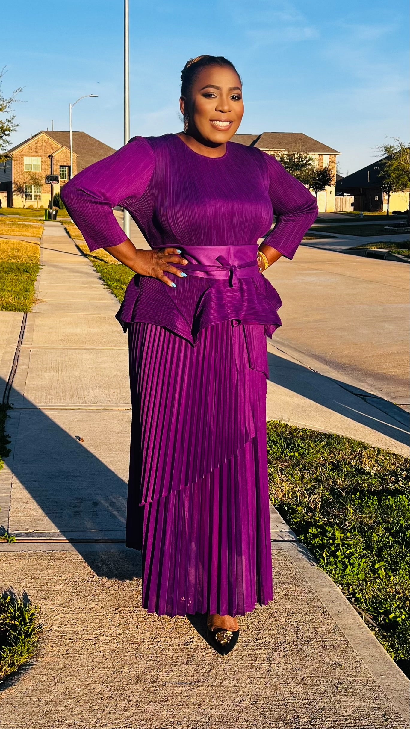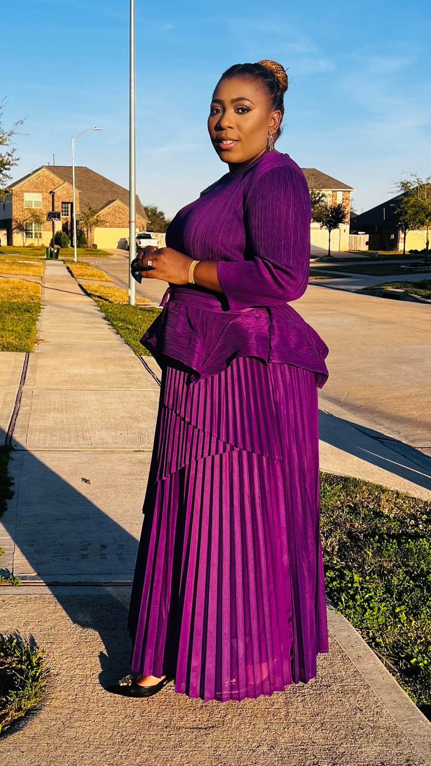 Striking 3-piece ensemble designed for women who dress with intention. Crafted from luxe Miyake-style pleated fabrication, this set includes a structured long-sleeve top, a sculpting waist belt, and a flowing pleated maxi skirt that moves with graceful drama.   The rich royal purple hue radiates elegance, while the architectural pleats create depth, texture, and effortless sophistication. The peplum-style waist detail paired with the adjustable belt defines the silhouette beautifully, and the cascading pleated skirt adds fluid movement with every step.   Set Includes: • Pleated structured top • Coordinating waist belt • Flowing pleated maxi skirt   Why you’ll love Zafira: • Lightweight, breathable Miyake-inspired fabric • Stretch comfort with structured shape retention • Elegant pleat detailing throughout • Statement color with timeless appeal • Perfect for church, special events, celebrations & elevated moments
