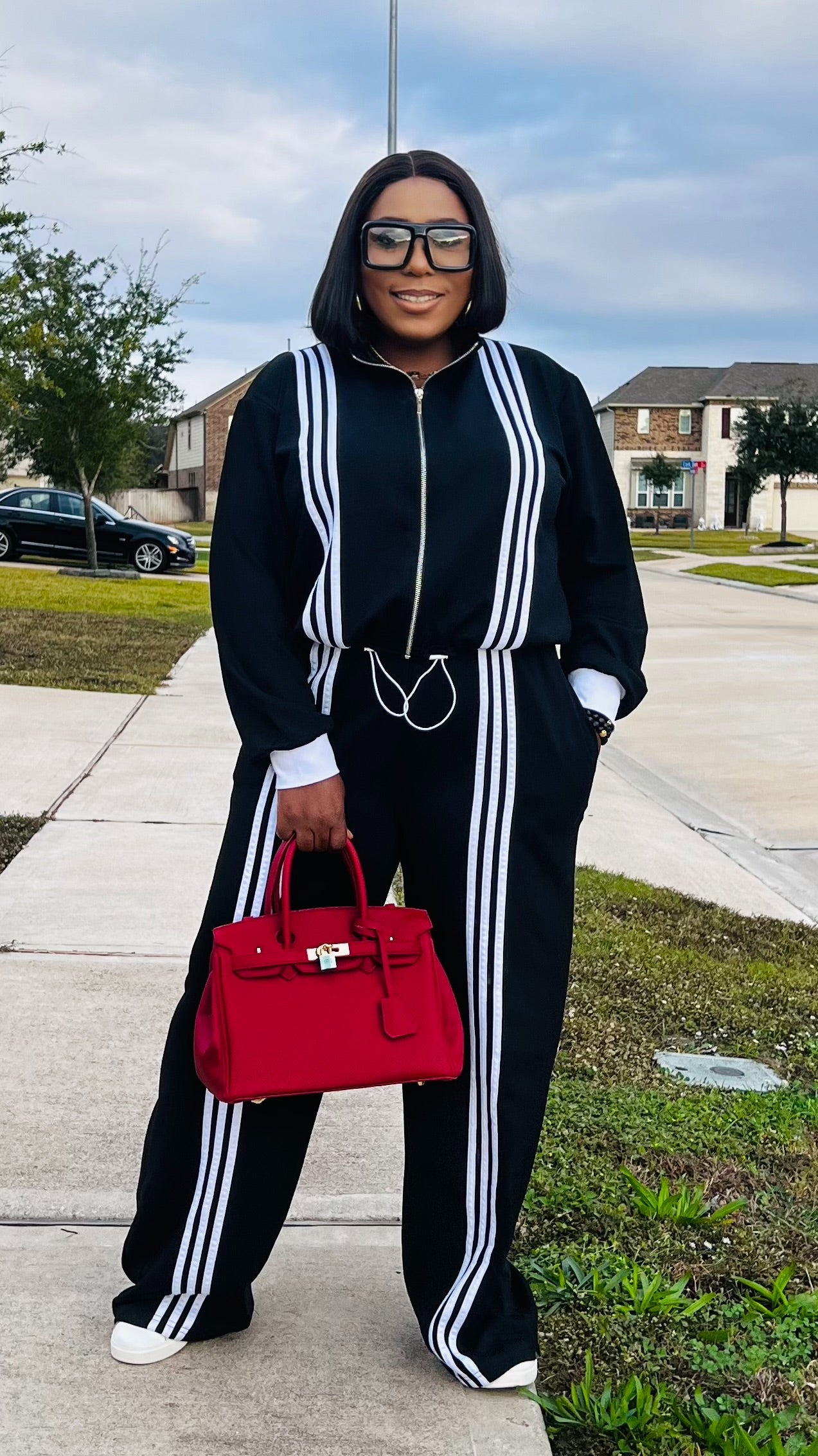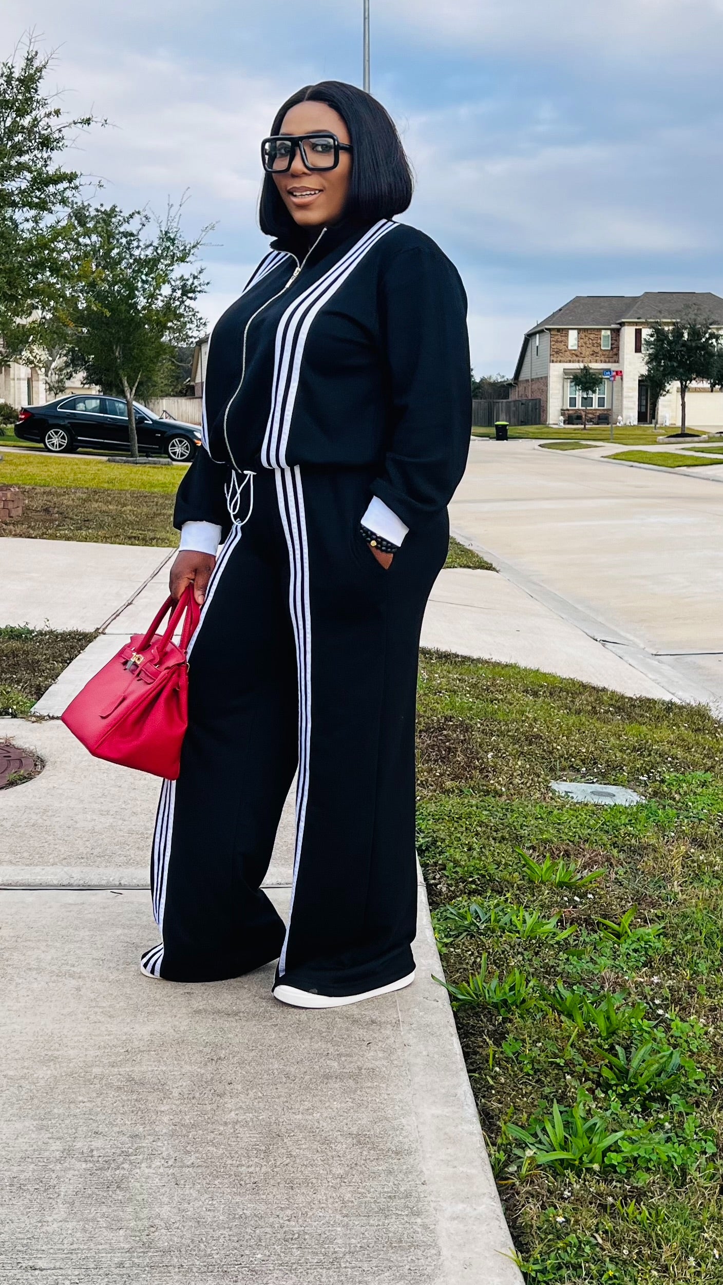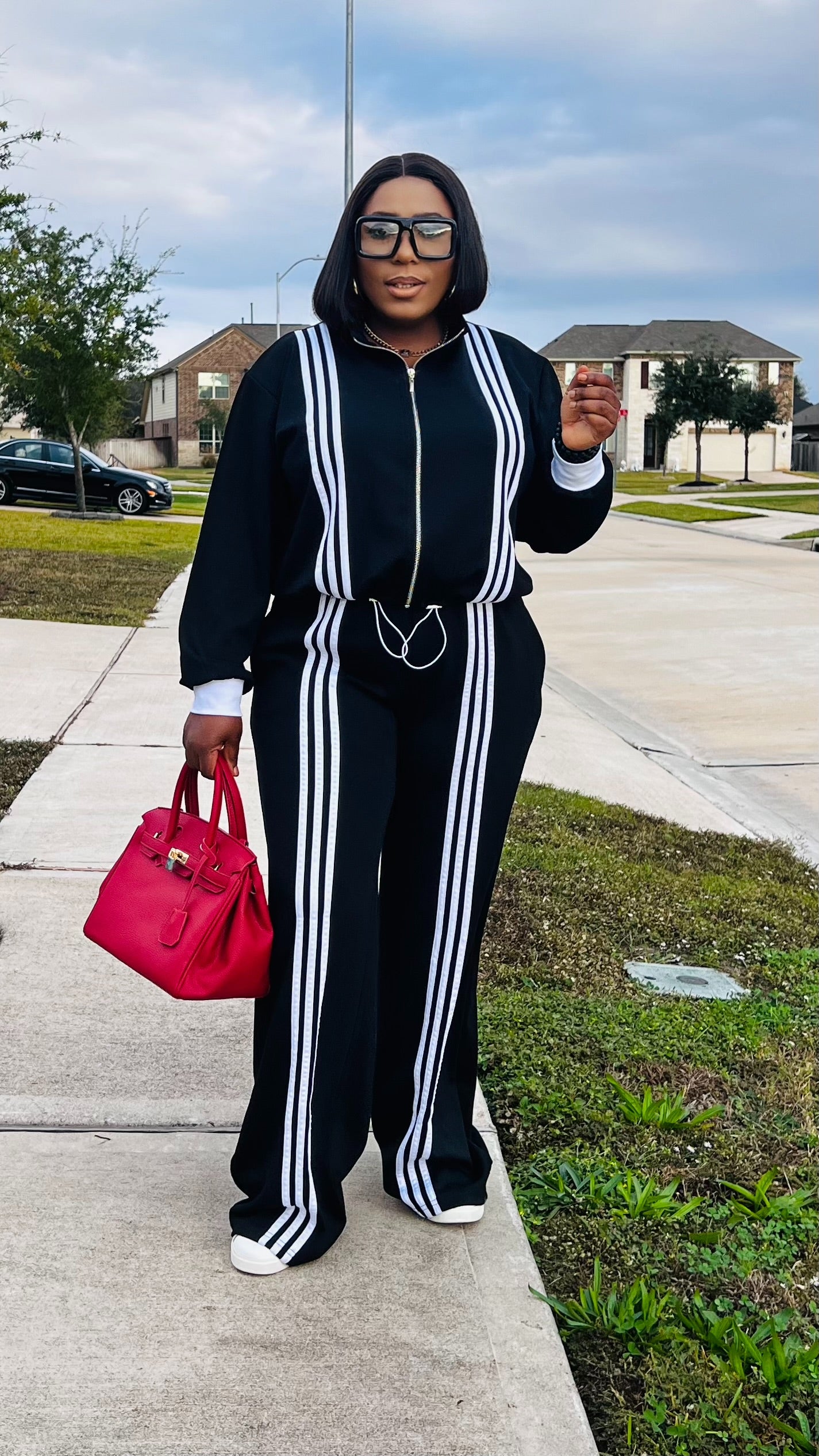 Step into effortless sophistication with the ZARIA Stripe Luxe Set, your new go-to for elevated casual chic. This two-piece ensemble features a relaxed zip-up top and wide-leg pants, both designed in a rich, smooth fabric that drapes beautifully on every figure. Bold contrasting vertical stripes elongate the silhouette, giving you that tall, sleek, confident look. The top includes a functional zipper and adjustable drawstring waist for the perfect fit, while the matching trousers offer a comfortable, flowy finish that moves with you. Whether you’re heading out for errands, brunch, travel days, or a casual luxe moment, this set keeps you polished without trying too hard. Available Colors:🖤 Black , 🤎 Brown Key Features: Soft, breathable fabric Ultra-flattering vertical stripe detail Zip-front jacket top Adjustable drawstring waist Wide-leg relaxed-fit pants Pockets for everyday convenience   Perfect for STYLETITTUDE babes who want comfort and class in one statement look.